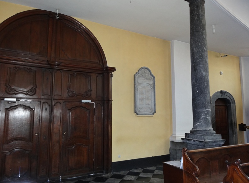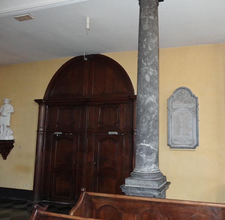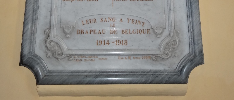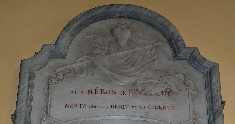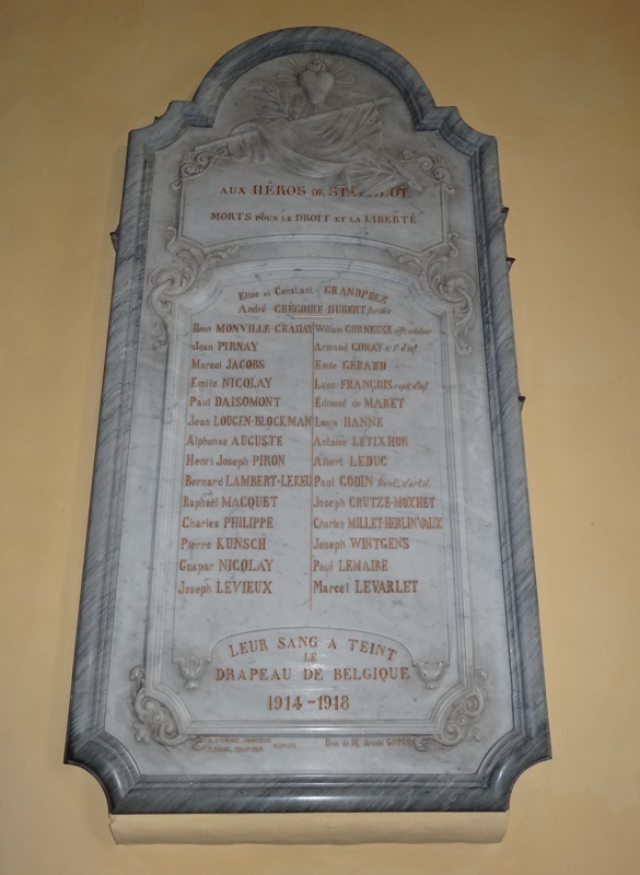 Localisation: Rue de l'Église, à l'intérieur de l'église Saint-Sébastien. Coordonnées GPS: +50°23'39.14", +5°55'44.89" Inscriptions "AUX HÉROS DE STAVELOT MORTS POUR LE DROIT ET LA LIBERTÉ [Trois noms, classés par ordre alphabétique] FUSILLÉS [Vingt-huit noms (dont certains avec grade), sur deux colonnes, non classés par ordre alphabétique] LEUR SANG A TEINT LE DRAPEAU DE BELGIQUE 1914 - 1918" Informations complémentaires: Architecte: A. VIVROUX. Sculpteur: F. HEUZE de Verviers Matériaux: marbre blanc et calcaire poli. Hauteur : 2,20 m. Cette stèle a été inaugurée en mai 1921. On peut y voir, sous un Sacré-Cœur, un drapeau et une palme sculptés en relief, dans un cartouche au contour orné avec les noms de trois fusillés et de vingt-huit militaires. D’après le quotidien "La Meuse" du 31 mai 1921, le monument a été édifié par les soins de la Ville de Stavelot. Il porte cependant en bas à droite l’inscription "Don de Mr Arnold GODIN" (Source [276]) Voir les noms gravés sur la stèle |