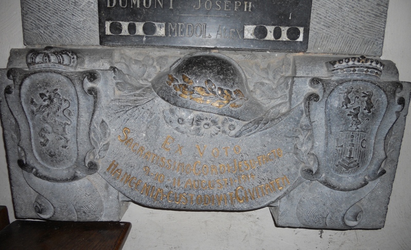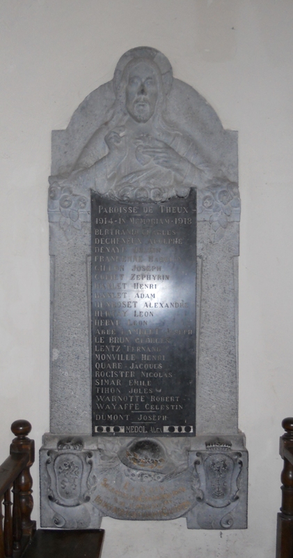 Localisation de ce monument: Église des Saints Hermes et Alexandre, rue de la Chaussée, en face du monument aux 600 Franchimontois. Coordonnées GPS: +50°32'05.44",+5°48'41.61". Inscription sur le monument "PAROISSE DE THEUX 1914 - IN MEMORIAM - 1918 [Vingt-et-un noms, classés par ordre alphabétique] [Un nom] [Un nom] EX VOTO SACRATISSIMO COR DI JESU FACTO 9-10-11 AUGUSTI 1914 HANC ENIM CUSTODIVIT CIVITATEM" Voir les noms gravés sur ce monument |