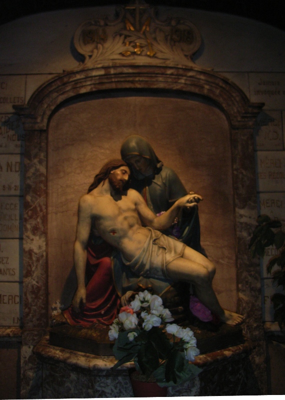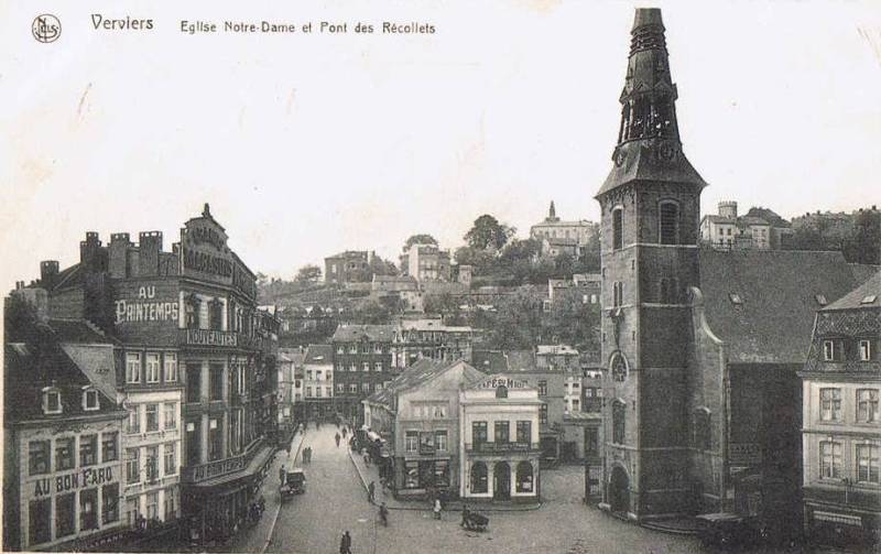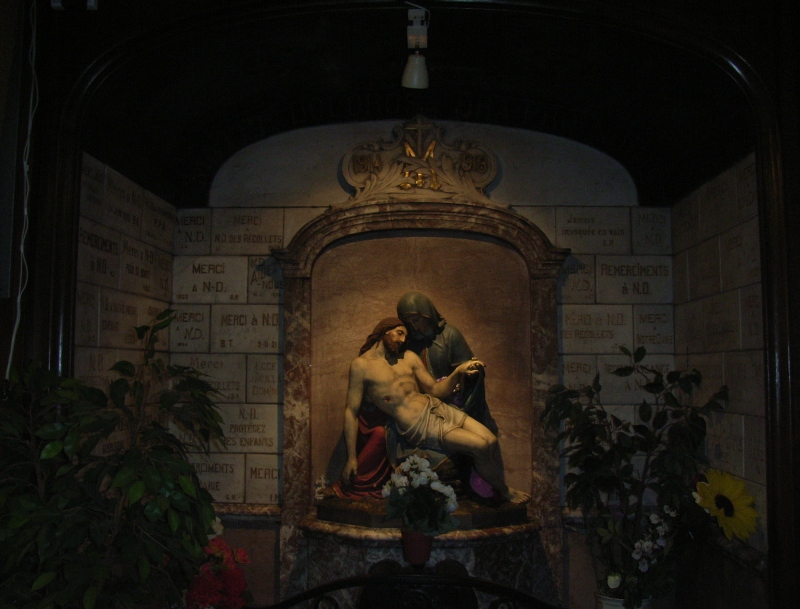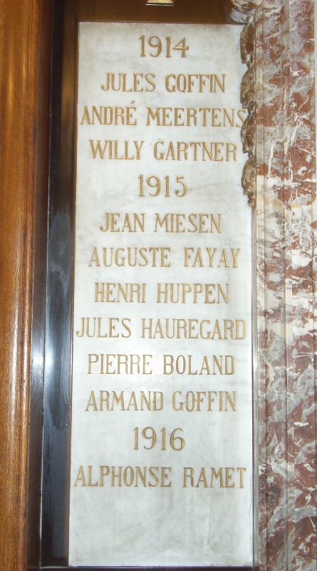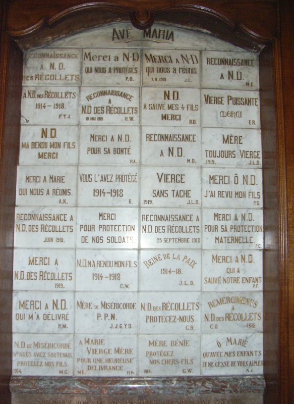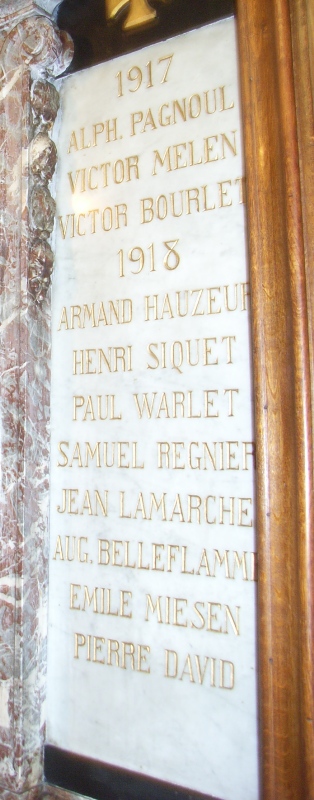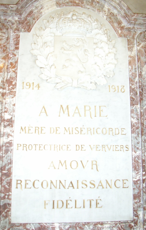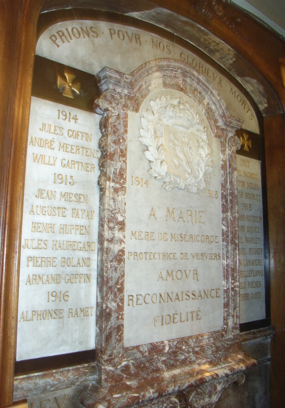 Localisation de ce mémorial: Place du Martyr, dans le narthex de l'église Notre-Dame des Récollets. Coordonnées GPS: +50°35'39.42", +5°51'32.37" Inscriptions figurant sur le mémorial Sur la plaque du dessus "PRIONS POUR NOS GLORIEUX MORTS" Sur la plaque centrale "1914 1918 À MARIE MÈRE DE MISÉRICORDE PROTECTRICE DE VERVIERS AMOUR RECONNAISSANCE FIDÉLITÉ" Sur la plaque latérale gauche "1914 [Trois noms, non classés par ordre alphabétique] 1915 [Six noms, non classés par ordre alphabétique] 1916 [Un nom]" Sur la plaque latérale droite "1917 [Trois noms, non classés par ordre alphabétique] 1918 [Huit noms, non classés par ordre alphabétique]" À la base du mémorial "DIEU PATRIE" Informations complémentaires: Le mémorial, non signé, est placé dans le narthex de l’église. Il consiste en quatre plaques de marbre blanc et quelques inserts de marbre noir, dans un encadrement de marbre rouge et de bois. La plaque centrale porte un écu couronné au lion couronné réalisé en stuc (Source [276]) On trouve également à l'intérieur de l'église un panneau avec de nombreux ex-votos de remerciement ou de reconnaissance (voir les photos ci-dessous) Voir les noms mentionnés sur ce mémorial |
