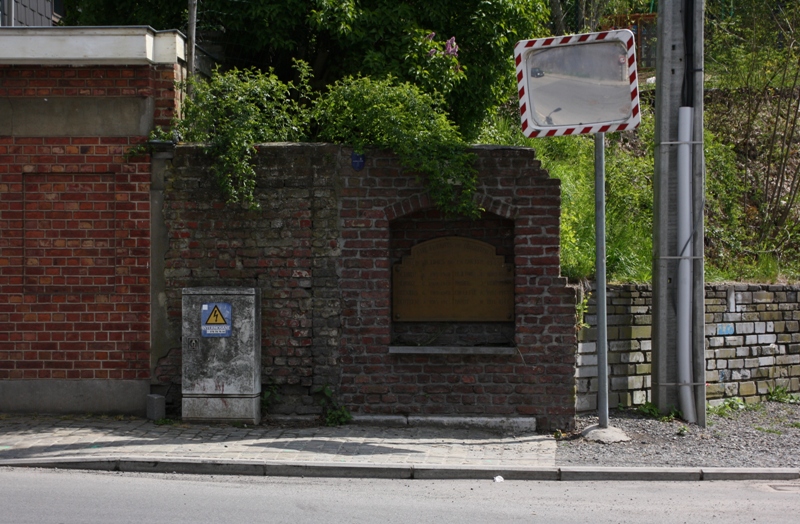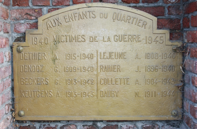 Localisation: Rue de la Cité, sur un mur de jardin, à proximité du pont de chemin de fer. Coordonnées GPS: +50°35'48.95", +5°52'43.60" Inscriptions "AUX ENFANTS DU QUARTIER 1940 VICTIMES DE LA GUERRE 1945 [Huit noms, sur deux colonnes, avec année de naissance et de décès, non classés par ordre alphabétique]" Informations complémentaires: Il s'agit donc d'une plaque commémorative pour des victimes civiles, tous habitants de cette Rue de la cité. Ils auraient été victimes soit de tirs de canons allemands, soit d'un bombardement. La mémoire hélas s'efface aussi (Source [213]) Voir les noms gravés sur la plaque |
