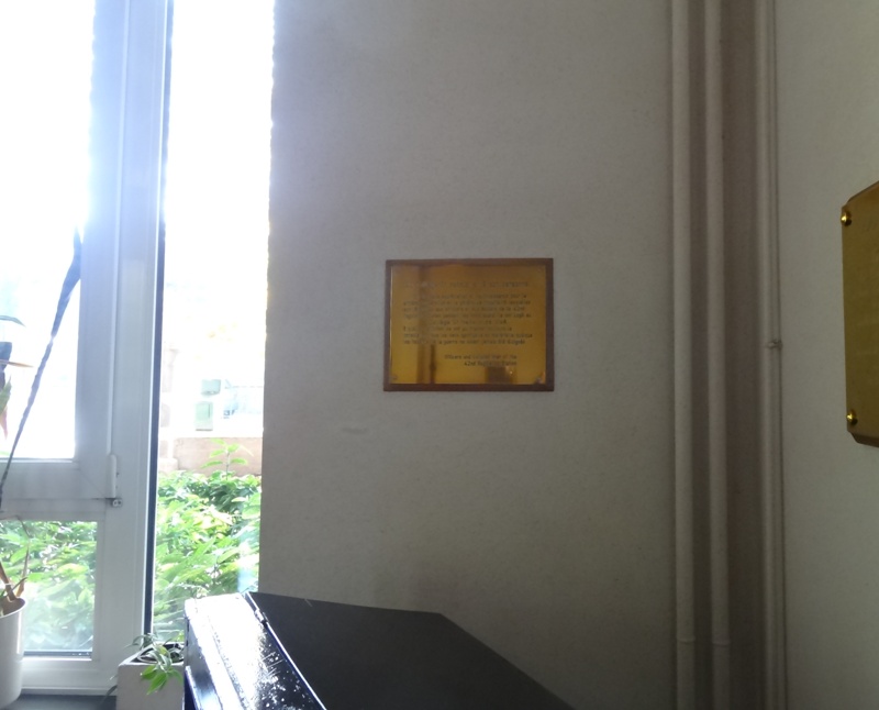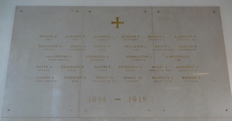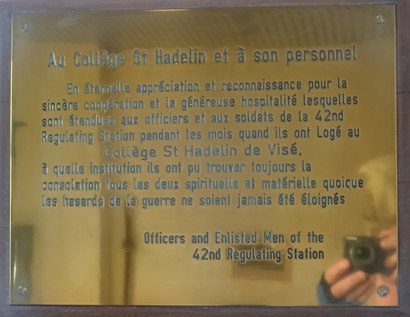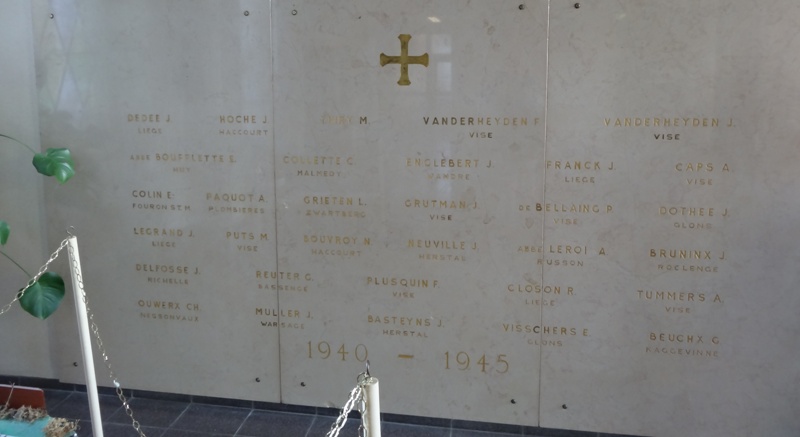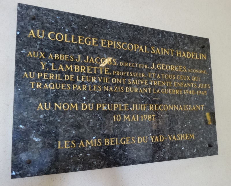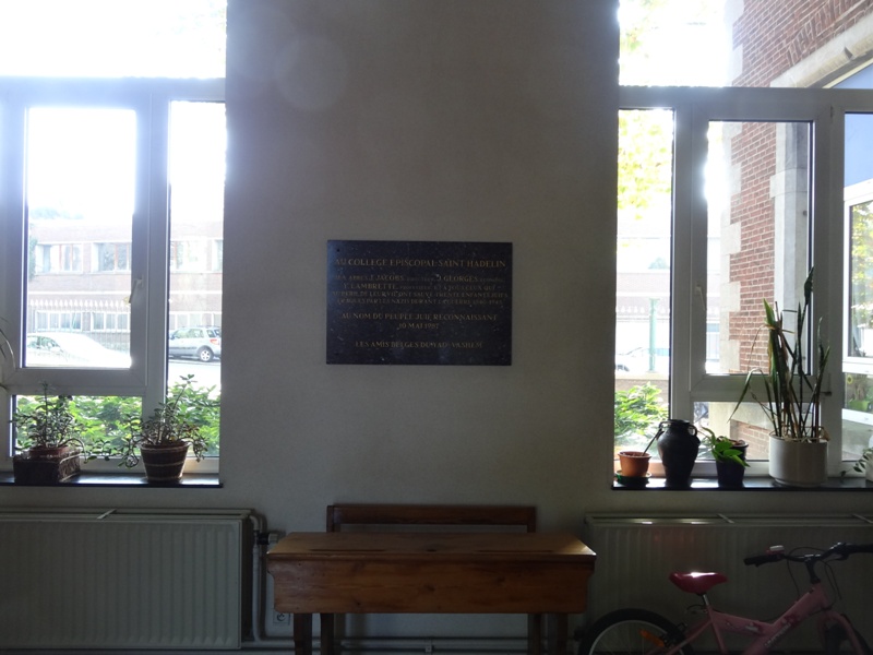 Localisation de cette stèle et de ces plaques: Rue Saint-Hadelin, dans le hall d'entrée du collège Saint-Hadelin. Coordonnées GPS: +50°44'22.14", +5°41'44.85" Inscriptions figurant sur la stèle et sur les plaques Sur la stèle "[Vingt-huit noms, sur cinq lignes, avec lieu d'origine, non classés par ordre alphabétique] 1914 - 1918 [Trente-deux noms, sur six lignes, avec lieu d'origine, non classés par ordre alphabétique] 1940 - 1945" Sur la plaque en cuivre "AU COLLÈGE ST HADELIN ET À SON PERSONNEL EN ÉTERNELLE APPRÉCIATION ET RECONNAISSANCE POUR LA SINCÈRE COOPÉRATION ET LA GÉNÉREUSE HOSPITALITÉ LESQUELLES SONT ÉTENDUES AUX OFFICIERS ET AUX SOLDATS DE LA 42ND REGULATING STATION PENDANT LES MOIS QUAND ILS ONT LOGÉ AU COLLÈGE ST HADELIN DE VISÉ, À QUELLE INSTITUTION ILS ONT PU TROUVER TOUJOURS LA CONSOLATION TOUS LES DEUX SPIRITUELLE ET MATÉRIELLE QUOIQUE LES HASARDS DE LA GUERRE NE SOIENT JAMAIS ÉTÉ ÉLOIGNÉS OFFICERS AND ENLISTED MEN OF THE 42ND REGULATING STATION" Sur la plaque marbrée "AU COLLÈGE ÉPISCOPAL SAINT HADELIN AUX ABBÉS J.JACOBS, DIRECTEUR, J.GEORGES, ÉCONOME Y.LAMBRETTE, PROFESSEUR ET À TOUS CEUX QUI AU PÉRIL DE LEUR VIE ONT SAUVÉ TRENTE ENFANTS JUIFS TRAQUÉS PAR LES NAZIS DURANT LA GUERRE 1940-1945 AU NOM DU PEUPLE JUIF RECONNAISSANT 10 MAI 1987 LES AMIS BELGES DU YAD-VASHEM" Voir les noms mentionnés sur cette stèle |