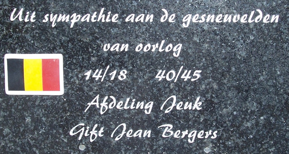Ligging: Kruising Houtstraat en Bloemenstraat. GPS-coördinaten: +50°44'05.87", +5°12'35.06" Opschriften Voorkant "AAN ONZE HELDEN GEVALLEN VOOR HET VADERLAND 1914 - 1918 GEVALLEN OP HET VELD VAN EER [Zeven namen van slachtoffers W.O. I, niet alfabetisch gerangschikt] 1940 - 1945 [Drie namen, niet alfabetisch gerangschikt]" Gedenkplaat "UIT SYMPATHIE AAN DE GESNEUVELDEN VAN OORLOG 14/18 40/45 AFDELING JEUK GIFT JEAN BERGERS" Rechterkant "[Dertien namen, alfabetisch gerangschikt]" Linkerkant "[Dertien namen, alfabetisch gerangschikt]" Achterkant "[Veertien namen, alfabetisch gerangschikt]" Zie namen op het gedenkteken |