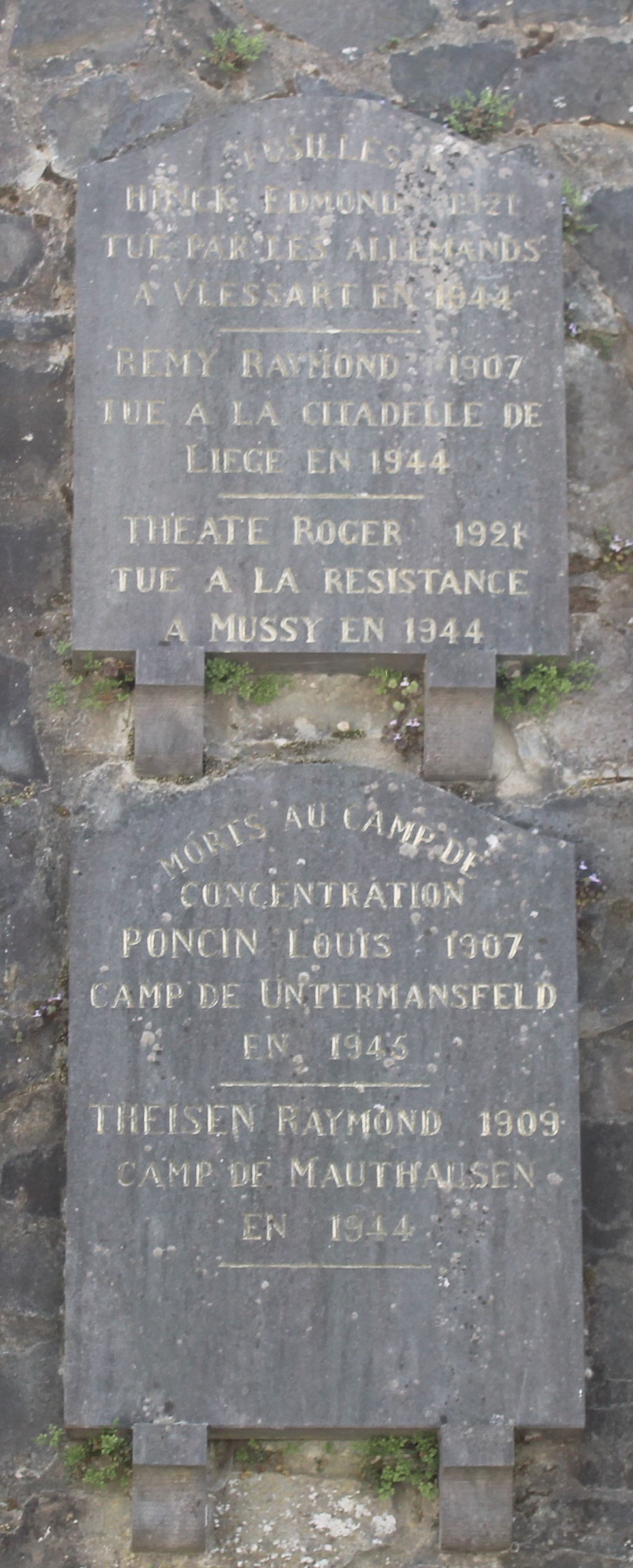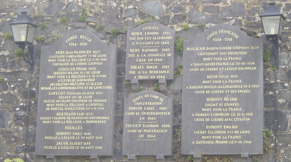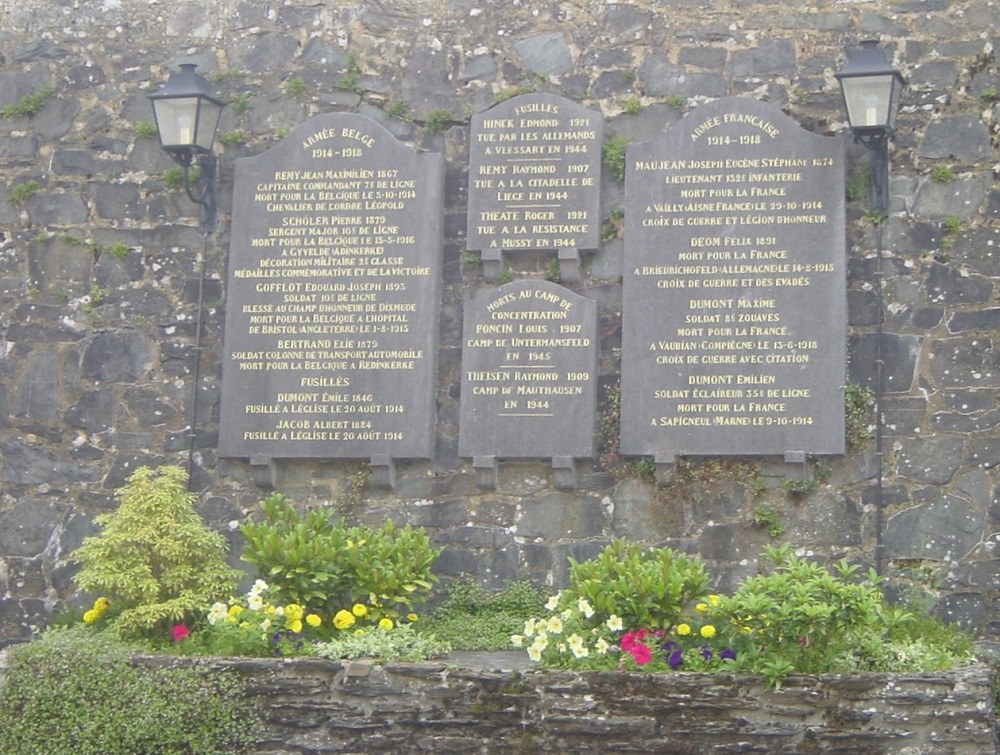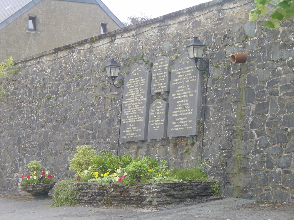 Localisation: Deux plaques en granit gris adossées au mur de soutènement du cimetière le long de la rue de Maou. Jusqu'en 1993, ces plaques étaient apposées sur la façade de l'ancienne maison communale. Coordonnées GPS: +49° 46' 15.95", +5° 37' 11.20". Inscriptions figurant sur le monument Panneau gauche "ARMÉE BELGE 1914 - 1918 [MORTS POUR LA BELGIQUE] [Quatre noms] FUSILLÉS [Deux noms]" Panneaux centraux Panneau supérieur "FUSILLÉS [1940 - 1945] [Trois noms]" Panneau inférieur "MORTS AU CAMP DE / CONCENTRATION [Deux noms] Panneau droit "ARMÉE FRANÇAISE 1914 - 1918 [Quatre noms]" Inauguration: 11 novembre1924 (Source [13]) Voir les noms mentionnés sur ce monument |