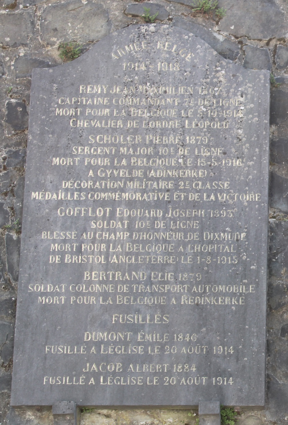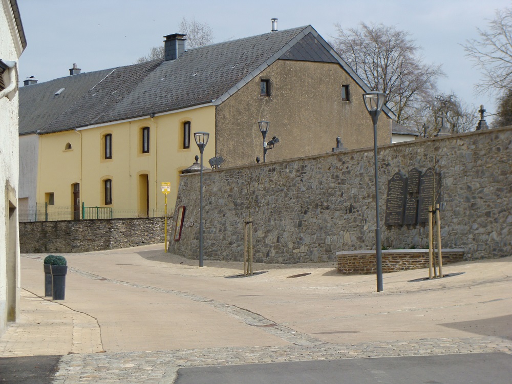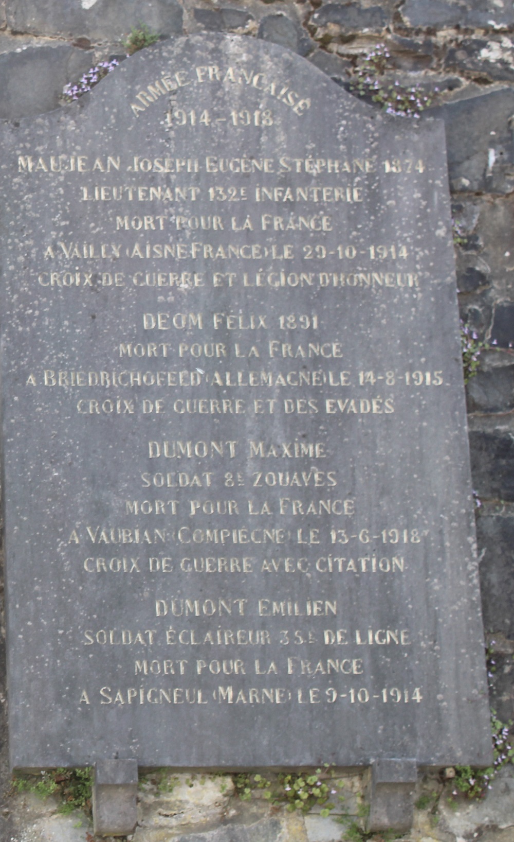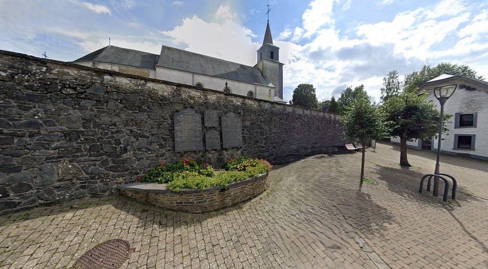 Localisation: Deux plaques en granit gris adossées au mur de soutènement du cimetière le long de la rue de Maou. Jusqu'en 1993, ces plaques étaient apposées sur la façade de l'ancienne maison communale. Coordonnées GPS: +49° 46' 15.95", +5° 37' 11.20". Inscriptions figurant sur le monument Panneau gauche "ARMÉE BELGE 1914 - 1918 [MORTS POUR LA BELGIQUE] [Quatre noms] FUSILLÉS [Deux noms]" Panneaux centraux Panneau supérieur "FUSILLÉS [1940 - 1945] [Trois noms]" Panneau inférieur "MORTS AU CAMP DE / CONCENTRATION [Deux noms] Panneau droit "ARMÉE FRANÇAISE 1914 - 1918 [Quatre noms]" Inauguration: 11 novembre1924 (Source [13]) Voir les noms mentionnés sur ce monument |
