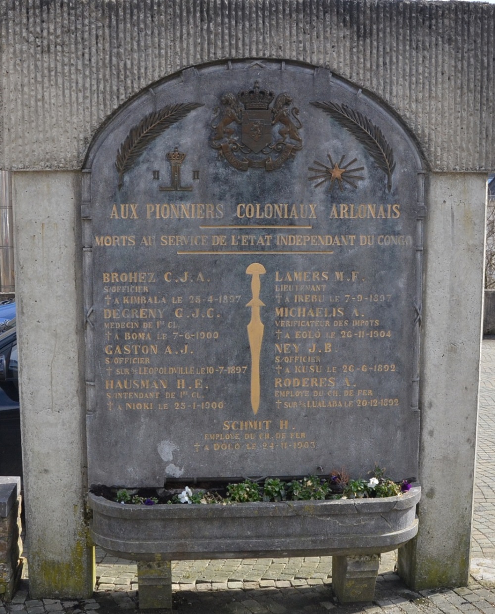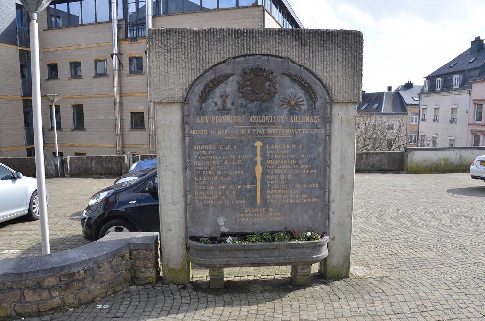 Localisation: Dans le parking situé derrière l'extension de l'hôtel de ville, à l'intersection des rues des Carmes et du Marquisat. Coordonnées GPS: +49°41'01.6", +5°48'59.9" Inscriptions "[Armoiries du Congo belge avec devise "Travail et progrès"] [Monogramme du roi Léopold II] [Étoile du Congo ( ? )] AUX PIONNIERS COLONIAUX ARLONAIS MORTS AU SERVICE DE L'ÉTAT INDÉPENDANT DU CONGO [Neuf noms, classés par ordre alphabétique, avec mention du grade ou statut ainsi que de la date et du lieu de décès" Réalisation : 1931. Voir les noms gravés sur le monument |