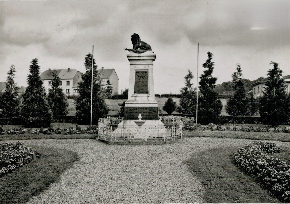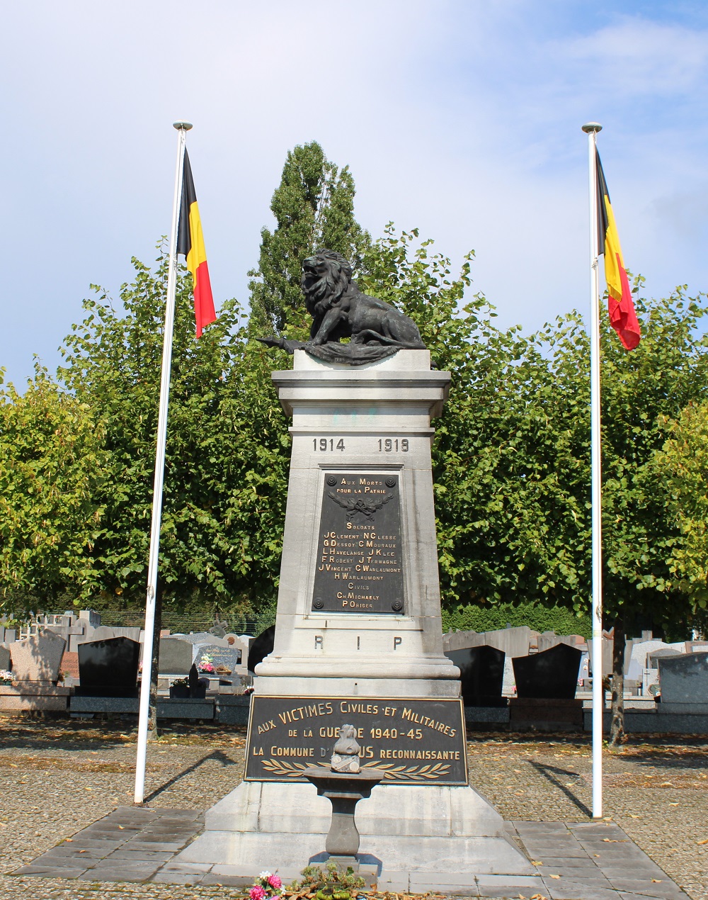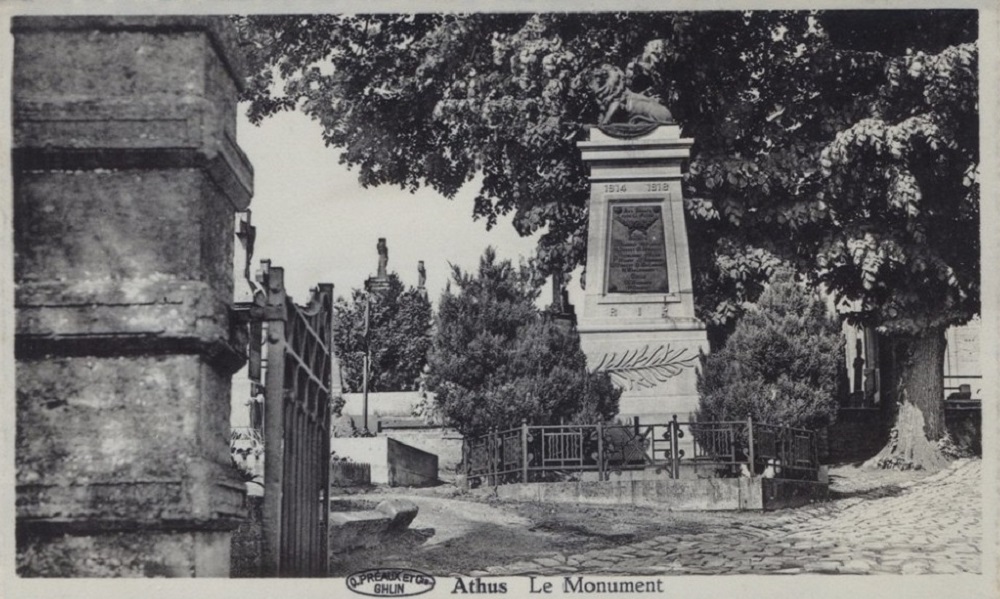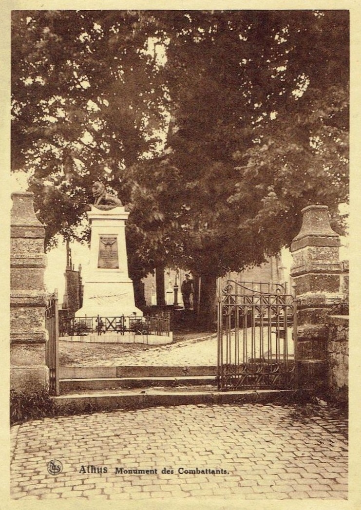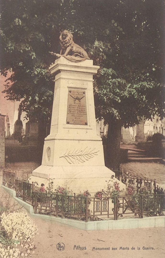 Localisation: Cimetière communal d'Athus, situé à l'arrière de l'Église, rue de l'Église, n° 5. Coordonnées GPS: +49°33'54.8", +5°50'10.8" Inscriptions "[Statue représentant un lion rugissant dressé sur le drapeau belge renversé] 1914 - 1918 AUX MORTS POUR LA PATRIE SOLDATS [Onze noms, classés par ordre alphabétique, avec une exception] CIVILS [Deux noms, classés par ordre alphabétique] R. I. P. AUX VICTIMES CIVILES ET MILITAIRES DE LA GUERRE 1940-45 LA COMMUNE D'ATHUS RECONNAISSANTE" [La pelouse d'honneur compte 54 tombes de victimes de guerre et d'anciens combattants; une tombe comporte trois noms de soldats russes morts pendant la Première Guerre Mondiale. Une quinzaine de noms n'ont pas pu être enregistrés dans la base de données vu l'absence de photos des tombes correspondantes; en principe, il s'agit d'anciens combattants.] Informations complémentaires Ce monument n'a pas toujours été à son emplacement actuel. Comme on peut le constater sur les cartes postales anciennes présentées en bas de page, il était au départ installé sous un bouquet de tilleuls à une vingtaine de mètres en avant de l’église. À l'emplacement originel du monument, on trouve aujourd'hui une croix de chemin datant de 1727 (Source: Syndicat d'initiative d'Aubange). Voir les noms inscrits sur le monument et les tombes individuelles |