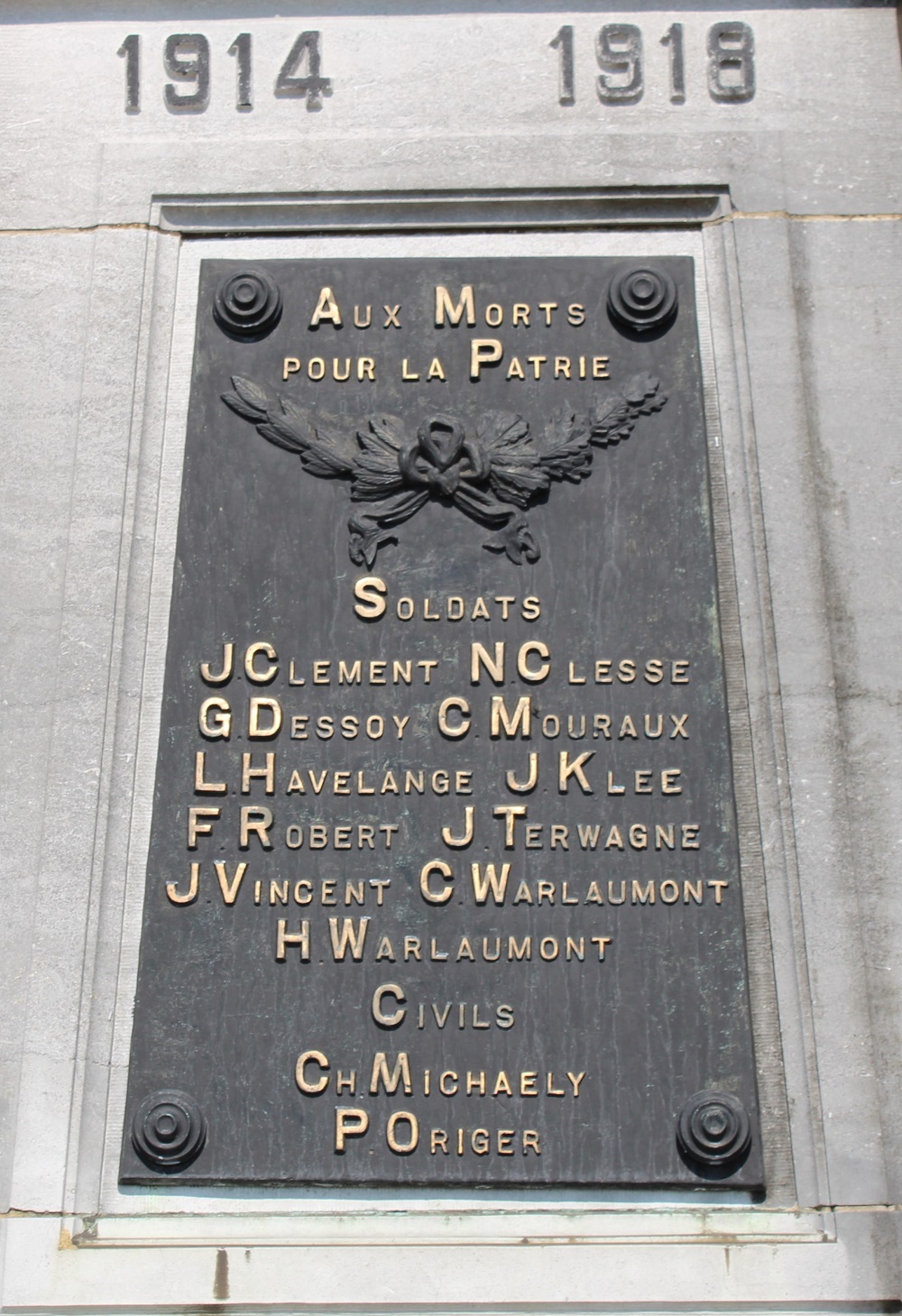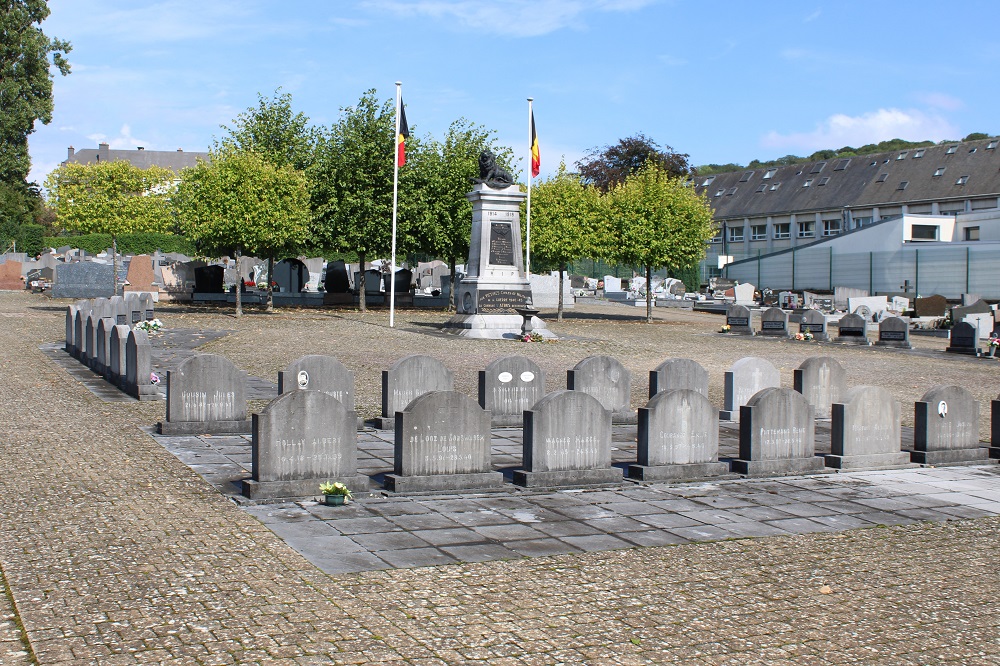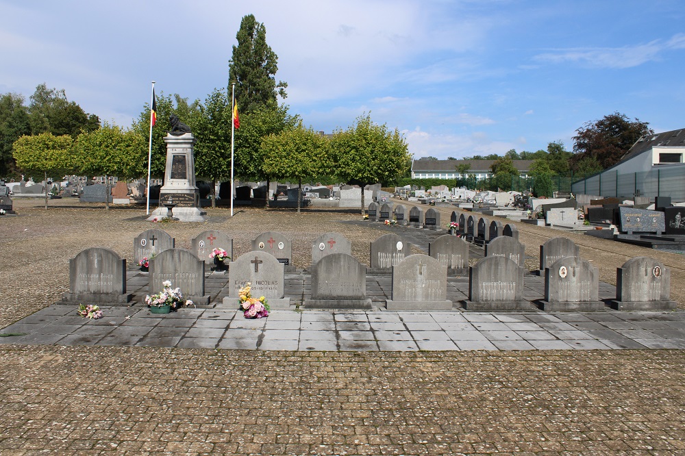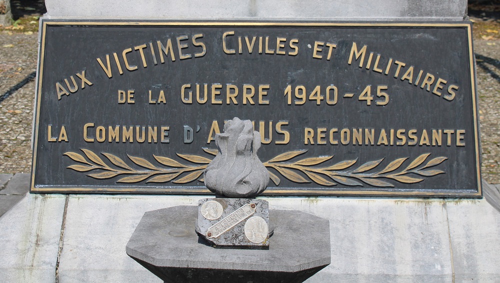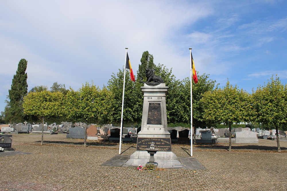 Localisation: Cimetière communal d'Athus, situé à l'arrière de l'Église, rue de l'Église, n° 5. Coordonnées GPS: +49°33'54.8", +5°50'10.8" Inscriptions "[Statue représentant un lion rugissant dressé sur le drapeau belge renversé] 1914 - 1918 AUX MORTS POUR LA PATRIE SOLDATS [Onze noms, classés par ordre alphabétique, avec une exception] CIVILS [Deux noms, classés par ordre alphabétique] R. I. P. AUX VICTIMES CIVILES ET MILITAIRES DE LA GUERRE 1940-45 LA COMMUNE D'ATHUS RECONNAISSANTE" [La pelouse d'honneur compte 54 tombes de victimes de guerre et d'anciens combattants; une tombe comporte trois noms de soldats russes morts pendant la Première Guerre Mondiale. Une quinzaine de noms n'ont pas pu être enregistrés dans la base de données vu l'absence de photos des tombes correspondantes; en principe, il s'agit d'anciens combattants.] Informations complémentaires Ce monument n'a pas toujours été à son emplacement actuel. Comme on peut le constater sur les cartes postales anciennes présentées en bas de page, il était au départ installé sous un bouquet de tilleuls à une vingtaine de mètres en avant de l’église. À l'emplacement originel du monument, on trouve aujourd'hui une croix de chemin datant de 1727 (Source: Syndicat d'initiative d'Aubange). Voir les noms inscrits sur le monument et les tombes individuelles |