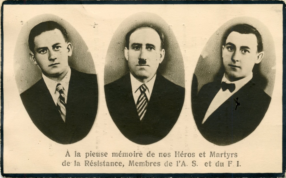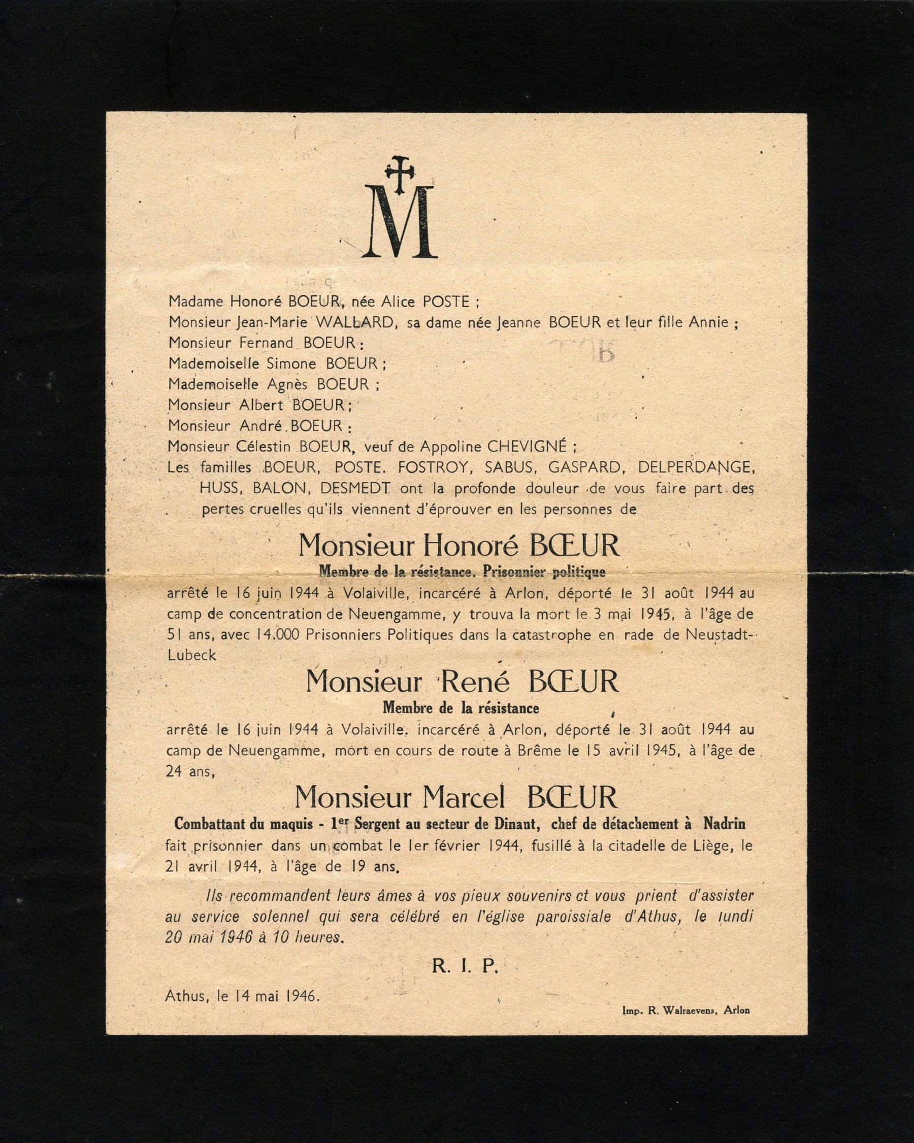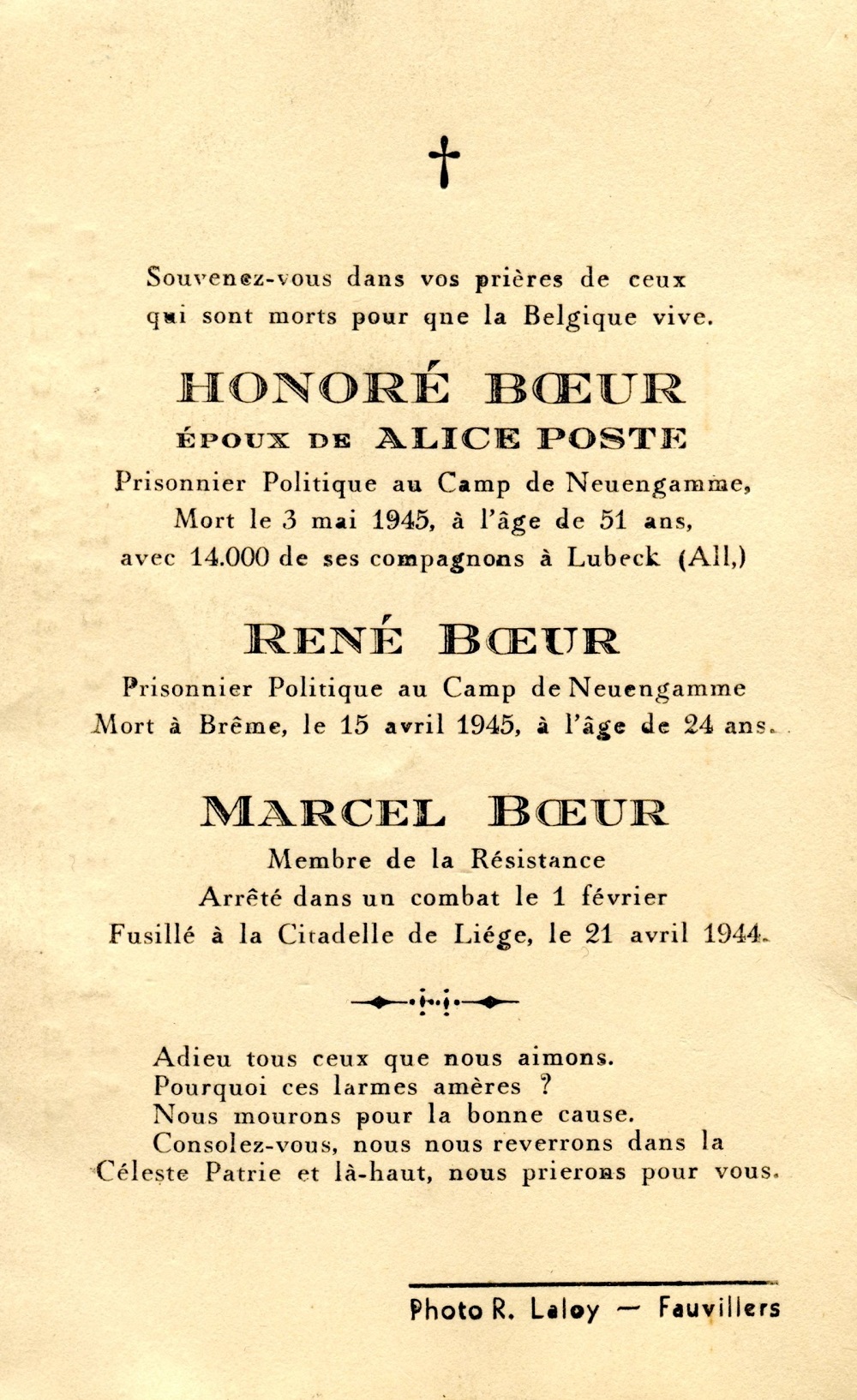Localisation: Source [517]. Inscriptions Souvenir pieux Recto "[Trois photos, de gauche à droite Marcel BOEUR, Honoré BOEUR et René BOEUR] À LA PIEUSE MÉMOIRE DE NOS HÉROS ET MARTYRS DE LA RÉSISTANCE, MEMBRES DE L'A.S. ET DU F.I." Verso "SOUVENEZ-VOUS DANS VOS PRIÈRES DE CEUX QUI SONT MORTS POUR QUE LA BELGIQUE VIVE. HONORÉ BŒUR ÉPOUX DE ALICE POSTE PRISONNIER POLITIQUE AU CAMP DE NEUENGAMME, MORT LE 3 MAI 1945, À L'ÂGE DE 51 ANS, AVEC 14.000 DE SES COMPAGNONS À LÜBECK (ALL.) RENÉ BŒUR PRISONNIER POLITIQUE AU CAMP DE NEUENGAMME MORT À BRÊME, LE 15 AVRIL 1945, À L'ÂGE DE 24 ANS. MARCEL BŒUR MEMBRE DE LA RÉSISTANCE ARRÊTÉ DANS UN COMBAT LE 1 FÉVRIER FUSILLÉ À LA CITADELLE DE LIÈGE, LE 21 AVRIL 1944. ADIEU TOUS CEUX QUE NOUS AIMONS. POURQUOI CES LARMES AMÈRES ? NOUS MOURONS POUR LA BONNE CAUSE. CONSOLEZ-VOUS, NOUS NOUS REVERRONS DANS LA CÉLESTE PATRIE ET LÀ-HAUT, NOUS PRIERONS POUR VOUS." Faire-part de décès "[Voir scan ci-dessous] MONSIEUR HONORÉ BŒUR MEMBRE DE LA RÉSISTANCE. PRISONNIER POLITIQUE ARRÊTÉ LE 16 JUIN 1944 À VOLAIVILLE, INCARCÉRÉ À ARLON, DÉPORTÉ LE 31 AOÛT 1944 AU CAMP DE CONCENTRATION DE NEUENGAMME, Y TROUVA LA MORT LE 3 MAI 1945, À L'ÂGE DE 51 ANS, AVEC 14.000 PRISONNIERS POLITIQUES DANS LA CATASTROPHE EN RADE DE NEUSTADT- LÜBECK MONSIEUR RENÉ BŒUR MEMBRE DE LA RÉSISTANCE ARRÊTÉ LE 16 JUIN 1944 À VOLAIVILLE, INCARCÉRÉ À ARLON, DÉPORTÉ LE 31 AOÛT 1944 AU CAMP DE NEUENGAMME, MORT EN COURS DE ROUTE À BRÊME LE 15 AVRIL 1945, À L'ÂGE DE 24 ANS, MONSIEUR MARCEL BŒUR COMBATTANT DU MAQUIS - 1ER SERGENT AU SECTEUR DE DINANT, CHEF DE DÉTACHEMENT À NADRIN FAIT PRISONNIER DANS UN COMBAT LE 1ER FÉVRIER 1944, FUSILLÉ À LA CITADELLE DE LIÈGE, LE 21 AVRIL 1944, À L'ÂGE DE 19 ANS. [Voir scan ci-dessous]" Plus d'informations concernant ces victimes |