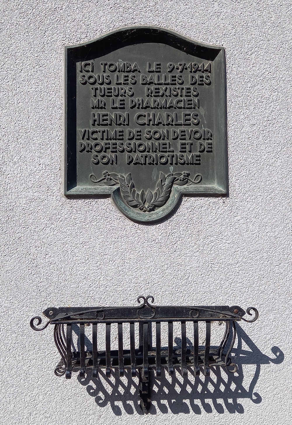 Localisation: Grand-Rue, n° 22. Coordonnées GPS: +49°47'43.8", +5°04'10.2" Inscriptions "ICI TOMBA LE 9-7-1944 SOUS LES BALLES DES TUEURS REXISTES MR LE PHARMACIEN HENRI CHARLES VICTIME DE SON DEVOIR PROFESSIONNEL ET DE SON PATRIOTISMES" Plus d'informations concernant cette victime |