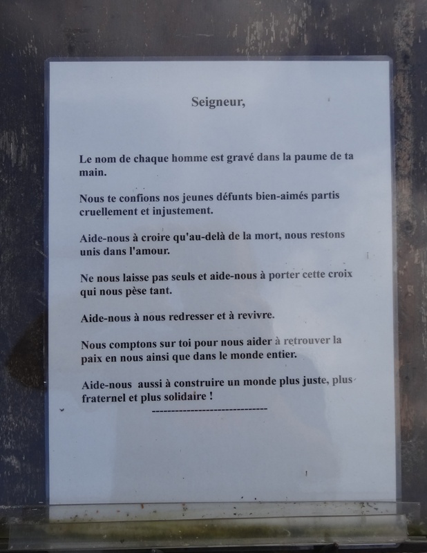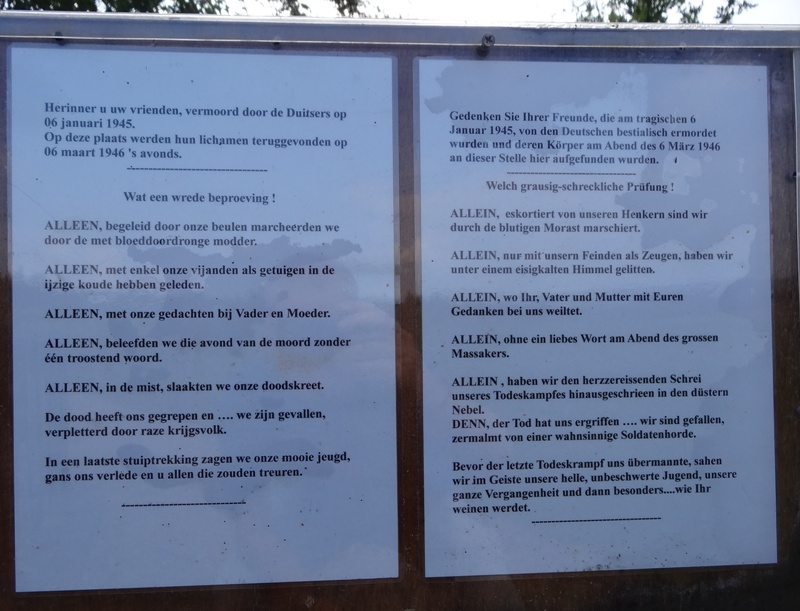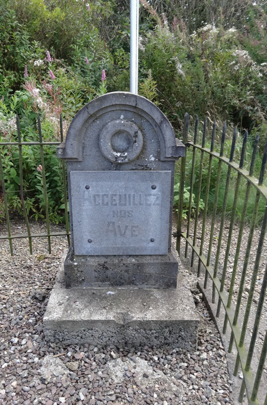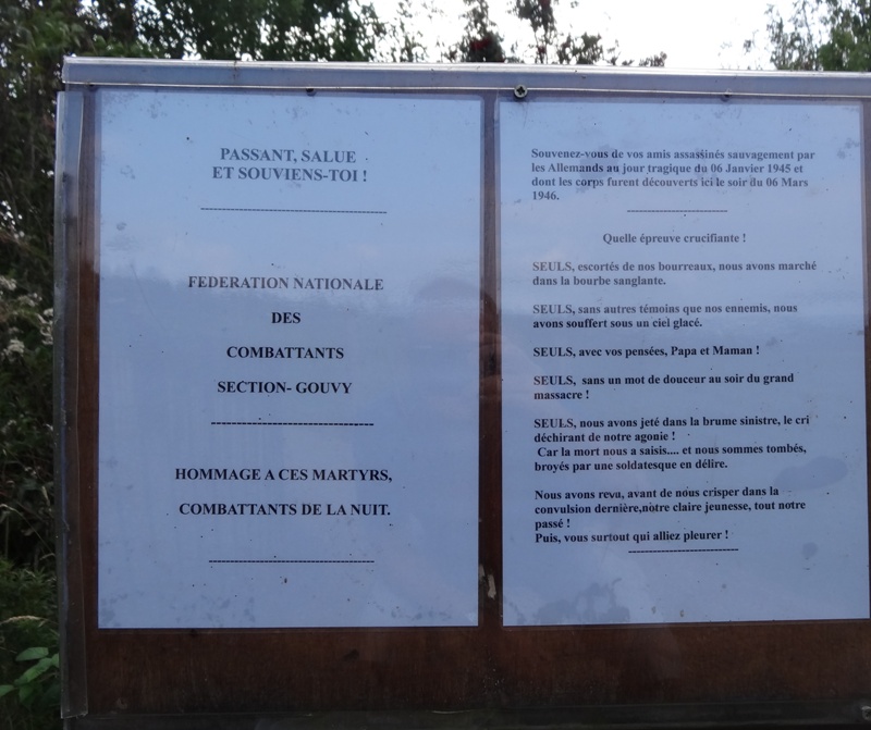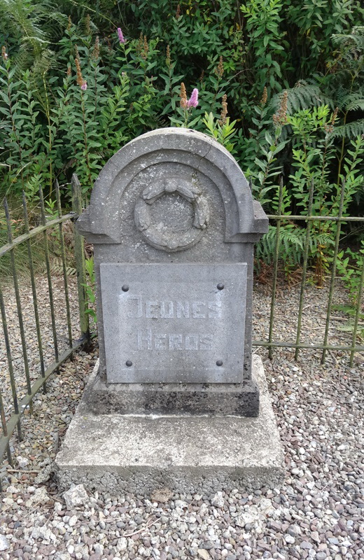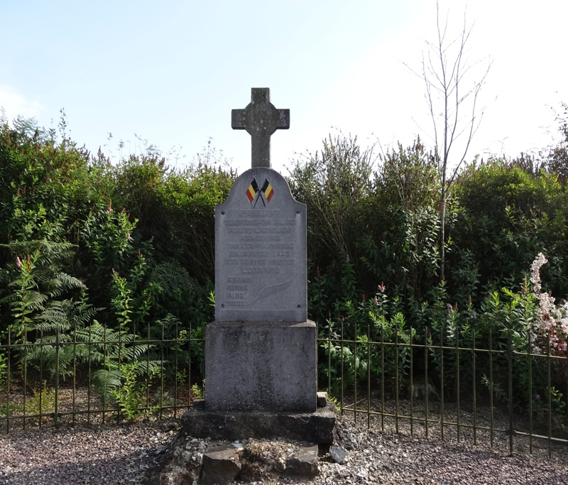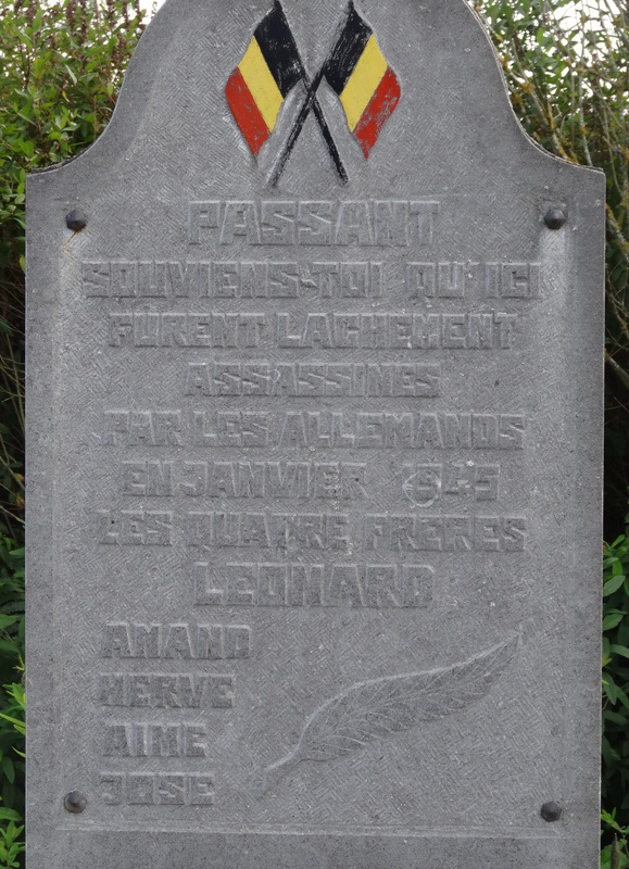 Localisation: À proximité de la frontière luxembourgeoise, Rue de la Grotte, à l'orée d'un petit bois de sapins, à l'endroit même où l'on retrouva leurs corps Coordonnées GPS: +50°10'06.24", +5°57'42.44" Inscriptions Sur la pierre de gauche "JEUNES HÉROS" Sur la pierre centrale "PASSANT SOUVIENS-TOI QU'ICI FURENT LÂCHEMENT ASSASSINÉS PAR LES ALLEMANDS EN JANVIER 1945 LES QUATRE FRÈRES LÉONARD AMAND HERVÉ AIMÉ JOSÉ" Sur la pierre de droite "ACCUEILLEZ NOS AVE" Informations complémentaires: C'est à l'orée d'un petit bois de sapins qu'un monument commémoratif a été dressé à l'endroit même où l'on retrouva les corps des frères Léonard, quatre jeunes résistants exécutés, sur ordre du dirigeant fasciste Léon Degrelle, à la fin de la seconde guerre mondiale (Source: Geocaching) Remarque: à noter la faute d'orthographe sur la pierre de droite où l'on a écrit "acceuillez" au lieu de "accueillez" ! Plus d'informations concernant ces personnes |