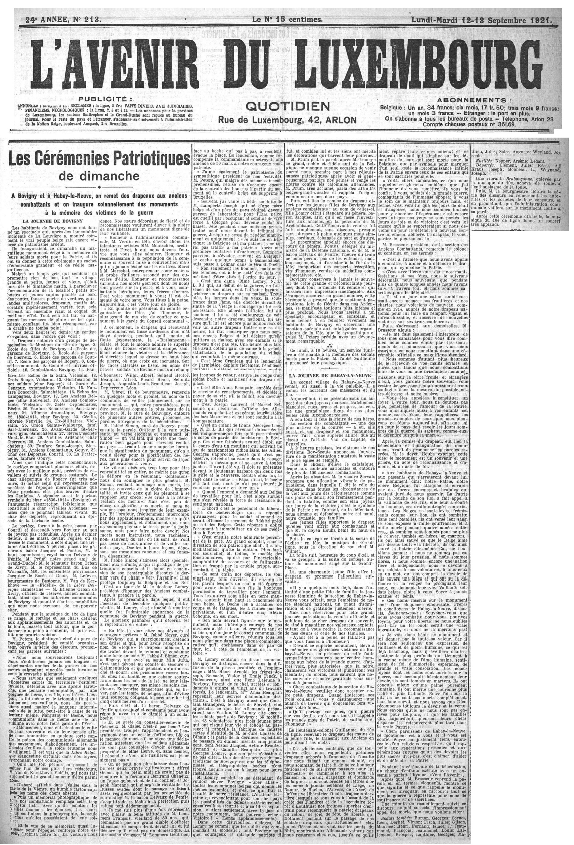 "L'Avenir du Luxembourg" daté des 12 et 13 septembre