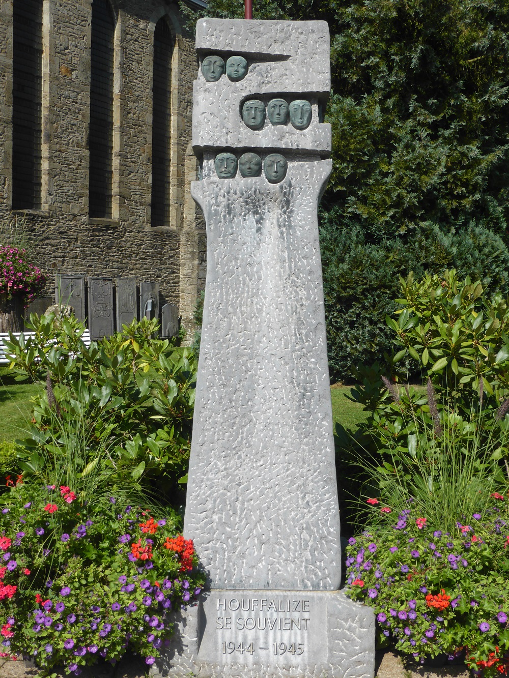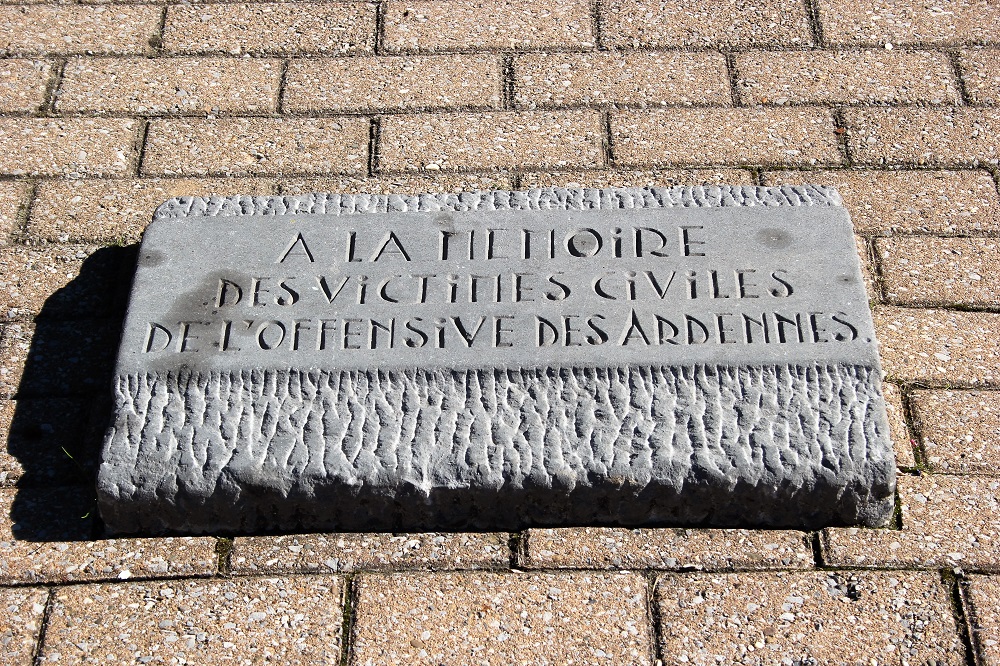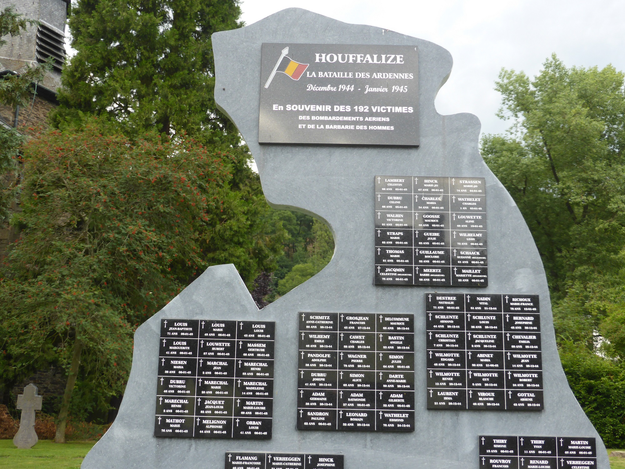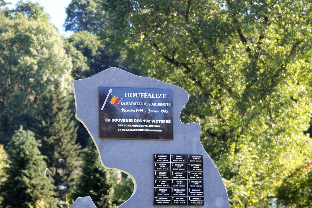 Localisation : Cour de l'Abbaye, dans le parc situé à la droite de l'entrée de l'église Sainte-Catherine. Coordonnées GPS : +50°07'59.5", +5°47'19.9" Inscriptions Pierre au sol devant le monument "À LA MÉMOIRE DES VICTIMES CIVILES DE L'OFFENSIVE DES ARDENNES" Sur le socle du monument "HOUFFALIZE SE SOUVIENT 1944 - 1945". Inauguration : Janvier 1985. Monument portant les noms des victimes "HOUFFALIZE LA BATAILLE DES ARDENNES DÉCEMBRE 1944 - JANVIER 1945 EN SOUVENIR DES 192 VICTIMES DES BOMBARDEMENTS AÉRIENS ET DE LA BARBARIE DES HOMMES [189 noms, non classés par ordre alphabétique ni chronologique, avec mention de la date de décès et de l'âge au décès]" Suggestions de lecture - Houffalize se souvient... Décembre 1944 - Janvier 1945 - La prémonition de l'officier allemand - Le poème de Jean KOBS - Comment appeler cette tranche de l'histoire - La RAF, lâcheur de bombes - Houffalize avec un H comme Hiroshima Voir les noms des victimes |