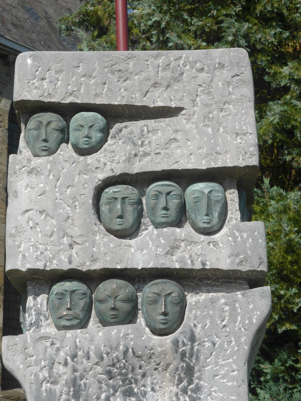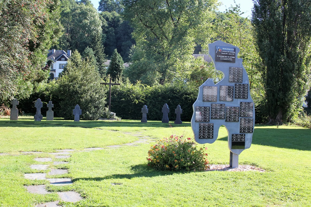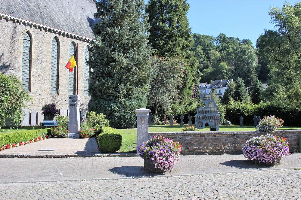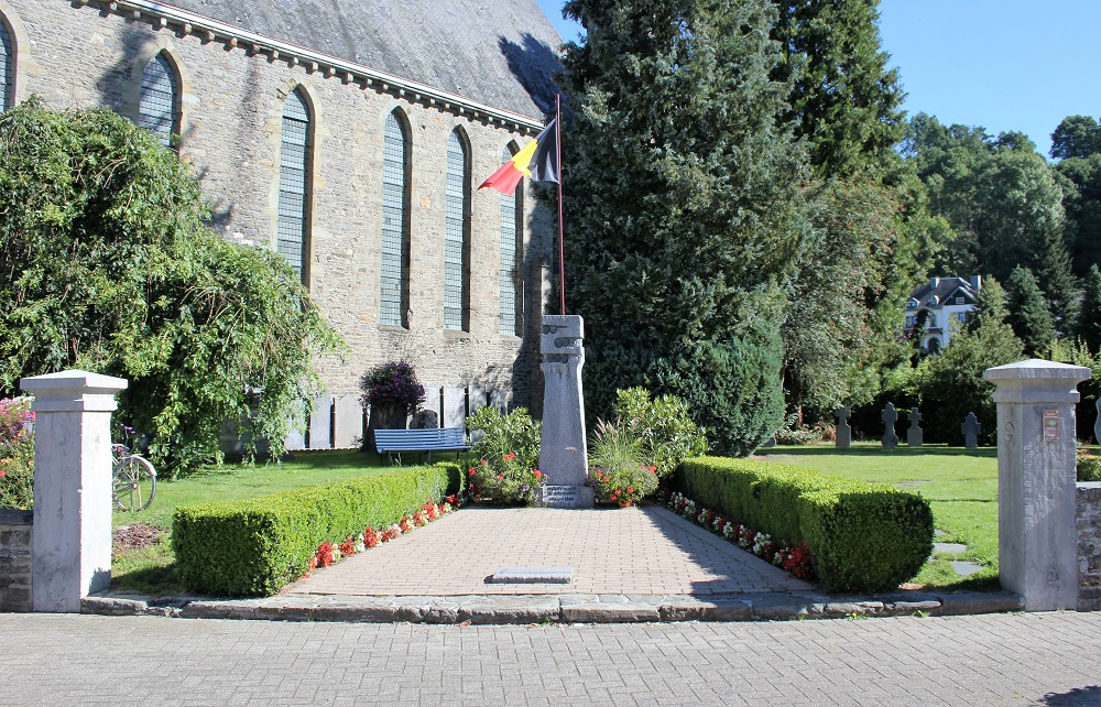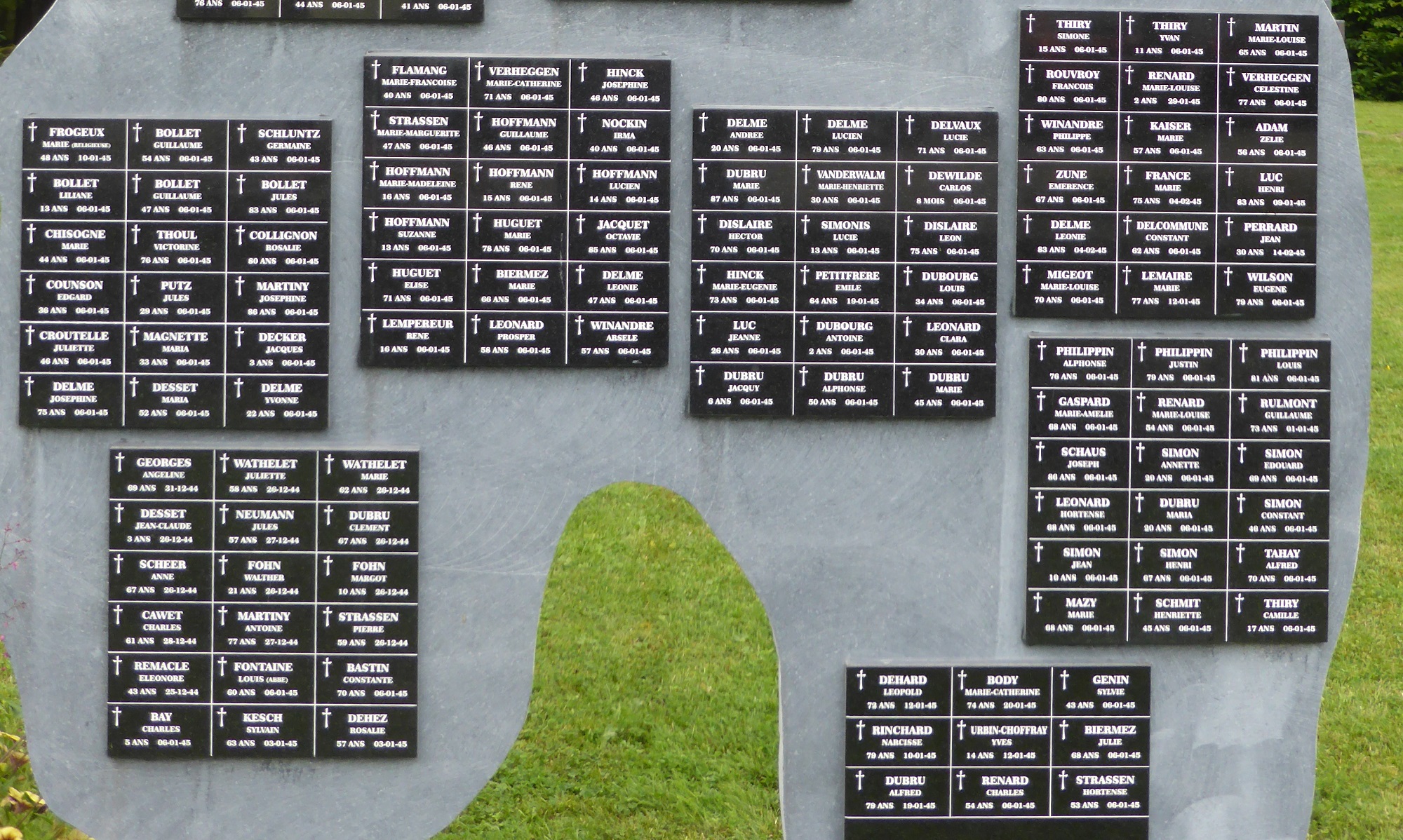 Localisation : Cour de l'Abbaye, dans le parc situé à la droite de l'entrée de l'église Sainte-Catherine. Coordonnées GPS : +50°07'59.5", +5°47'19.9" Inscriptions Pierre au sol devant le monument "À LA MÉMOIRE DES VICTIMES CIVILES DE L'OFFENSIVE DES ARDENNES" Sur le socle du monument "HOUFFALIZE SE SOUVIENT 1944 - 1945". Inauguration : Janvier 1985. Monument portant les noms des victimes "HOUFFALIZE LA BATAILLE DES ARDENNES DÉCEMBRE 1944 - JANVIER 1945 EN SOUVENIR DES 192 VICTIMES DES BOMBARDEMENTS AÉRIENS ET DE LA BARBARIE DES HOMMES [189 noms, non classés par ordre alphabétique ni chronologique, avec mention de la date de décès et de l'âge au décès]" Suggestions de lecture - Houffalize se souvient... Décembre 1944 - Janvier 1945 - La prémonition de l'officier allemand - Le poème de Jean KOBS - Comment appeler cette tranche de l'histoire - La RAF, lâcheur de bombes - Houffalize avec un H comme Hiroshima Voir les noms des victimes |