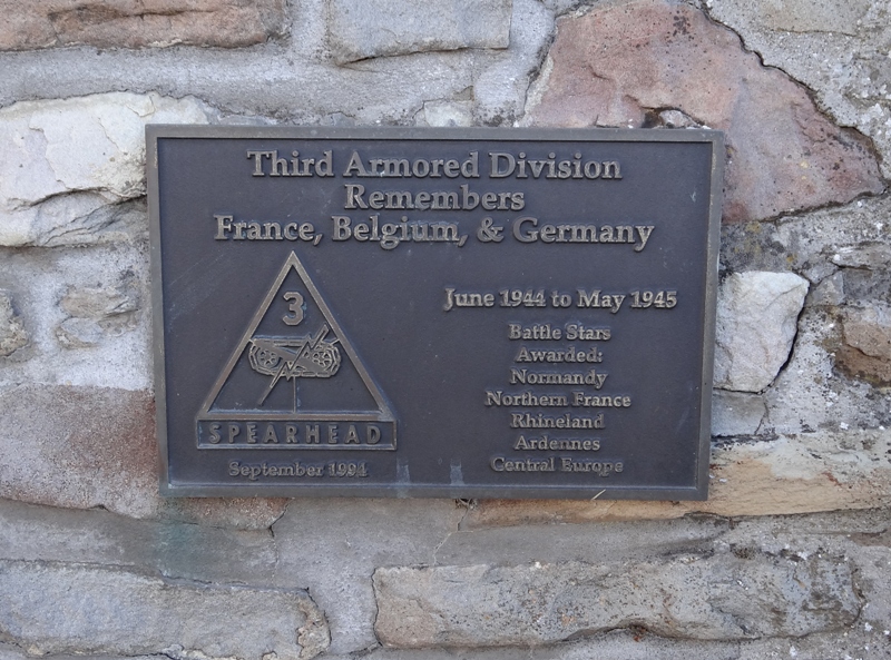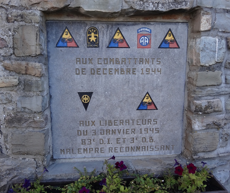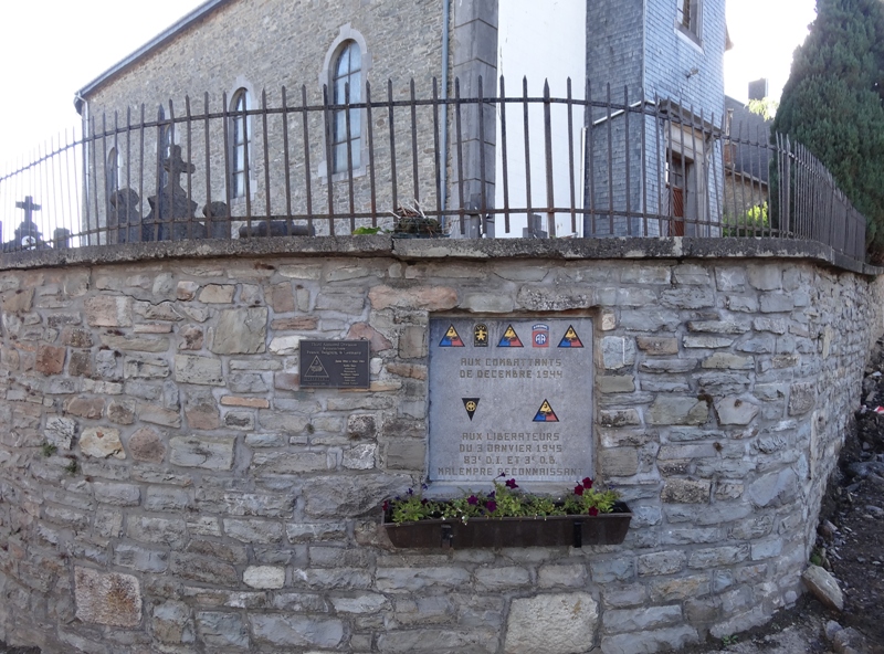 Localisation de ces plaques: À l'angle de la Rue Saint-Martin, et de la Rue des Thuyas, sur le mur d'enceinte du cimetière entourant l'église Saint-Martin. Coordonnées GPS: +50°16'52.41", +5°42'57.36" Inscription figurant sur les stèles Plaque principale "[Cinq écussons d'unités de l'armée américaine] AUX COMBATTANTS DE DÉCEMBRE 1944 [Deux écussons d'unités de l'armée américaine] AUX LIBÉRATEURS DU 3 JANVIER 1945 83E D.I. ET 3E D.B. MALEMPRÉ RECONNAISSANT" Petite plaque sur la gauche "THIRD ARMORED DIVISION REMEMBERS FRANCE, BELGIUM, & GERMANY JUNE 1944 TO MAY 1945 BATTLE STARS AWARDED: NORMANDY NORTHERN FRANCE RHINELAND ARDENNES CENTRAL EUROPE 3 SPEARHEAD SEPTEMBER 1994" Ce monument ne comporte pas de noms. |