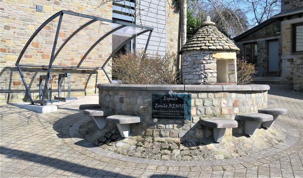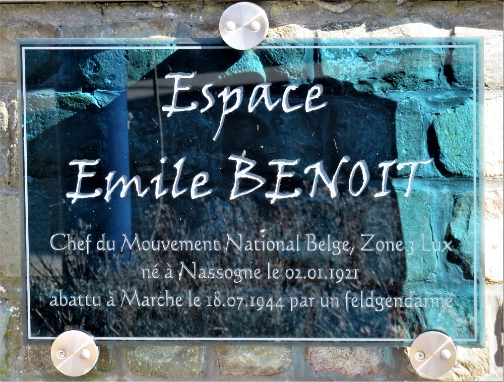 Localisation: Rue de Lahaut, devant le centre culturel de Nassogne. Coordonnées GPS: +50°07'42.9", +5°20'35.5" Inscriptions "ESPACE EMILE BENOIT CHEF DU MOUVEMENT NATIONAL BELGE, ZONE LUX NÉ À NASSOGNE LE 02.01.1921 ABATTU À MARCHE LE 18.07.1944 PAR UN FELDGENDARME" Plus d'informations concernant cette victime |