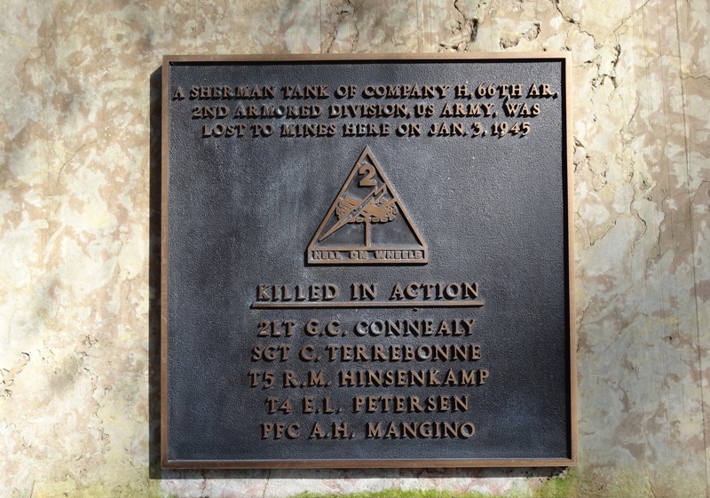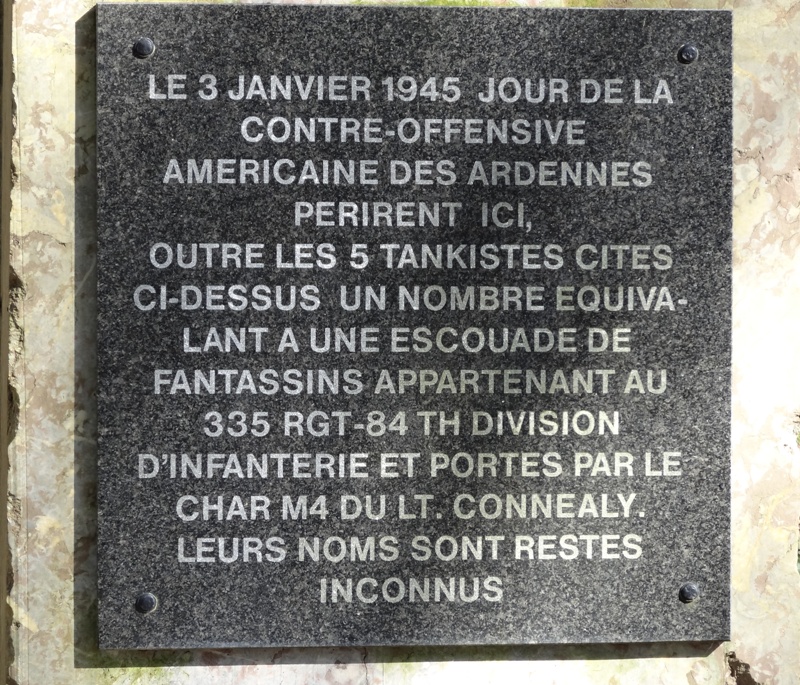 Localisation de ce monument: Rue de l'Isbelle (route reliant Hotton à Mélines). Coordonnées GPS: +50°16'41.92", +5°29'28.60" Inscriptions figurant sur le monument Plaque supérieure "A SHERMAN TANK OF COMPANY H, 66TH AR, 2ND ARMORED DIVISION, US ARMY, WAS LOST TO MINES HERE ON JAN. 3, 1945 KILLED IN ACTION [Cinq noms, classés par grade]" Plaque centrale "LE 3 JANVIER 1945 JOUR DE LA CONTRE-OFFENSIVE AMÉRICAINE DES ARDENNES PÉRIRENT ICI OUTRE LES 5 TANKISTES CITÉS CI-DESSUS UN NOMBRE ÉQUIVA- LANT À UNE ESCOUADE DE FANTASSINS APPARTENANT AU 335 RGT-84TH DIVISION D'INFANTERIE ET PORTÉS PAR LE CHAR M4 DU LT. CONNEALY. LEURS NOMS SONT RESTÉS INCONNUS" Plaque inférieure "REMERCIEMENTS À LA FIRME HOUYOUX DE MARLOIE" Voir les noms mentionnés sur ce monument |