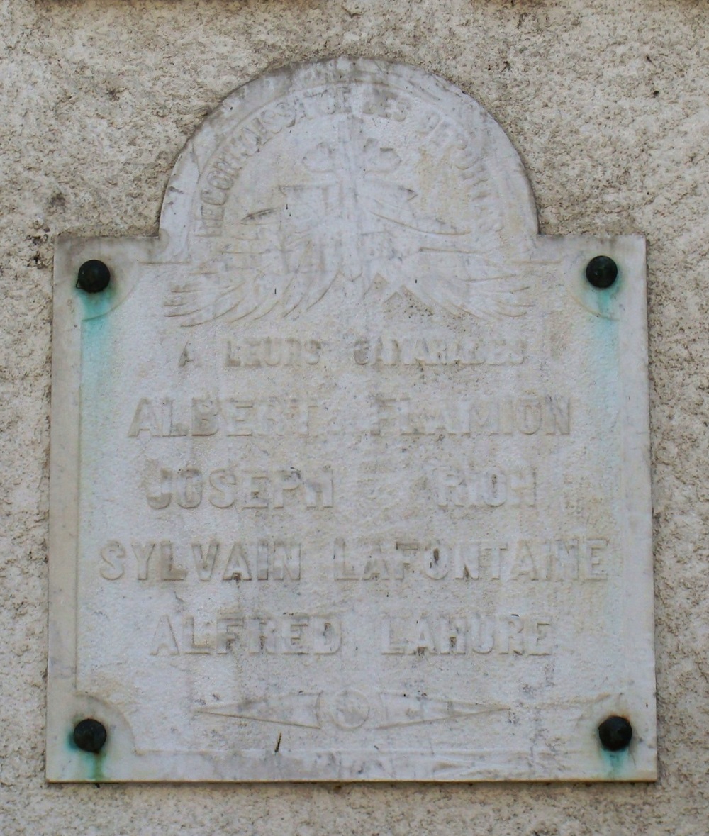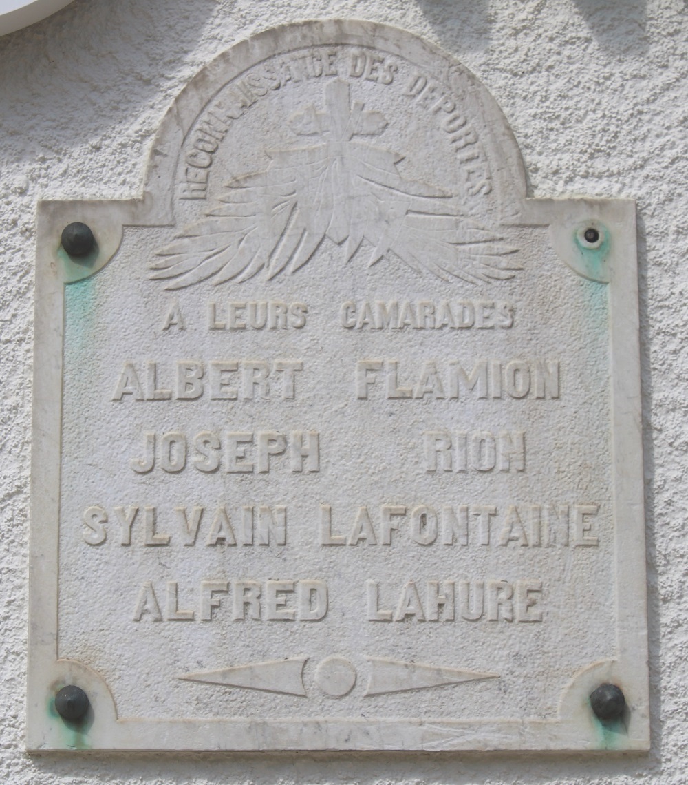 Localisation: Sur la façade de la pharmacie de Tintigny, rue de France, n° 50 (anciennement café "La fontaine aux lions"), en face de la mairie et à proximité immédiate de l'église. Coordonnées GPS: +49°40'59.3", +5°30'47.4" Inscriptions "RECONNAISSANCE DES DÉPORTÉS [Croix et palmes] À LEURS CAMARADES [Quatre noms, non classés par ordre alphabétique]" Description Plaque en marbre blanc. Inauguration: 26 août 1923 (Source [13]). Voir les noms mentionnés sur cette plaque |