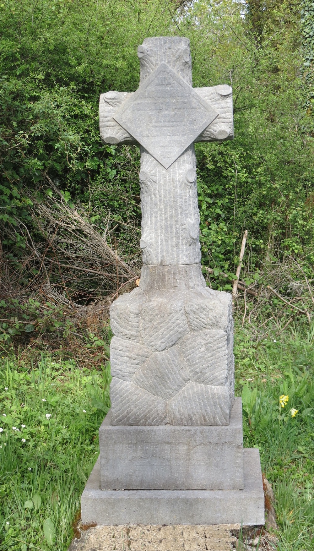 Localisation: Rue du 18ème Chasseur-Français, à gauche, sur la route Rulles-Etalle, à 170 mètres après le carrefour avec la route Villers-Mortinsart. Coordonnées GPS: +49°41'56.1", +5°34'13.5" Inscriptions Au centre de la croix "AUX MAQUISARDS TOMBÉS POUR LA PATRIE LA JEUNESSE DE VILLERS" Sur le socle "MAUER JOSEPH DE VILLERS S/S HAMES ANDRÉ DE MORTINSART 27 JUILLET 1944" Description Croix en pierre de taille ouvragée comme deux troncs d’arbres. Elle fut érigée par la jeunesse de Villers-sur-Semois en mémoire de la mort de deux jeunes maquisards de Villers-sur-Semois tombés en juillet 1944. Inauguration : 27 juillet 1945 (Source [47]. Plus d'informations sur ces victimes |