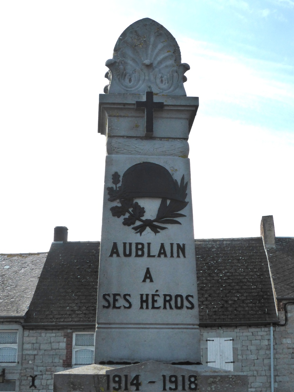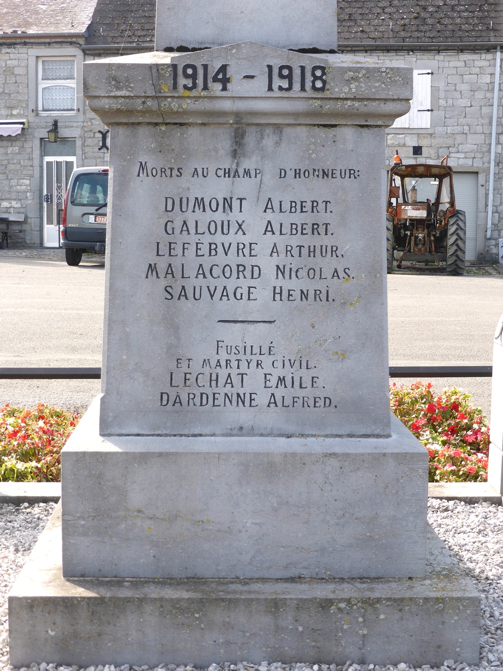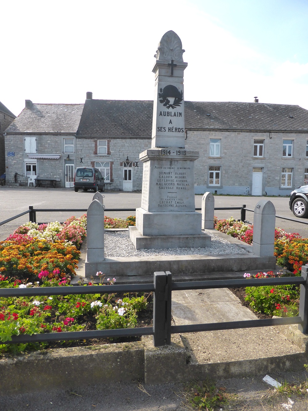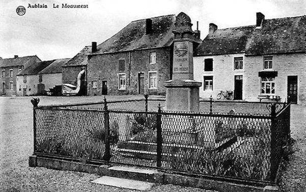 Localisation: Place Saint-Lambert, le long de la N939. Coordonnées GPS: +50°04'03.8", +4°24'31.9" Inscriptions Sur la face avant "AUBLAIN À SES HÉROS 1914 - 1918 MORTS AU CHAMP D'HONNEUR [Cinq noms, classés par ordre alphabétique] FUSILLÉ ET MARTYR CIVIL [Deux noms]" Sur la face latérale gauche "COMBATTANTS [Trois noms, classés par ordre alphabétique] COMBATTANTS FRANçAIS [Quatre noms, classés par ordre alphabétique] DÉPORTÉS [Deux noms, non classés par ordre alphabétique]" Sur la face latérale droite "COMBATTANTS [Onze noms, non classés par ordre alphabétique]" Sur la face arrière "ÉRIGÉ PAR L'ADMINISTRATION CLE [Sept noms, classés par titre au sein du conseil communal] COMBATTANT [Un nom]" Informations complémentaires Le monument est en forme d’obélisque composé de 4 niveaux de tailles décroissantes du au sommet. Le piédestal est sur un socle carré, base, corps avec inscription et puis "corniche", partie supérieure en forme d'obélisque avec inscriptions sur les 4 faces, puis couronnement. Le dispositif dispose d’un sommet sculpté avec un relief en forme de palmettes. Le monument se trouve au centre d’une zone quadrangulaire couverte de graviers délimitée par 4 potelets. Dimensions: - zone de gravier: 2,50 m de côté; - base du monument: 1 m de côté; - hauteur: 3 m. Matériaux: pierre calcaire (peut-être du calcaire de Frasnes). Signature du tailleur de pierre sur le potelet nord-est : « L. BRUNET À FRASNES » (Source: Bibliotheca Couvin) Plus d'informations concernant ces victimes |