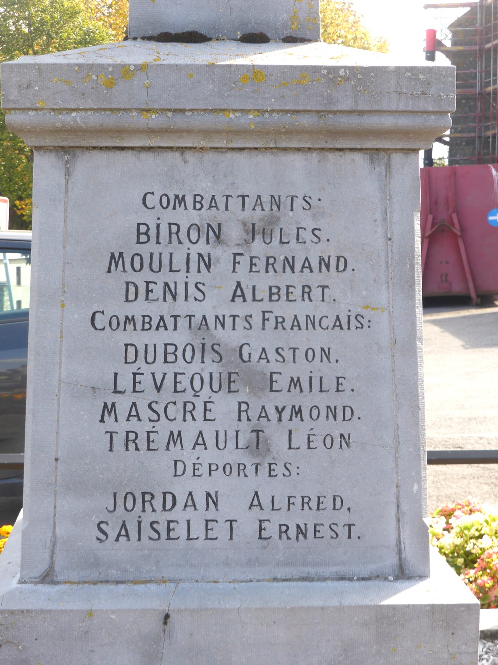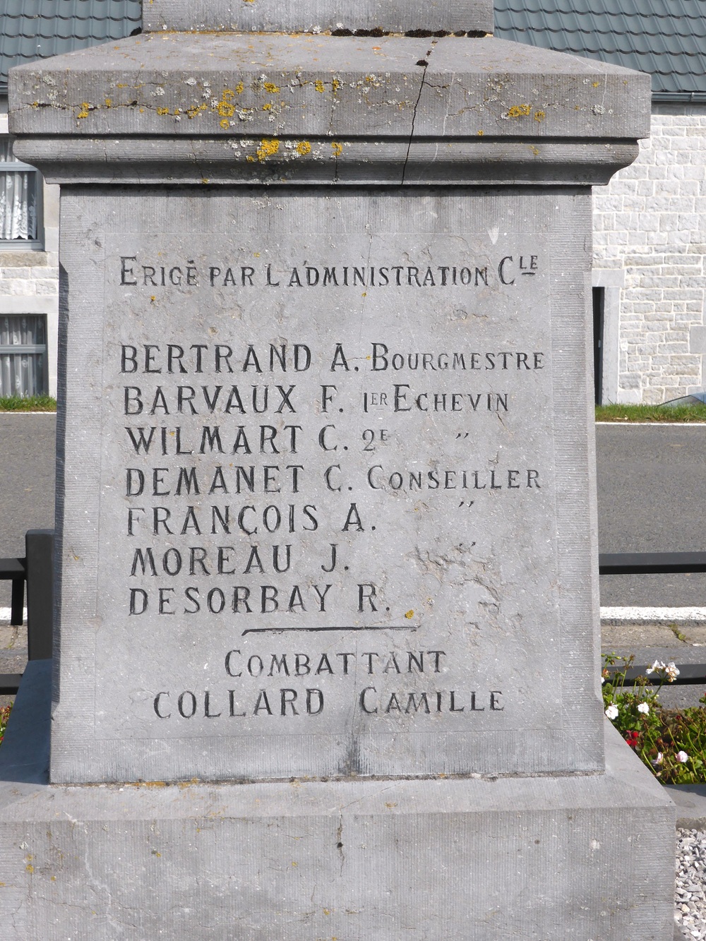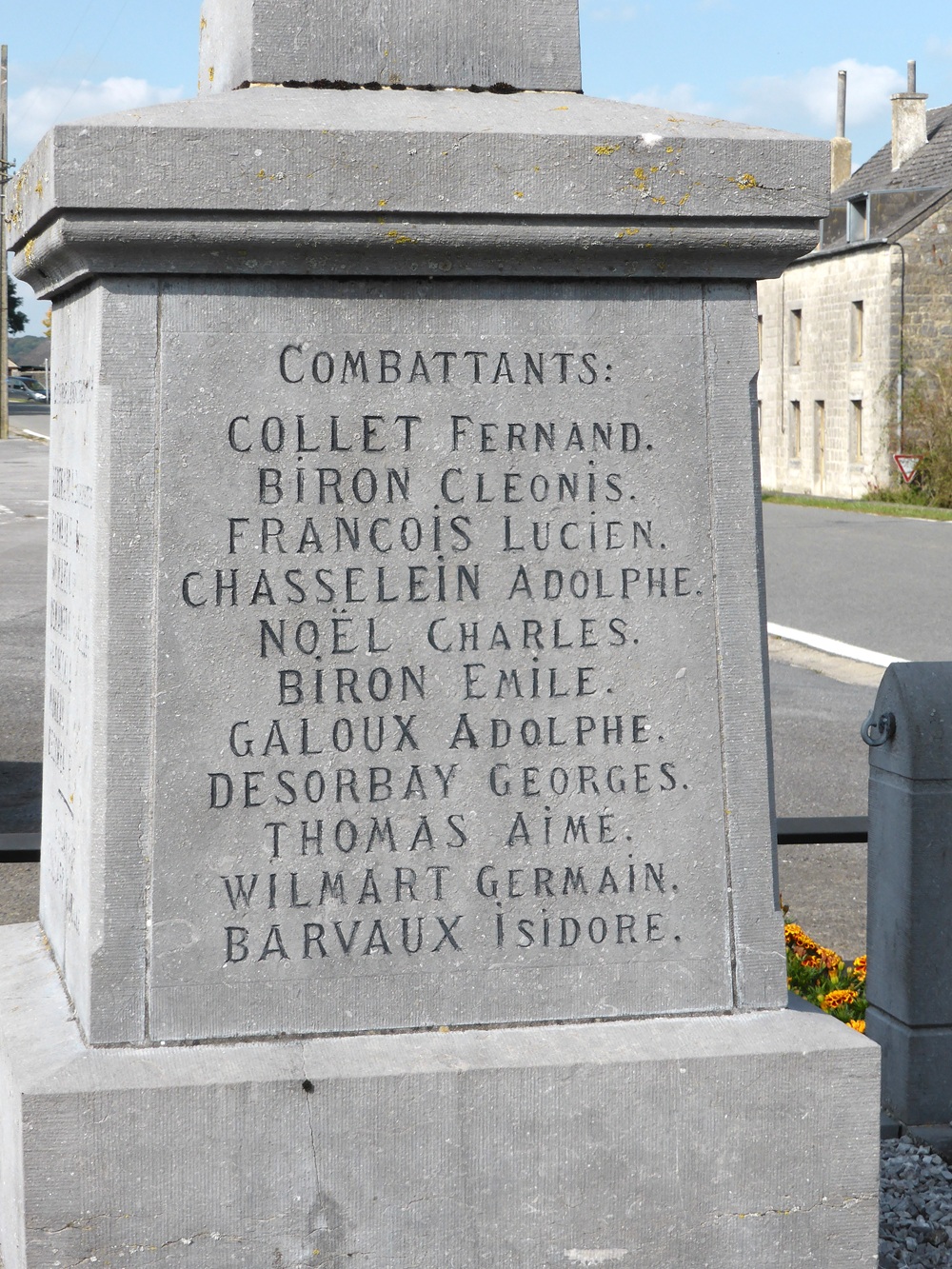 Localisation: Place Saint-Lambert, le long de la N939. Coordonnées GPS: +50°04'03.8", +4°24'31.9" Inscriptions Sur la face avant "AUBLAIN À SES HÉROS 1914 - 1918 MORTS AU CHAMP D'HONNEUR [Cinq noms, classés par ordre alphabétique] FUSILLÉ ET MARTYR CIVIL [Deux noms]" Sur la face latérale gauche "COMBATTANTS [Trois noms, classés par ordre alphabétique] COMBATTANTS FRANçAIS [Quatre noms, classés par ordre alphabétique] DÉPORTÉS [Deux noms, non classés par ordre alphabétique]" Sur la face latérale droite "COMBATTANTS [Onze noms, non classés par ordre alphabétique]" Sur la face arrière "ÉRIGÉ PAR L'ADMINISTRATION CLE [Sept noms, classés par titre au sein du conseil communal] COMBATTANT [Un nom]" Informations complémentaires Le monument est en forme d’obélisque composé de 4 niveaux de tailles décroissantes du au sommet. Le piédestal est sur un socle carré, base, corps avec inscription et puis "corniche", partie supérieure en forme d'obélisque avec inscriptions sur les 4 faces, puis couronnement. Le dispositif dispose d’un sommet sculpté avec un relief en forme de palmettes. Le monument se trouve au centre d’une zone quadrangulaire couverte de graviers délimitée par 4 potelets. Dimensions: - zone de gravier: 2,50 m de côté; - base du monument: 1 m de côté; - hauteur: 3 m. Matériaux: pierre calcaire (peut-être du calcaire de Frasnes). Signature du tailleur de pierre sur le potelet nord-est : « L. BRUNET À FRASNES » (Source: Bibliotheca Couvin) Plus d'informations concernant ces victimes |