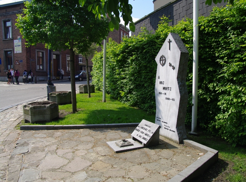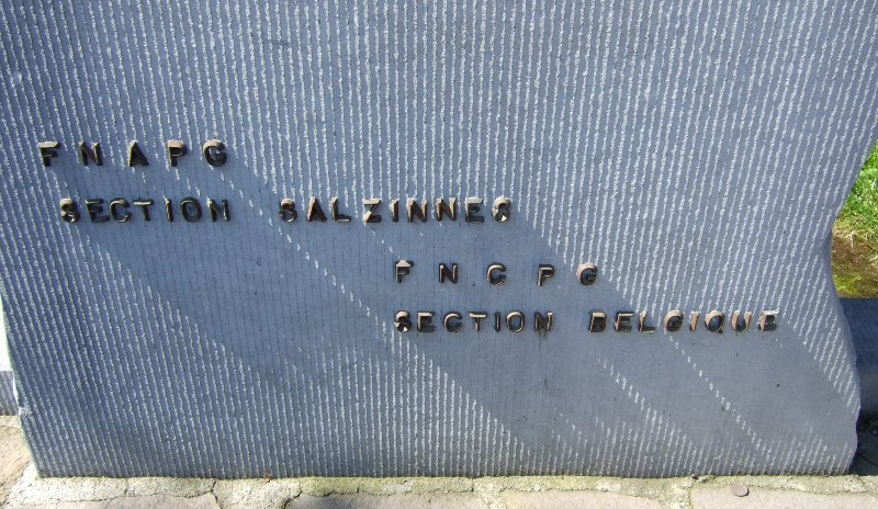 Localisation de ce monument: Au carrefour des Rues du Belvédère et Patenier et de la Chaussée de Charleroi (Place du 8 mai) en face de l'église Sainte-Julienne. Coordonnées GPS: +50°27'46.99", +4°50'41.71" Inscription figurant sur le monument "À NOS MORTS 1914-18 1940-45 FNAPG SECTION SALZINNES FNGPG SECTION BELGIQUE" Sur la plaque au pied du monument "JUMELAGE DES ANCIENS P.G. DE BERCK-SUR-MER ET DE SALZINNES" Ce monument ne comporte pas de noms |