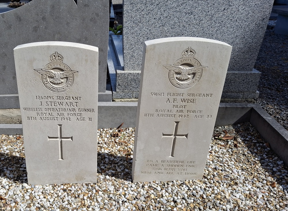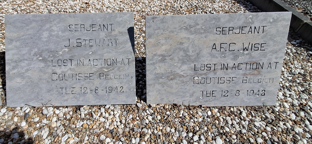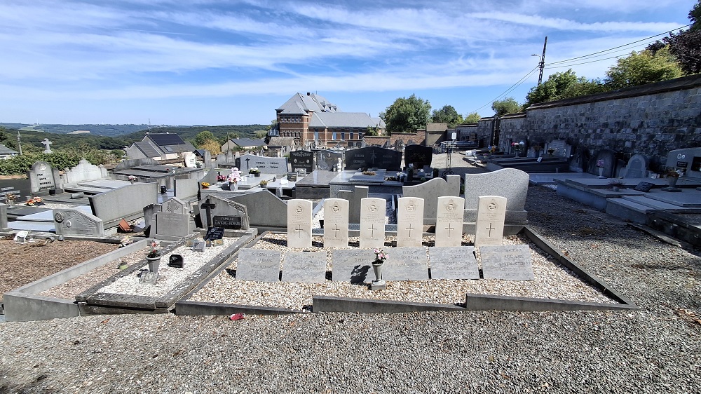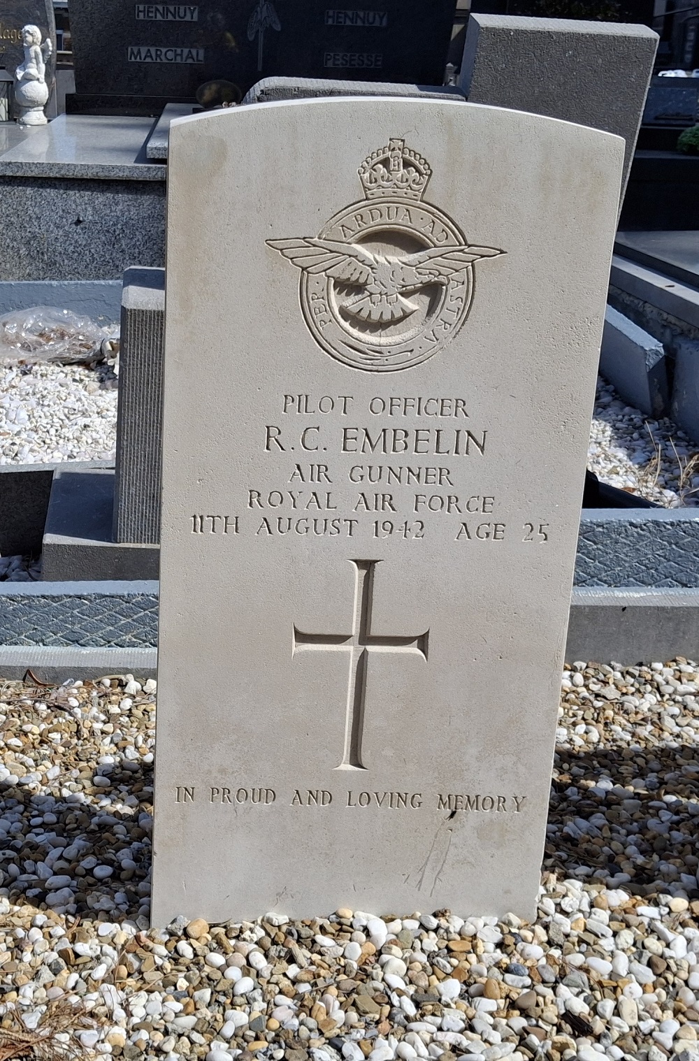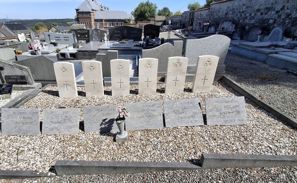 Localisation: Rue de la Montagne, dans le cimetière à l'arrière de l'église Saint-Hubert. Coordonnées GPS: +50°27'49.0", +5°07'02.4" Informations complémentaires L'avion, un Vickers Wellington Mk III, a décollé à 22 h 41 de la base d'Alconbury, Cambridgeshire, GB, pour une opération à destination de Mayence, en Allemagne. À l'aller, l'avion fut abattu par l'équipage de chasse de nuit composé de l'Oberfeldwebel Reinhard Kollak et du sous-officier Hans Hermann du 7./NJG 4, pilotant un Bf 110 3C+AR qui avait décollé de l'aérodrome de Juvincourt, en France (Source: Aviation Safety Network) Plus d'informations concernant ces victimes |