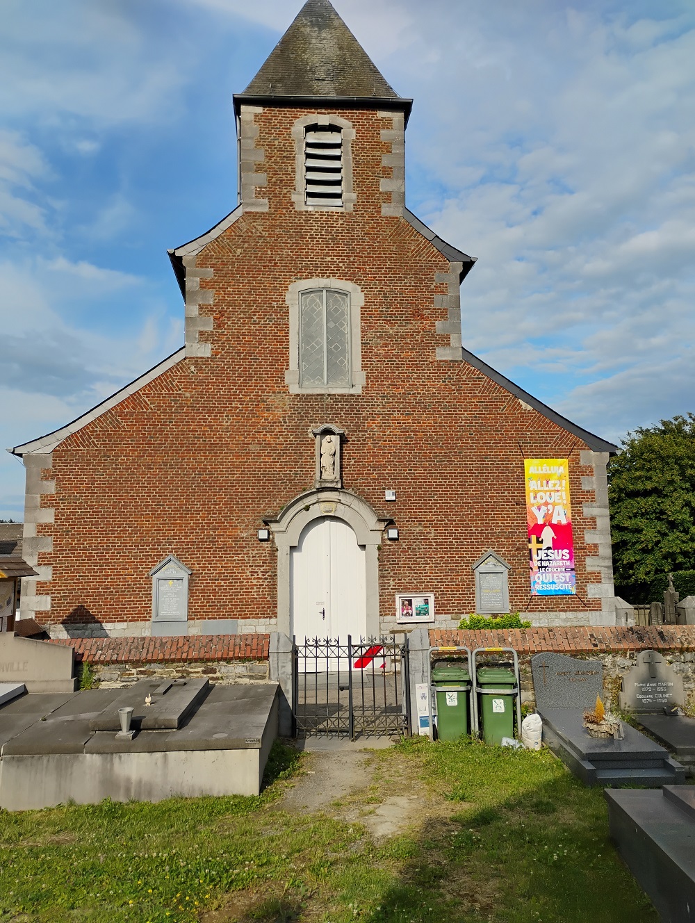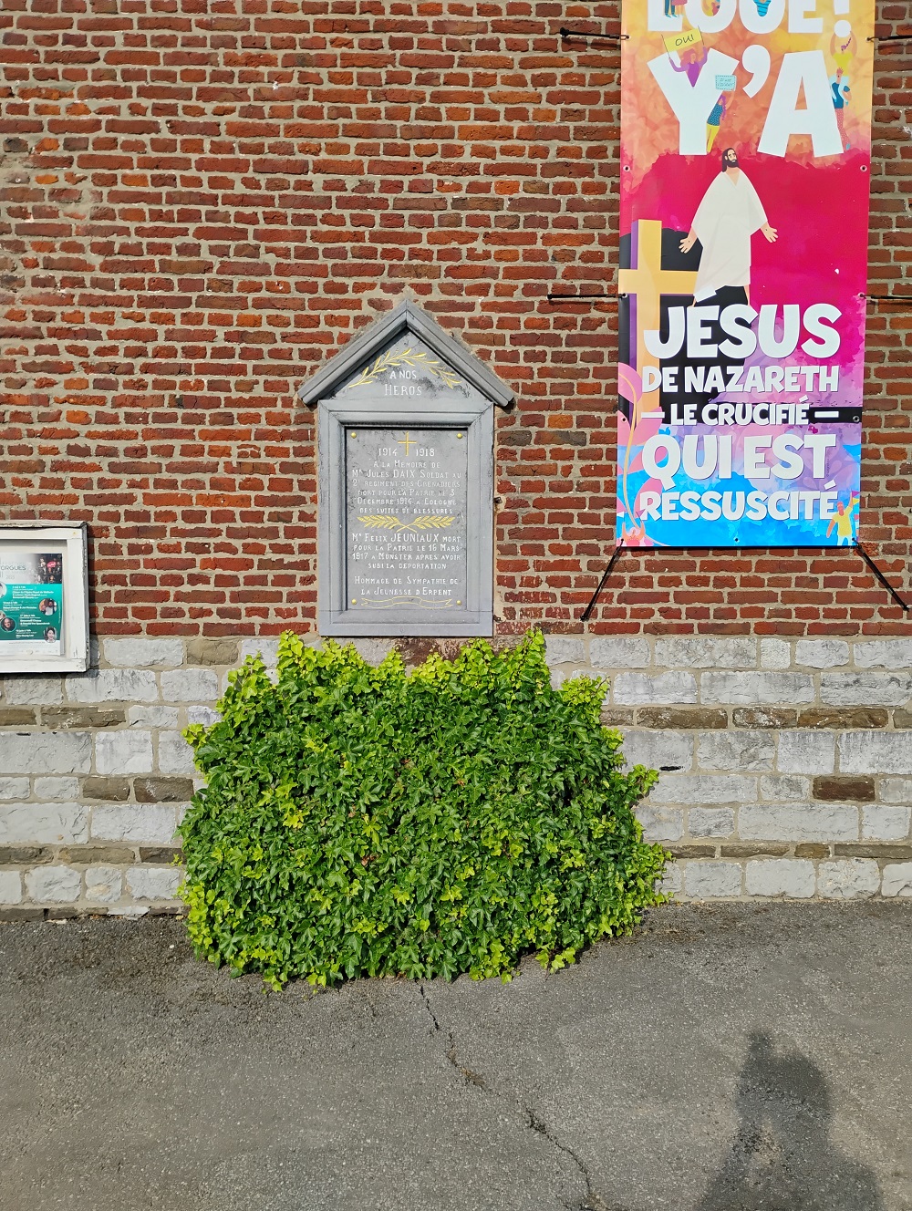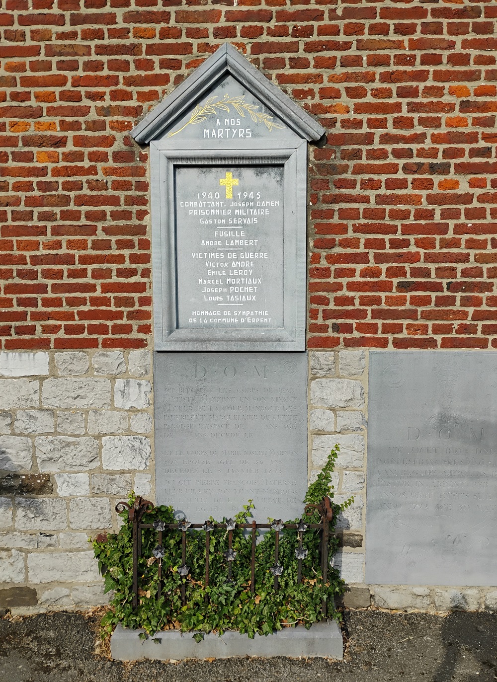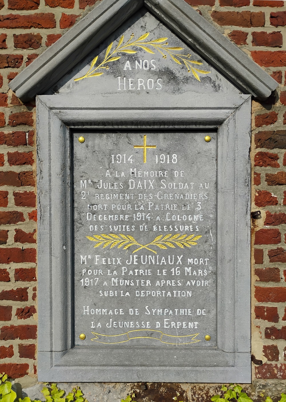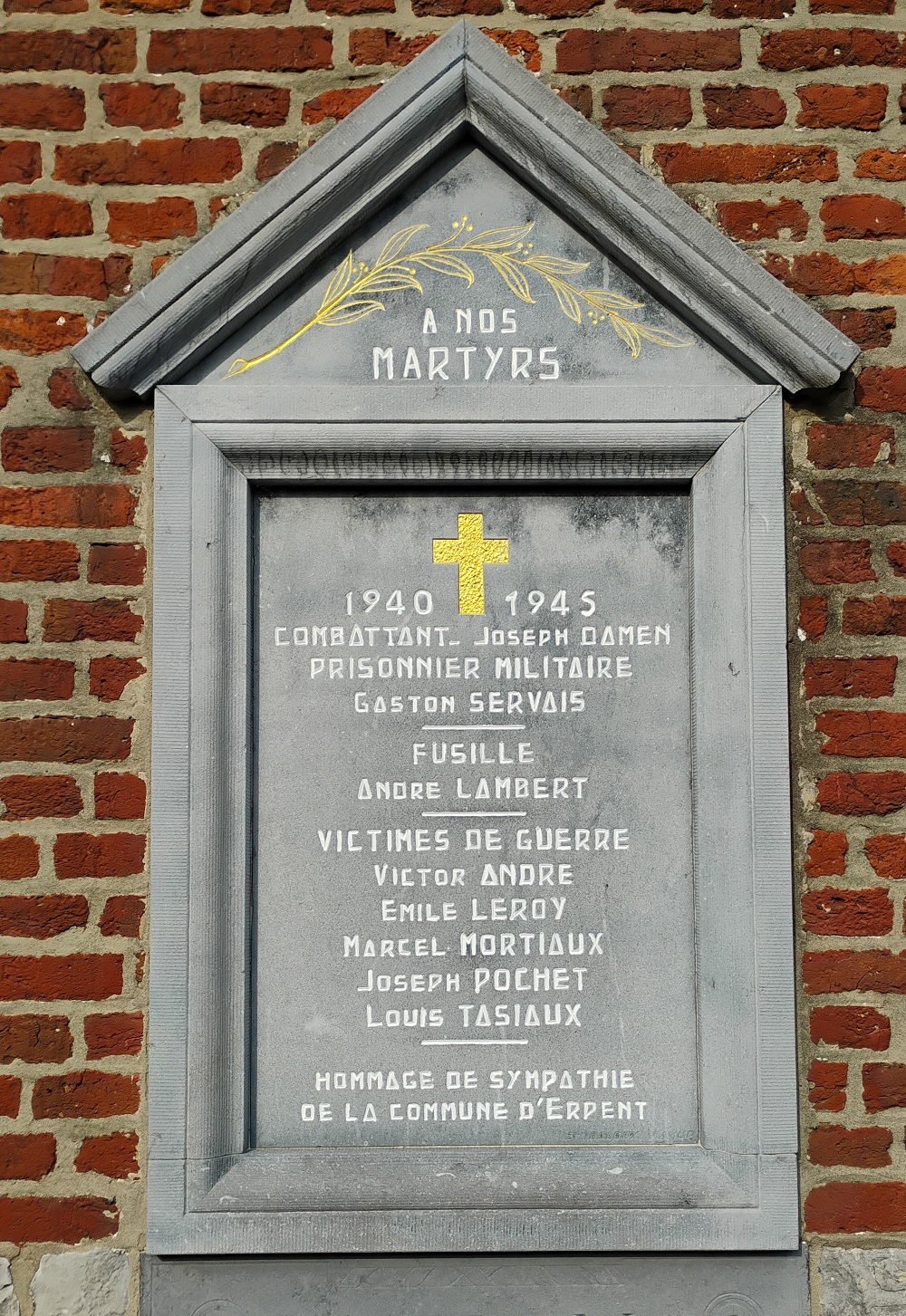 Localisation: Sur la façade de l'église Saints Pierre et Paul, rue de Régnié-Durette. Coordonnées GPS: +50°27'03.3", +4°54'24.6" Inscriptions Dalle 1914-1918 "À NOS HÉROS 1914 - 1918 À LA MÉMOIRE DE [Deux noms, avec diverses informations biographiques] HOMMAGE DE SYMPATHIE DE LA JEUNSESSE D'ERPENT" Dalle 1940-1945 "À NOS MARTYRS 1940 - 1945 COMBATTANT [Un nom] PRISONNIER MILITAIRE [Un nom] FUSILLÉ [Un nom] VICTIMES DE GUERRE [Cinq noms, classés par ordre alphabétique] HOMMAGE DE SYMPATHIE DE LA COMMUNE D'ERPENT" Voir les noms mentionnés sur les dalles |