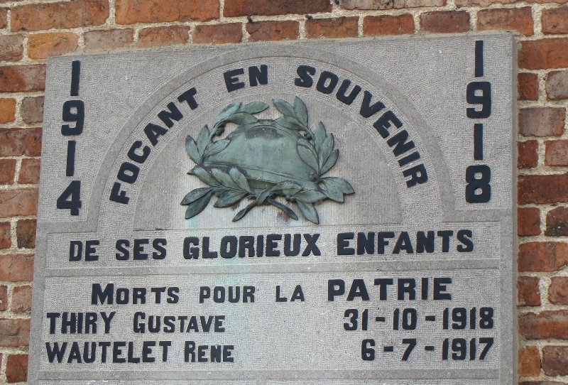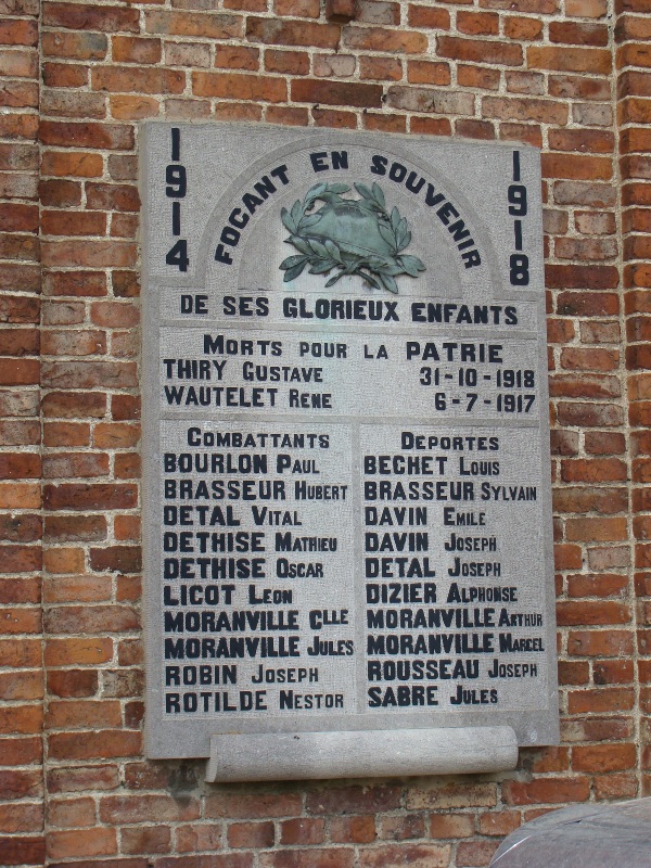 Localisation de cette stèle: Rue de Rochefort, sur la façade de l'école communale fondamentale. Coordonnées GPS: +50°07'58.00", +5°02'31.04" Inscription figurant sur la stèle "1914 1918 FOCANT EN SOUVENIR DE SES GLORIEUX ENFANTS MORTS POUR LA PATRIE [Deux noms, avec date de décès, classés par ordre alphabétique] COMBATTANTS [Dix noms, classés par ordre alphabétique] DÉPORTÉS [Dix noms, classés par ordre alphabétique]" Voir les noms mentionnés sur cette stèle |