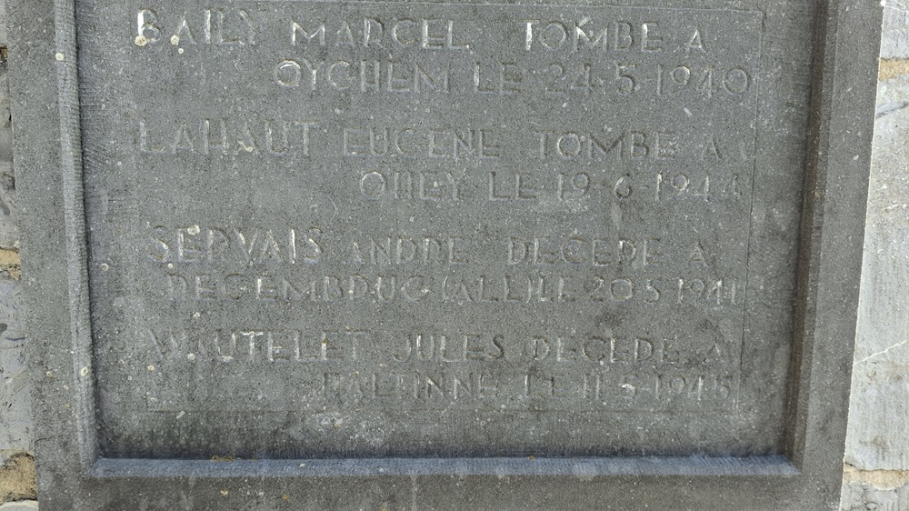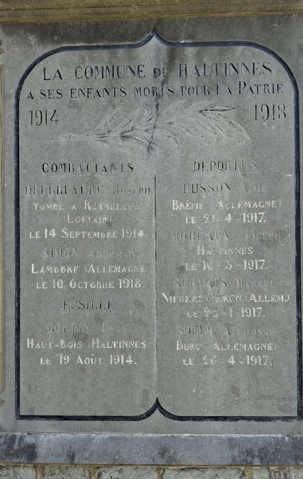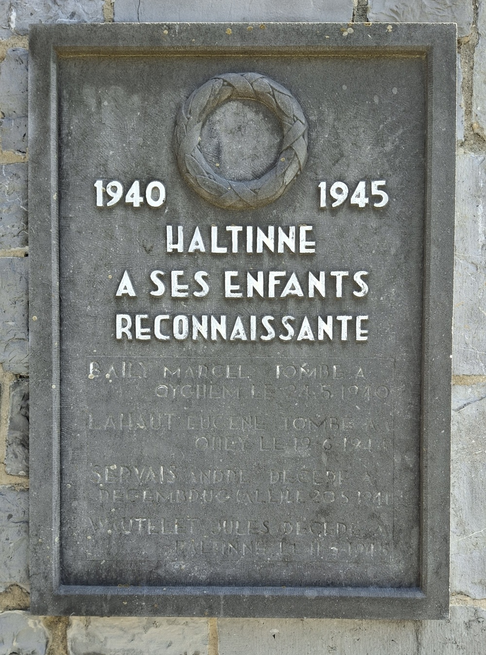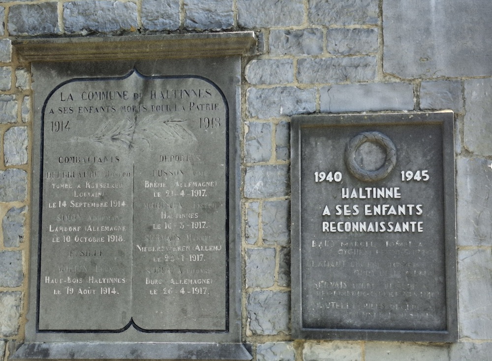 Localisation: Al Cassette (N491), sur la façade de l'église Saint-Martin. Coordonnées GPS: +50°27'04.7", +5°04'26.2" Inscriptions Sur la plaque de gauche "LA COMMUNE DE HALTINNES À SES ENFANTS MORTS POUR LA PATRIE 1914 1918 COMBATTANTS [Deux noms, avec lieu et date de décès, classés par ordre alphabétique] FUSILLÉ [Un nom, avec lieu et date de décès] DÉPORTÉS [Quatre noms, avec lieu et date de décès, classés par ordre alphabétique]" Sur la plaque de droite "1940 1945 HALTINNE À SES ENFANTS RECONNAISSANTE [Quatre noms, avec lieu et date de décès, classés par ordre alphabétique]" Plus d'informations concernant ces victimes |