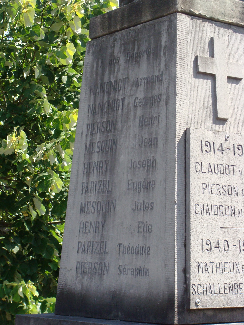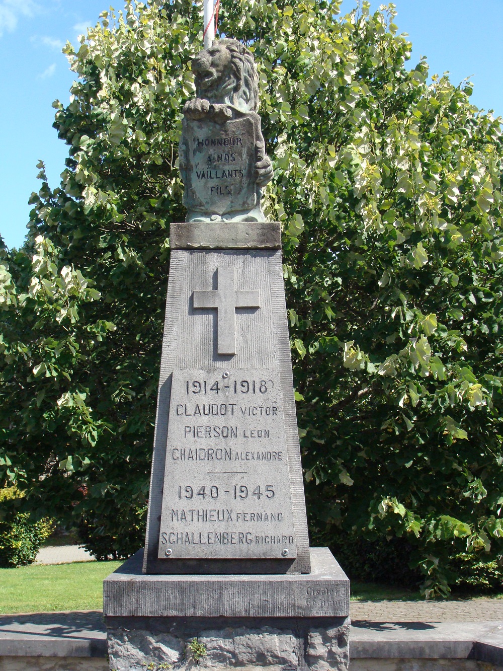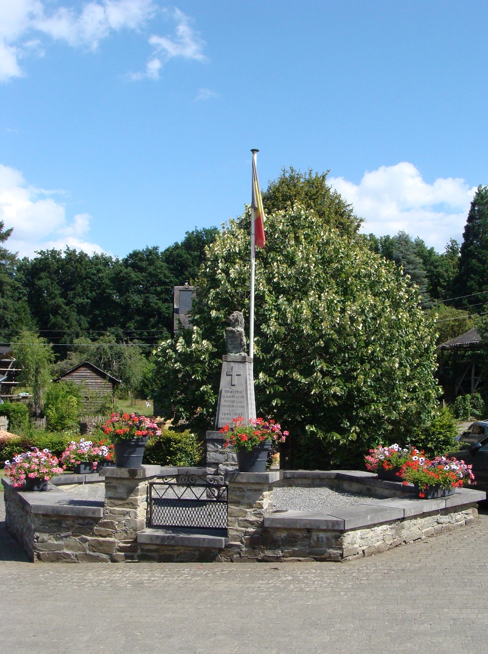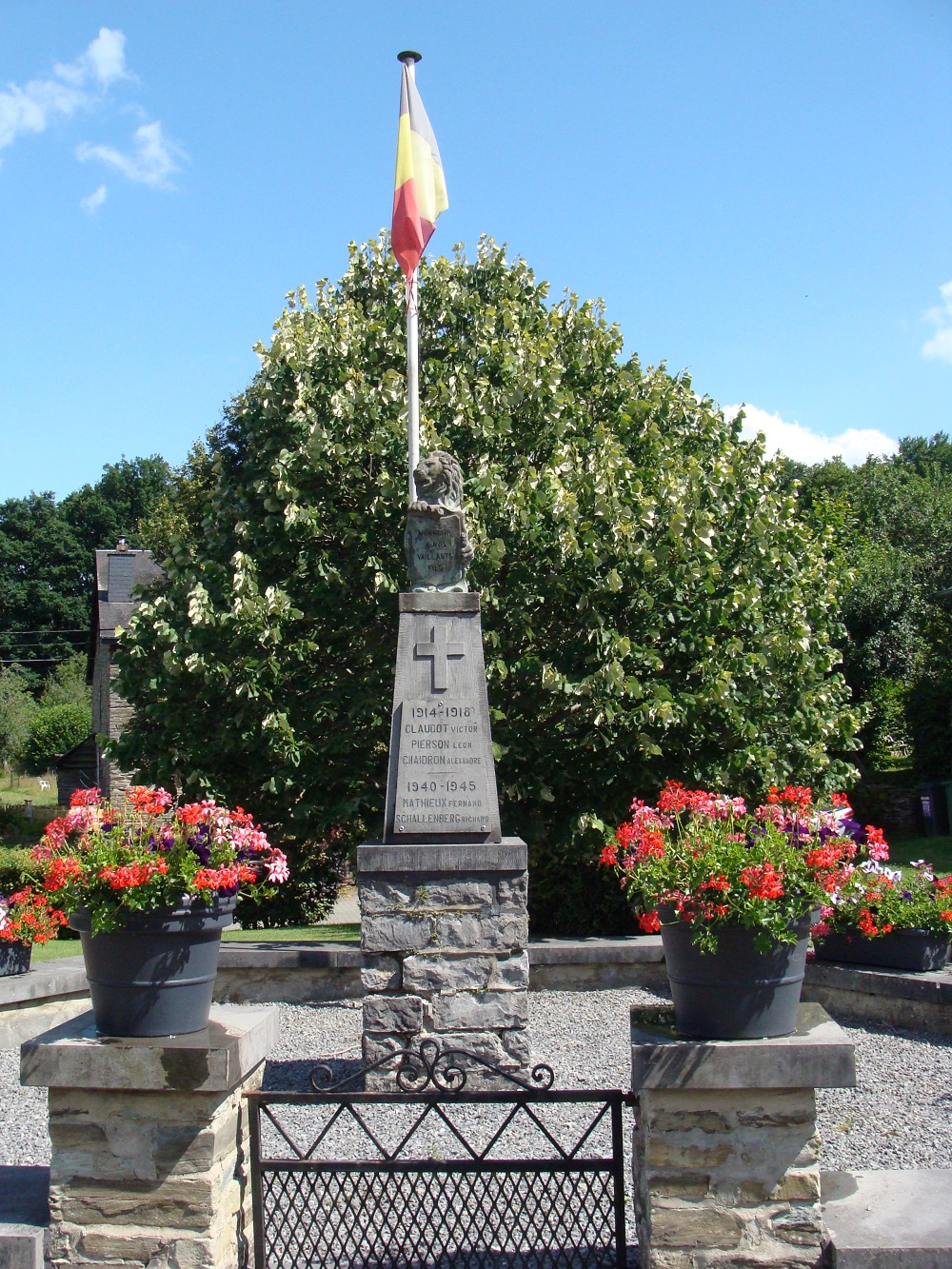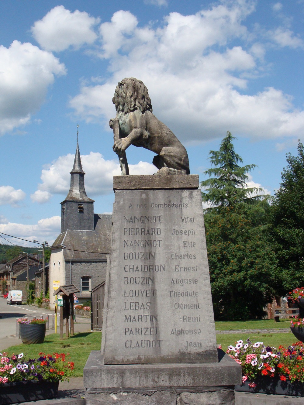 Localisation: Au centre du village, à l'intersection de la rue Sainte-Agathe et de la rue du Pont de Claies, à proximité immédiate de l'église. Coordonnées GPS: +49°51'43.88", +4°55'45.70" Inscriptions Face avant "HONNEUR À NOS VAILLANTS FILS 1914 - 1918 [Trois noms, non classés par ordre alphabétique] 1940 - 1945 [Deux noms, classés par ordre alphabétique]" Face latérale droite "À NOS COMBATTANTS [Onze noms, non classés par ordre alphabétique]" Face latérale gauche "À NOS DÉPORTÉS [Dix noms, non classés par ordre alphabétique]" Réalisation du monument: CISELET de Gedinne, NA, BE Voir les noms gravés sur le monument |