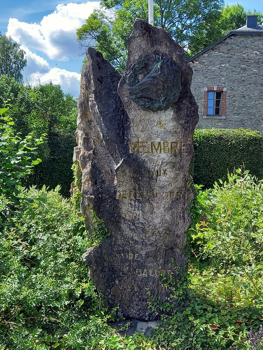 Localisation: Sur la place principale du village, rue d'en Haut, dans un jardin aménagé. Coordonnées GPS: +49°51'58.3", +4°54'00.8" Inscriptions "[Hure de sanglier entourée d'une couronne de feuilles de chêne, le tout en bronze.] MEMBRE AUX DÉFENSEURS DU PAYS ARISTIDE / BALLOT 25 - 5 - 1940" Description Sur la place principale du village, dans un jardin aménagé. Le monument se trouve au bout d'une allée en pierres de schiste maçonnées. L'allée est délimitée par des plants de lavande. Le drapeau belge flotte au sommet d'un mât derrière le monument. Cet ensemble se trouve à l'emplacement de l'ancien cimetière du village (Source: Site de la commune de Vresse-sur-Semois). Inauguration : 21 juillet 1962 (Source: Site de la commune de Vresse-sur-Semois). Plus d'informations concernant cette victime |