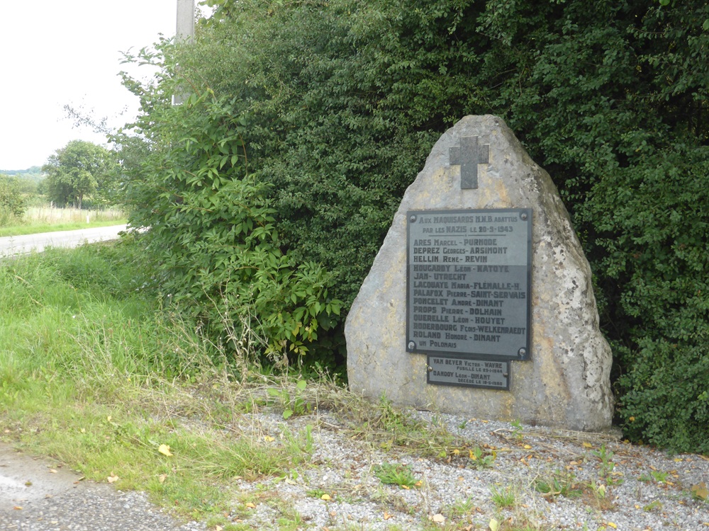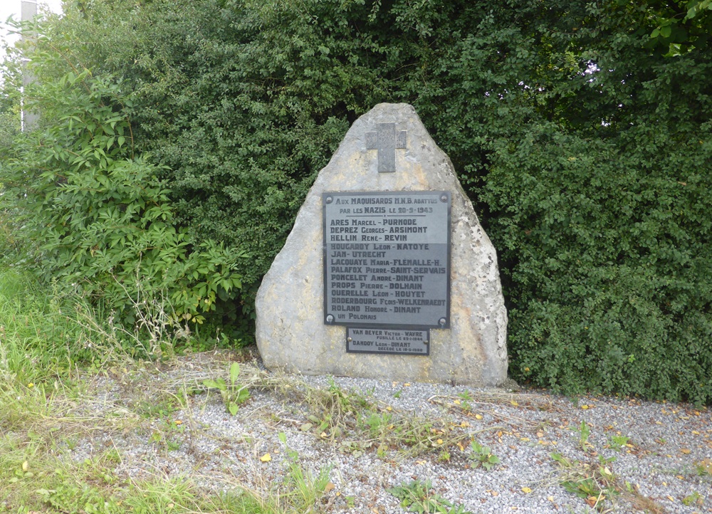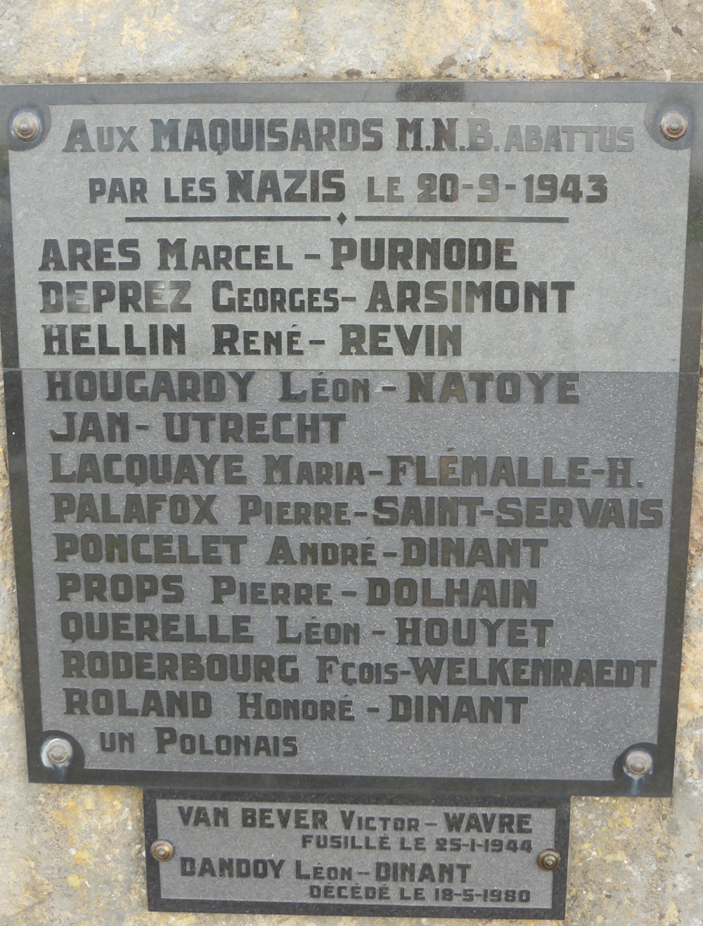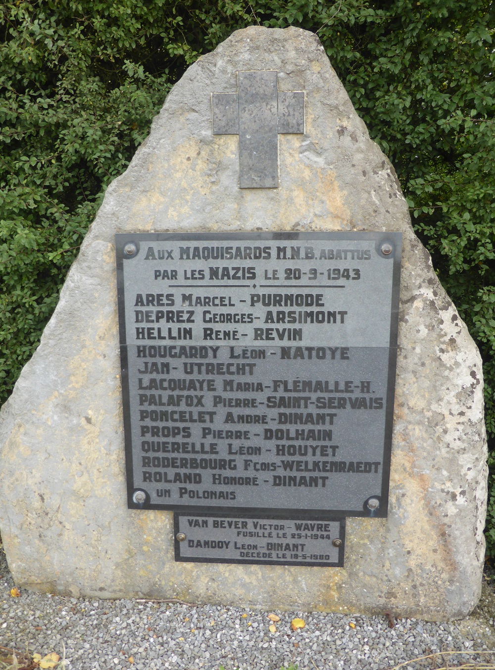 Localisation de ce monument: À la jonction d'un chemin empierré, Fostia, et de la Route de Givet (N929) Coordonnées GPS: +50°12'15.69", +5°05'49.66" Inscriptions figurant sur le monument "AUX MAQUISARDS M.N.B. ABATTUS PAR LES NAZIS LE 20-9-1943 [Douze noms avec leur lieu d'origine, classés par ordre alphabétique] UN POLONAIS [Deux noms avec leur lieu d'origine et leur date de décès, non classés par ordre alphabétique]" Informations complémentaires: M.N.B. = Mouvement National Belge Le Mouvement national belge (Belgisch Nationale Beweging en néerlandais) était l'un des principaux réseaux de résistance durant la seconde guerre mondiale. Il fut fondé par Aimé DANDOY, le 17 décembre 1940. Les missions de ce groupe consistaient en la mise au point des filières d'évacuation de pilotes alliés, la presse clandestine, le renseignement, et le sabotage. Le groupe s'organisait sur une base provinciale et sera profondément remanié dans son organisation en janvier 1944 à la suite de la mission Tybalt d'André WENDELEN qui visait à structurer l'organisation en vue de la libération. Le Mouvement national belge verra la plupart de ses dirigeants arrêtés en février 1944 et ne pourra finalement pas jouer le rôle que lui avait attribué le gouvernement belge en exil à Londres (Source [25]) Voir les noms mentionnés sur ce monument |