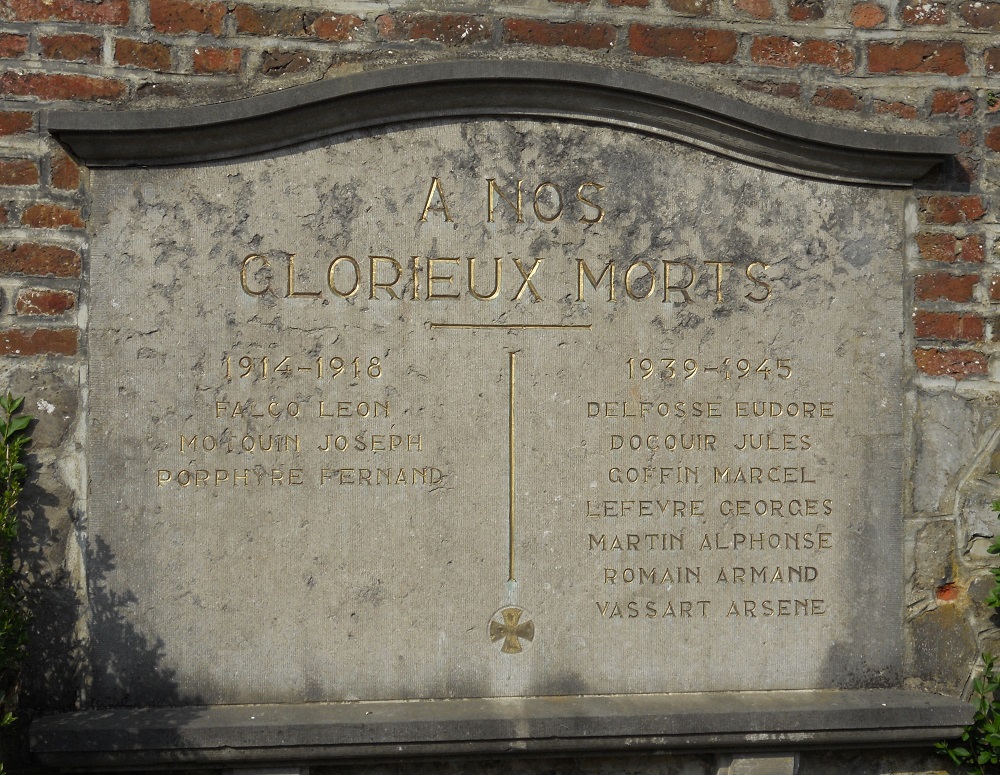 Localisation: Place d'Onoz, contre le mur d'enceinte du cimetière entourant l'église Saint-Martin. Coordonnées GPS: +50°29'31.04", +4°40'17.20". Inscriptions "À NOS GLORIEUX MORTS 1914 - 1918 [Trois noms, classés par ordre alphabétique] 1939 - 1945 [Sept noms, classés par ordre alphabétique]" Voir les noms gravés sur le monument |