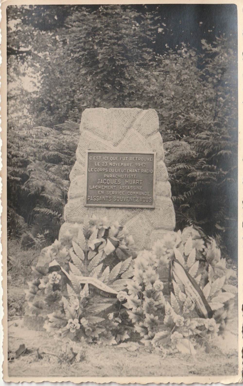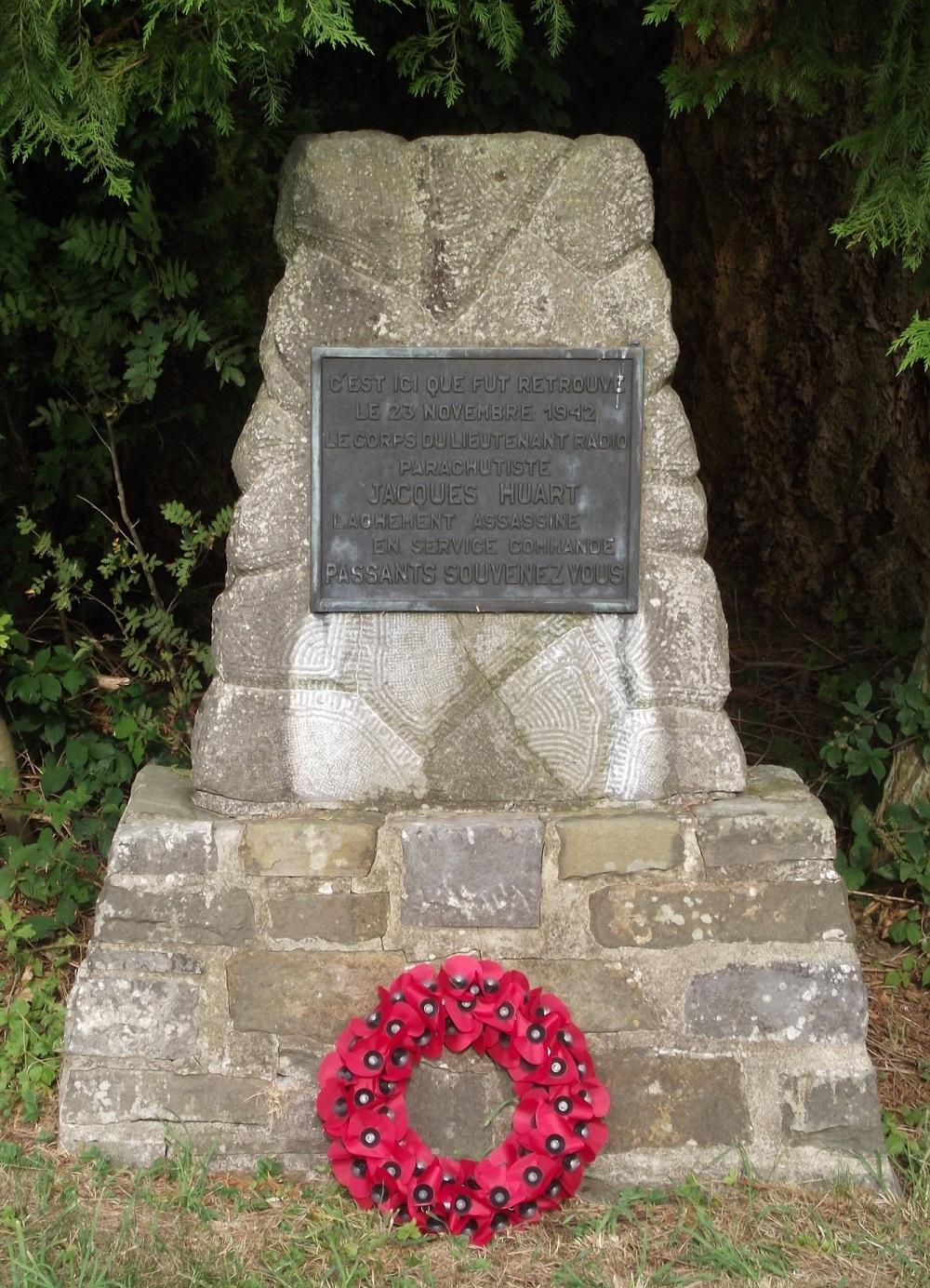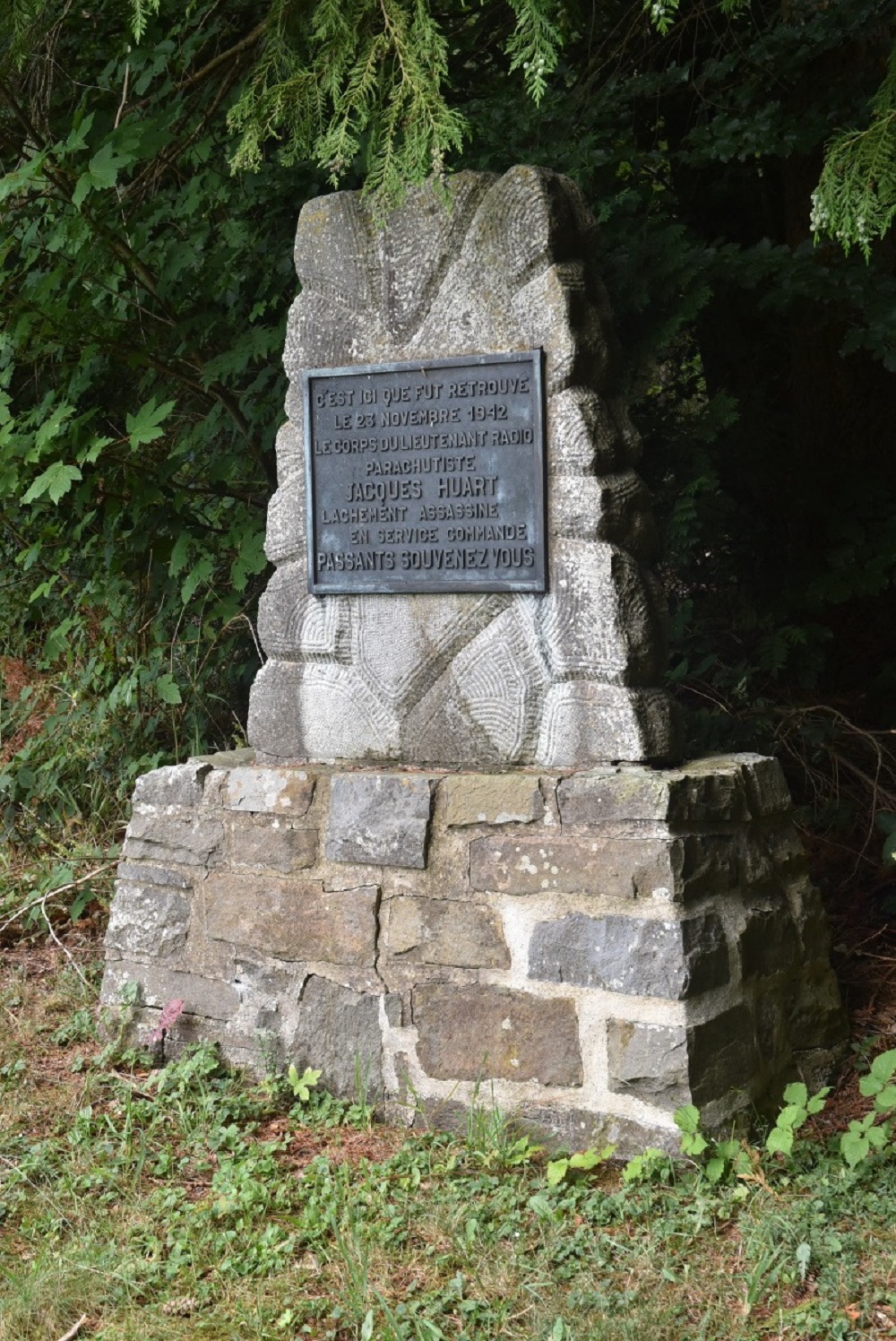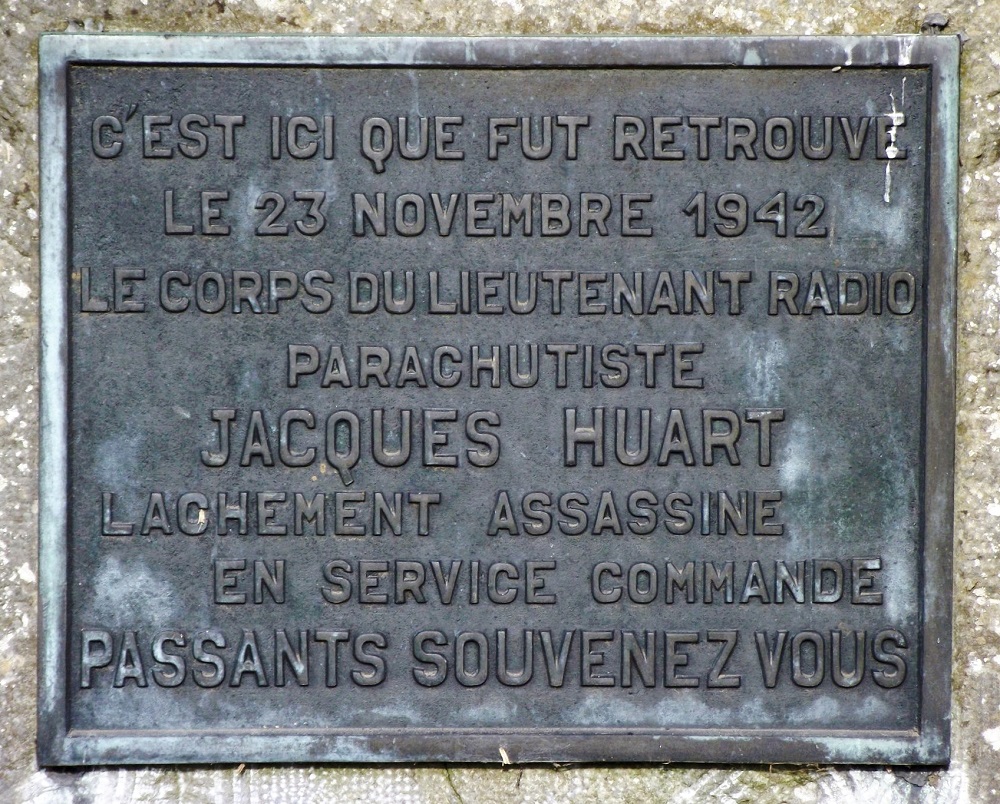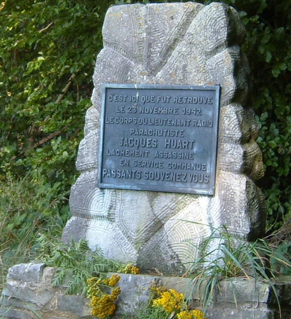 Localisation: Rue des Virées. À l'intersection de la rue des Virées avec la rue de Bouillon (N95), un panneau indique la direction à suivre pour trouver cette stèle.. Coordonnées GPS: 50°00'39.0"N 4°58'41.0"E Inscriptions "C'EST ICI QUE FUT RETROUVÉ LE 23 NOVEMBRE 1942 LE CORPS DU LIEUTENANT RADIO PARACHUTISTE JACQUES HUART LÂCHEMENT ASSASSINÉ EN SERVICE COMMANDÉ PASSANTS SOUVENEZ-VOUS" Inauguration : 4 juillet 1947 (Source [241]). Suggestions de lecture - "Automne 1942. Les 60 jours, à Gedinne, de Jacques Huart, opérateur radio égorgé", José CULOT in "Le Bulletin du CEHG" (Cercle d'études historiques de Gedinne), n° 18A (juin 2014) ; - "À propos de l'affaire Huart (guerre de 1940)", Willy Clarinval in "Le Bulletin du CEHG" (Cercle d'études historiques de Gedinne), n° 18B (décembre 2014) ; - "Le parachutiste égorgé", Jean TEMMERMAN, 1989. Plus d'informations concernant cette victime |
