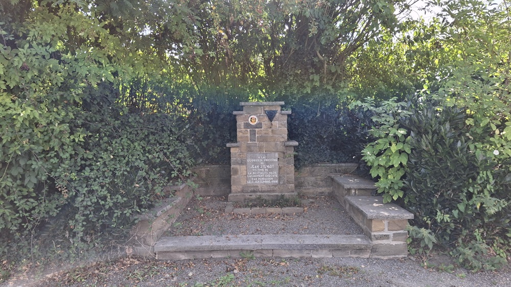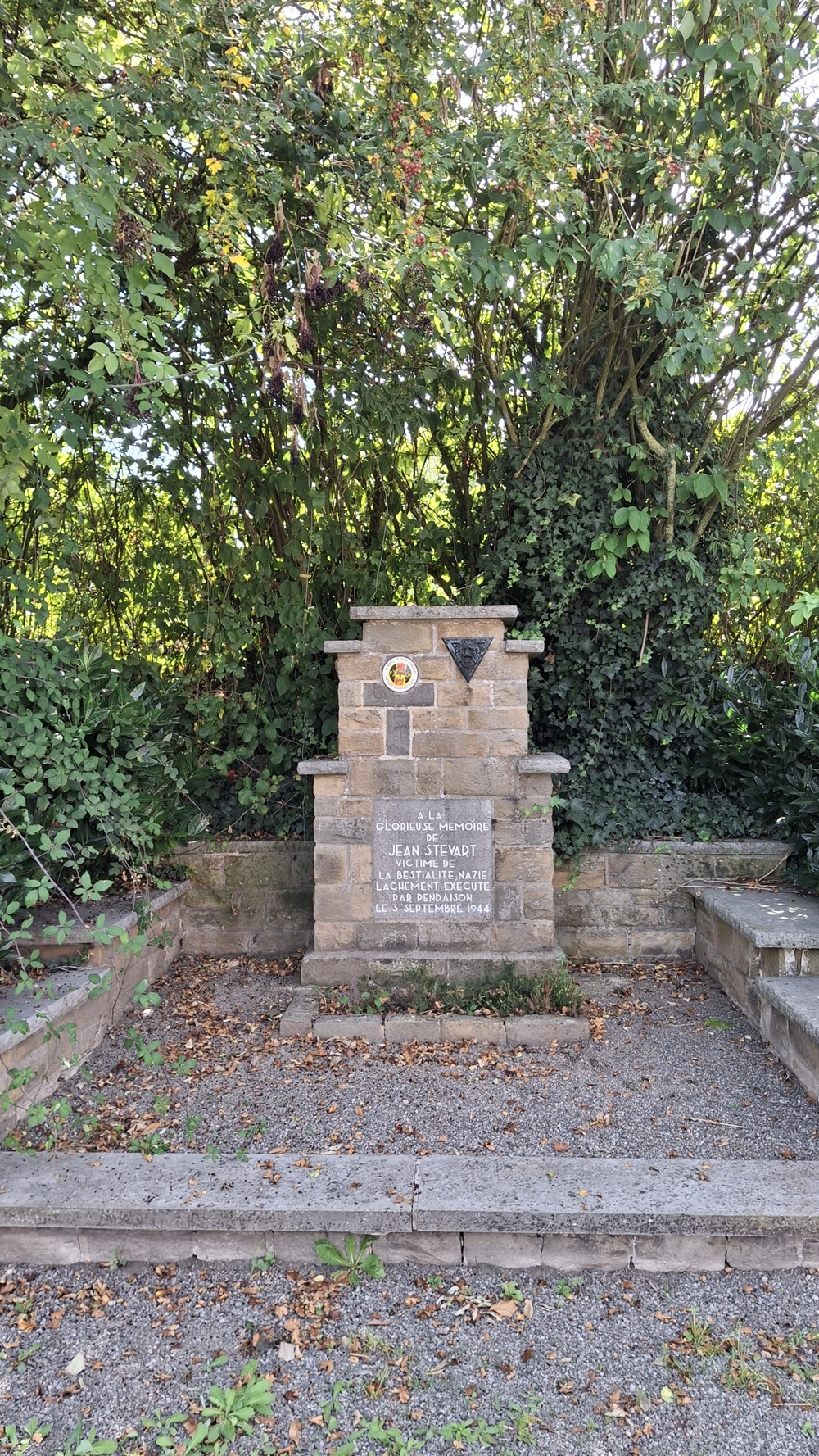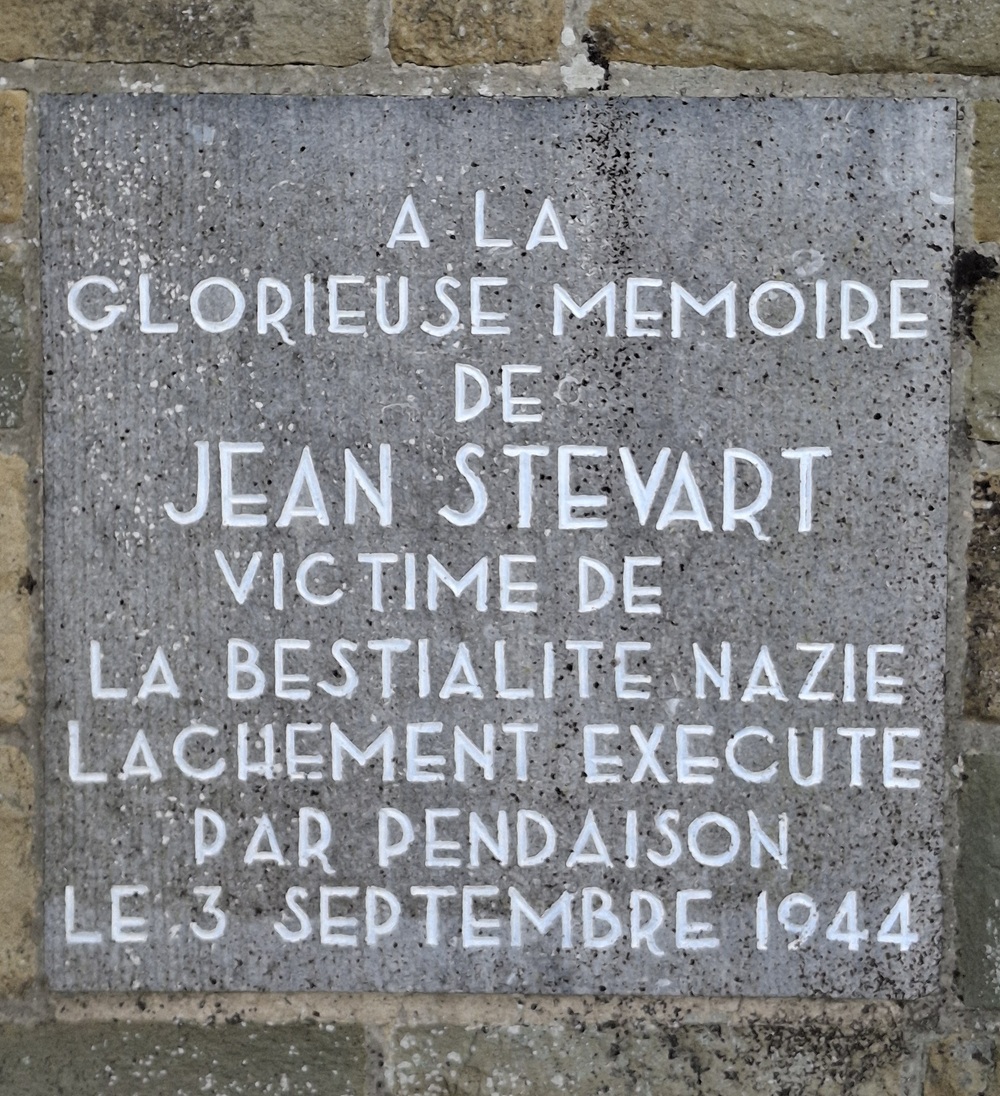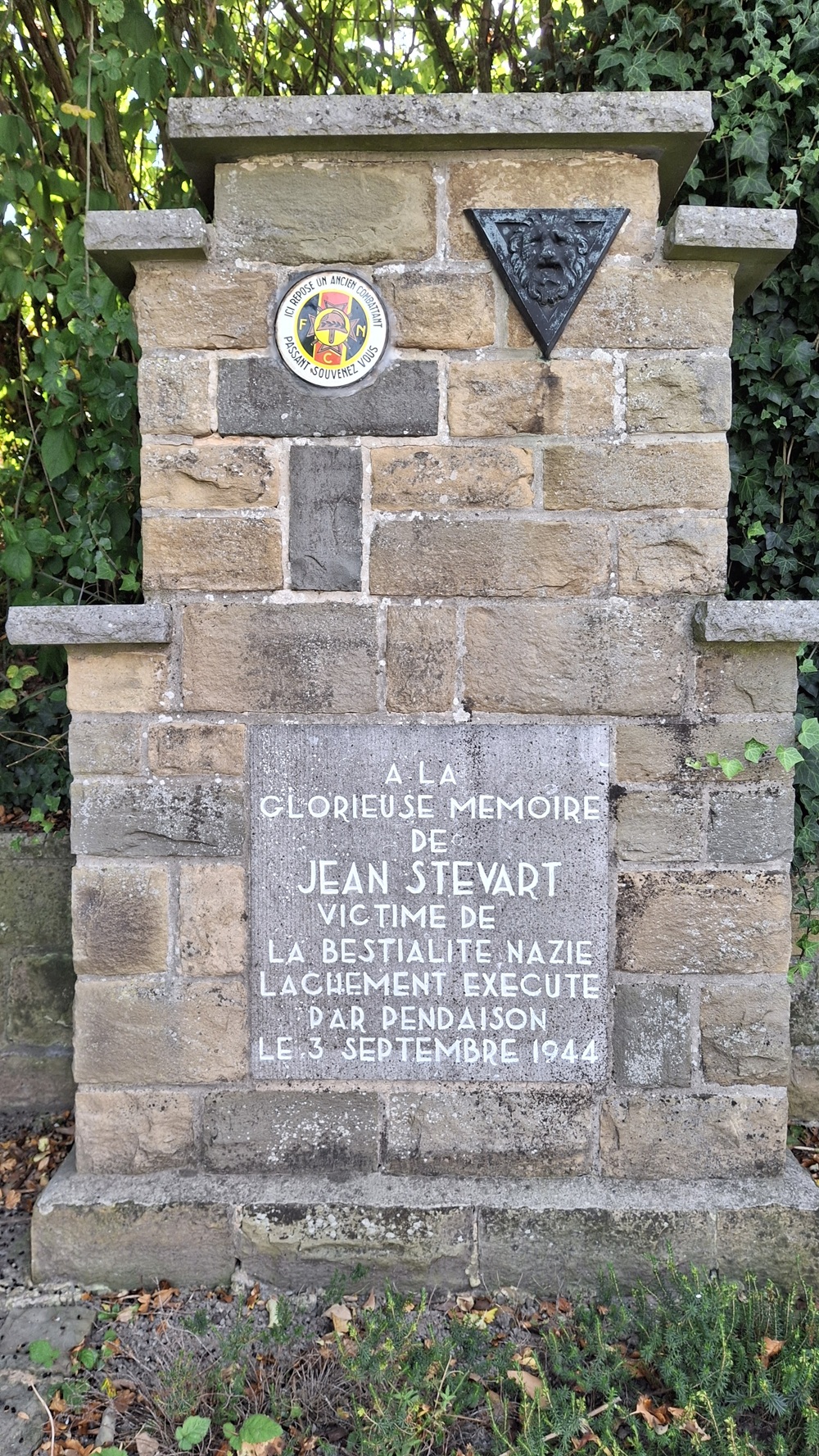 Localisation: Rue du Village, en face de l'ancienne maison communale. Coordonnées GPS: +50°27'15.4", +5°10'22.4" Inscriptions "À LA GLORIEUSE MÉMOIRE DE JEAN STEVART VICTIME DE LA BESTIALITÉ NAZIE LÂCHEMENT EXÉCUTÉ PAR PENDAISON LE 3 SEPTEMBRE 1944" Plus d'informations concernant cette vicitime |