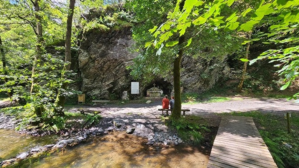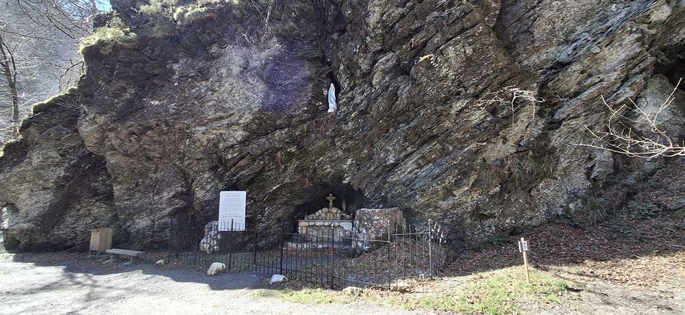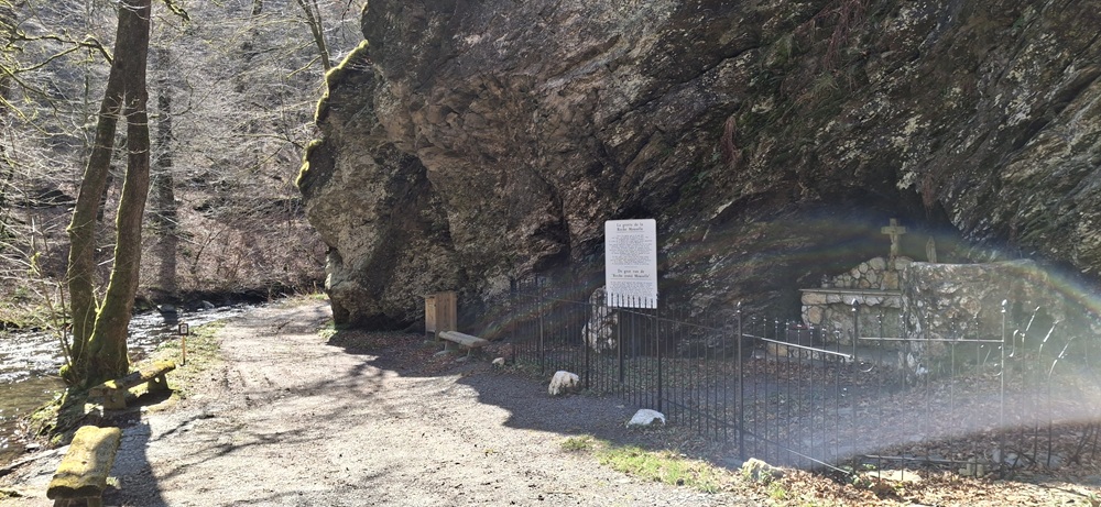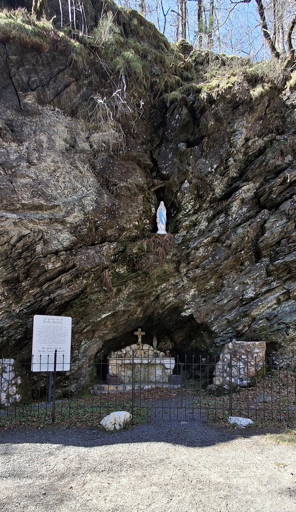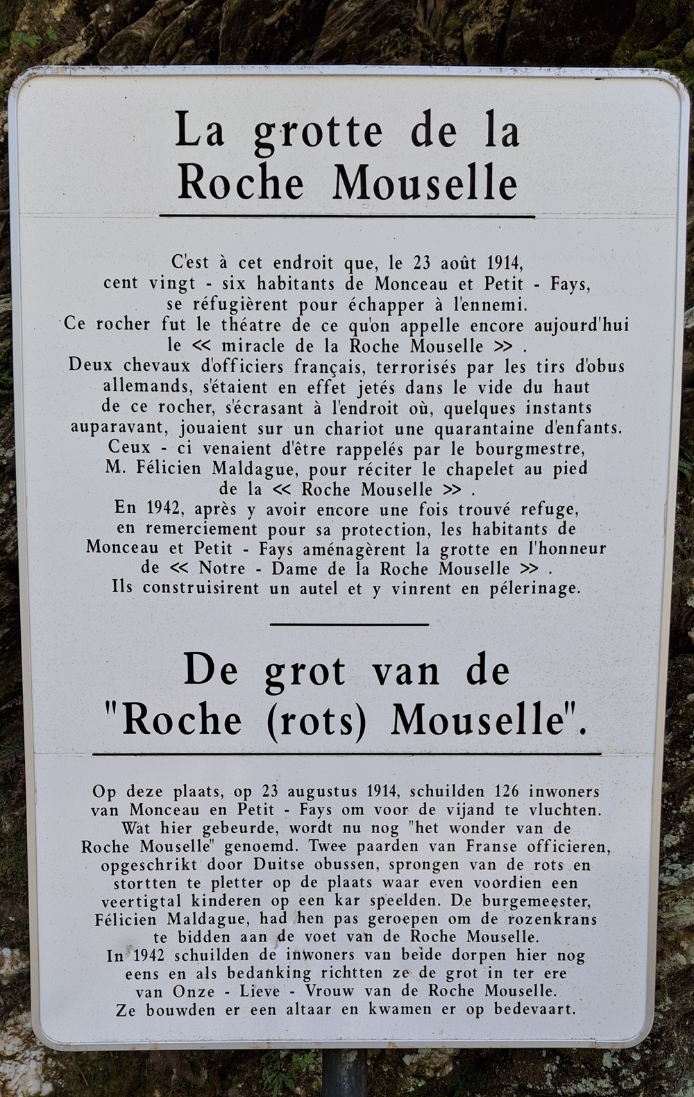 Localisation: Le long du ruisseau du Ruaumoulin, à plus ou moins 700 mètres de la N914 (qui relie Vresse-sur-Semois à Petit-Fays). Coordonnées GPS: +49°53'27.6", +4°57'31.8" Inscriptions Sur le panneau à gauche de la grotte "LA GROTTE DE LA ROCHE MOUSELLE C'EST À CET ENDROIT QUE, LE 23 AOÛT 1914, CENT VINGT-SIX HABITANTS DE MONCEAU ET PETIT-FAYS, SE RÉFUGIÈRENT POUR ÉCHAPPER À L'ENNEMI. CE ROCHER FUT LE THÉÂTRE DE CE QU'ON APPELLE ENCORE AUJOURD'HUI LE MIRACLE DE LA ROCHE MOUSELLE. DEUX CHEVAUX D'OFFICIERS FRANçAIS, TERRORISÉS PAR LES TIRS D'OBUS ALLEMANDS, S'ÉTAIENT EN EFFET JETÉS DANS LE VIDE DU HAUT DE CE ROCHER, S'ÉCRASANT À L'ENDROIT Où, QUELQUES INSTANTS AUPARAVANT, JOUAIENT SUR UN CHARIOT UNE QUARANTAINE D'ENFANTS. CEUX-CI VENAIENT D'ÊTRE RAPPELÉS PAR LE BOURGMESTRE, m. FÉLICIEN MALDAGUE, POUR RÉCITER LE CHAPELET AU PIED DE LA ROCHE MOUSELLE. EN 1942, APRÈS Y AVOIR ENCORE UNE FOIS TROUVÉ REFUGE EN REMERCIEMENT POUR SA PROTECTION, LES HABITANTS DE MONCEAU ET PETIT-FAYS AMÉNAGÈRENT LA GROTTE EN L'HONNEUR DE NOTRE-DAME DE LA ROCHE MOUSELLE. ILS CONSTRUISIRENT UN AUTEL ET Y VINRENT EN PÈLERINAGE." Informations complémentaires La Roche Mouselle est davantage synonyme de refuge que de lieu de dévotion. Des légendes circulent quant à l’origine de ce site perdu dans la forêt. L’endroit constituant un abri naturel, on raconte que des réfractaires allèrent s’y cacher sous la Convention et le Premier Empire. Lors de l’invasion allemande, 126 habitants de Monceau et Petit-Fays se sont enfuis dans la forêt proche, sur des chariots, transportant enfants, malades et personnes âgées. Ils y restèrent plusieurs jours, le temps que des troupes de Uhlans quittent les villages. De leur cachette, ils ne pouvaient être inquiétés par les soldats du Kaiser qui se dirigeaient vers la France toute proche. Madame Alice MARTIN se souvient de ce qui s’est passé le 23 août 1914, à l’aube de la première guerre mondiale. « Nous habitions le village de Monceau. Dès que l’on annonça l’arrivée imminente des envahisseurs dont on nous avait dit le plus grand mal, on nous a installés, nous les enfants, sur une charrette de M. Félicien MALDAGUE. Son attelage, tiré par deux robustes chevaux ardennais, nous conduisit à la Roche Mouselle. Pendant ce temps, les combats avaient commencé. Le 25 août à Petit-Fays, position toujours tenue par l’armée française, deux officiers s’étaient arrêtés à l’Hôtel de la Vallée. Ils avaient attaché leurs montures à proximité de l’église toute proche. Soudain, les Allemands entreprirent de pilonner cette position. Un obus éclata prés de l’édifice religieux. Terrorisés, les deux chevaux brisèrent leurs liens et s’enfuirent à travers la campagne. La vie s’était organisée à la Roche Mouselle. Pendant que l’on préparait le repas du soir, les 40 enfants jouaient devant la grotte. M. MALDAGUE, inquiété par le bruit des obus qui éclataient dans les villages tout proches, sortit de l’abri et nous ordonna de rentrer au plus vite pour réciter le chapelet. A peine le dernier bambin eût-il quitté le chariot, que les deux chevaux des officiers français s’écrasèrent sur l’attelage. Ils avaient couru à travers champs et bois pour déboucher au-dessus de la Roche Mouselle. Evidemment, l’invitation du mayeur à nous mettre à l’abri pour prier a été interprétée comme un signe du Ciel. Un miracle destiné à épargner les enfants qui jouaient là. Sans cela, c’est vrai, plusieurs d’entre nous perdaient la vie… » De retour dans leurs foyers, les villageois promirent de construire une grotte mariale à la Roche Mouselle. La guerre prit fin, mais rien ne fût entrepris. Ce n’est qu’en 1940, que les habitants, qui avaient à nouveau trouvé refuge à cet endroit, jurèrent d’être fidèles à leur promesse. On entreprit donc l’aménagement de la grotte en 1942. Elle fut restaurée en 1998 par des bénévoles du Syndicat d’Initiative et quelques personnes de Petit-Fays. Depuis cette date, une messe y est célébrée le dernier dimanche de septembre (Source: Notre-Dame des 3 vallées) Vous trouverez aussi des informations sur Médecins de la Grande Guerre Ce monument ne comporte pas de noms de victimes de guerre |
