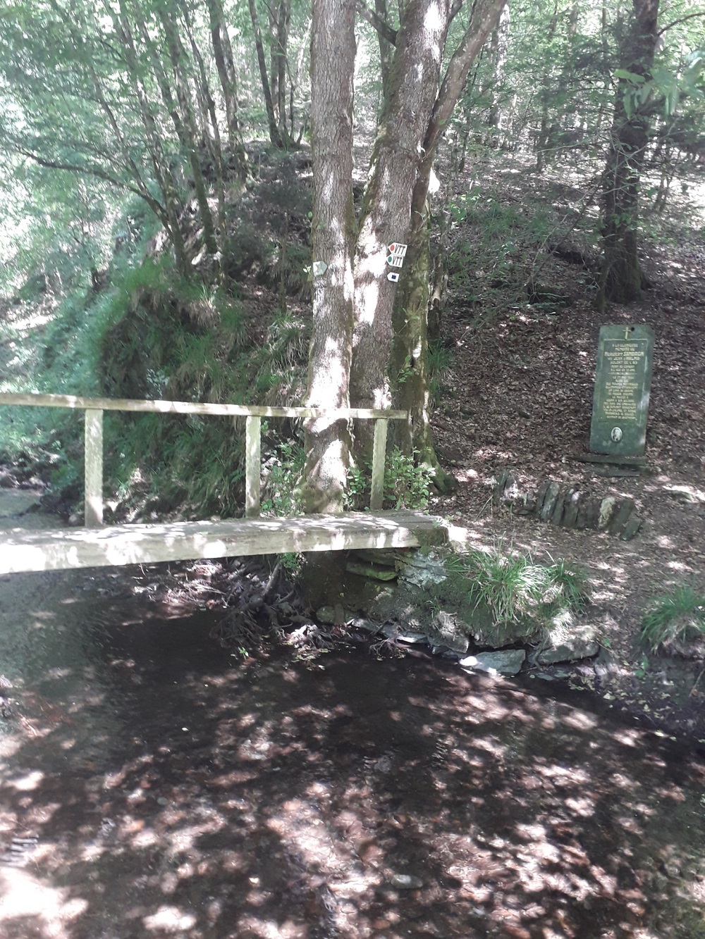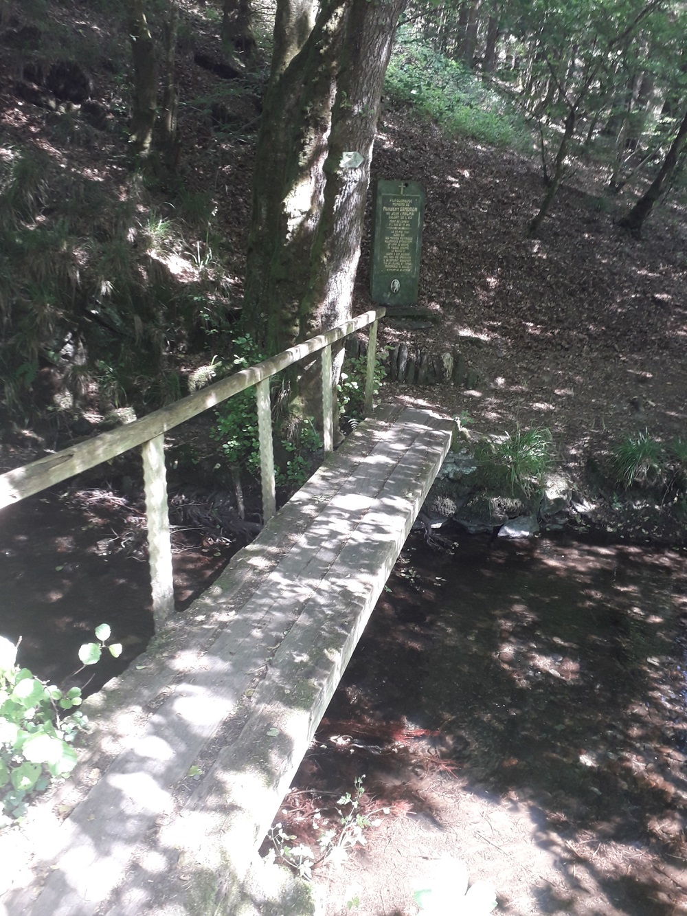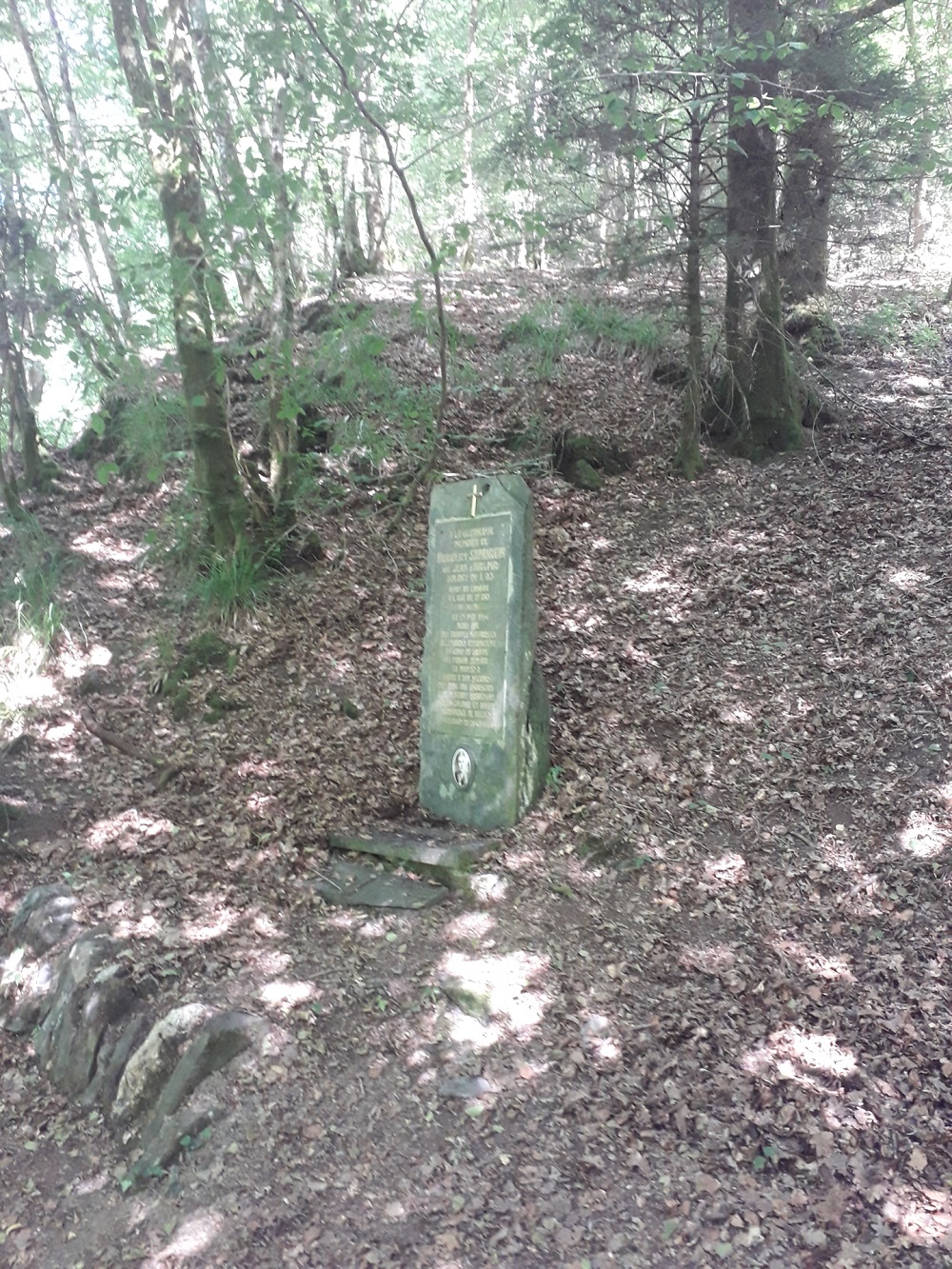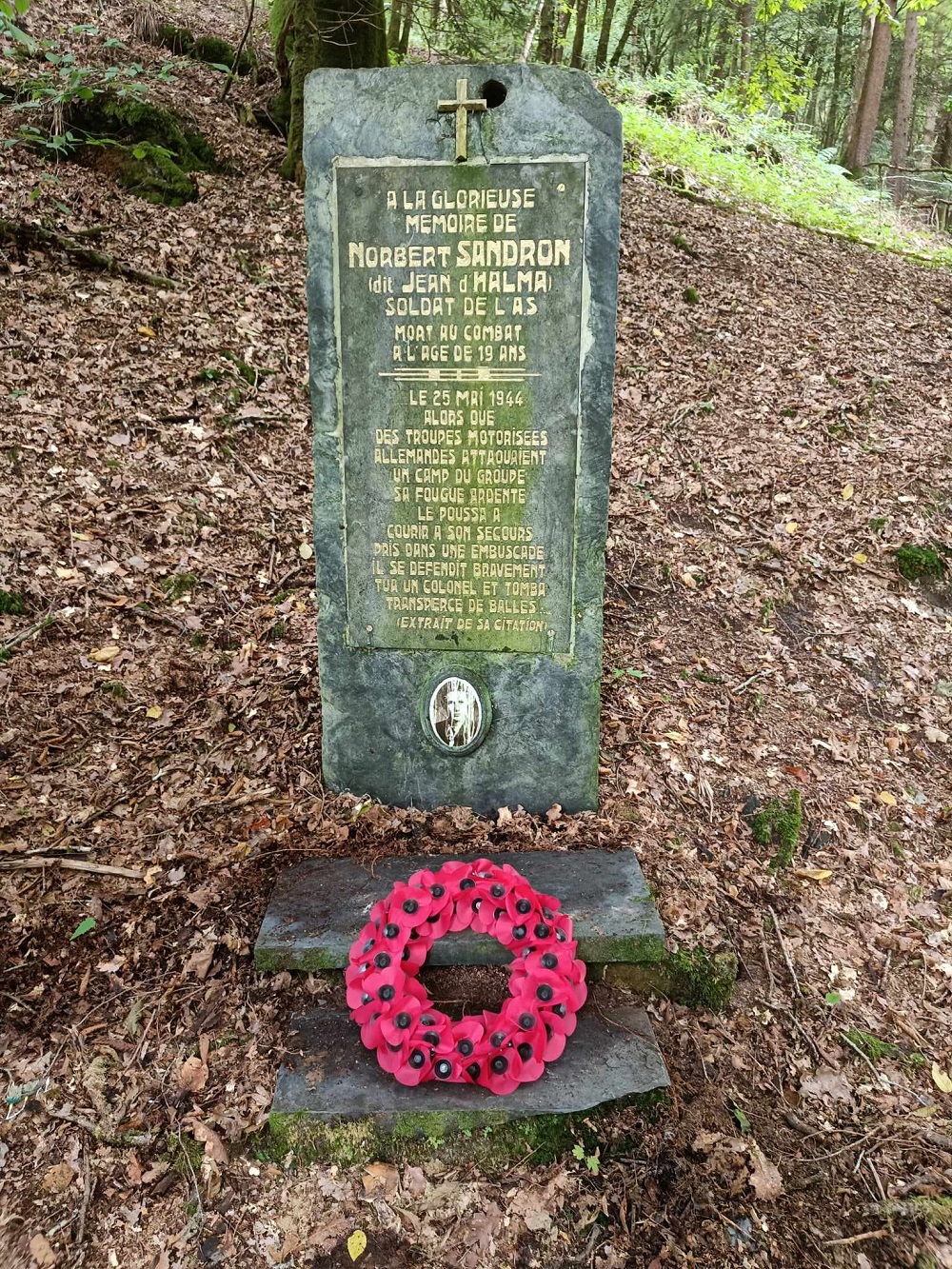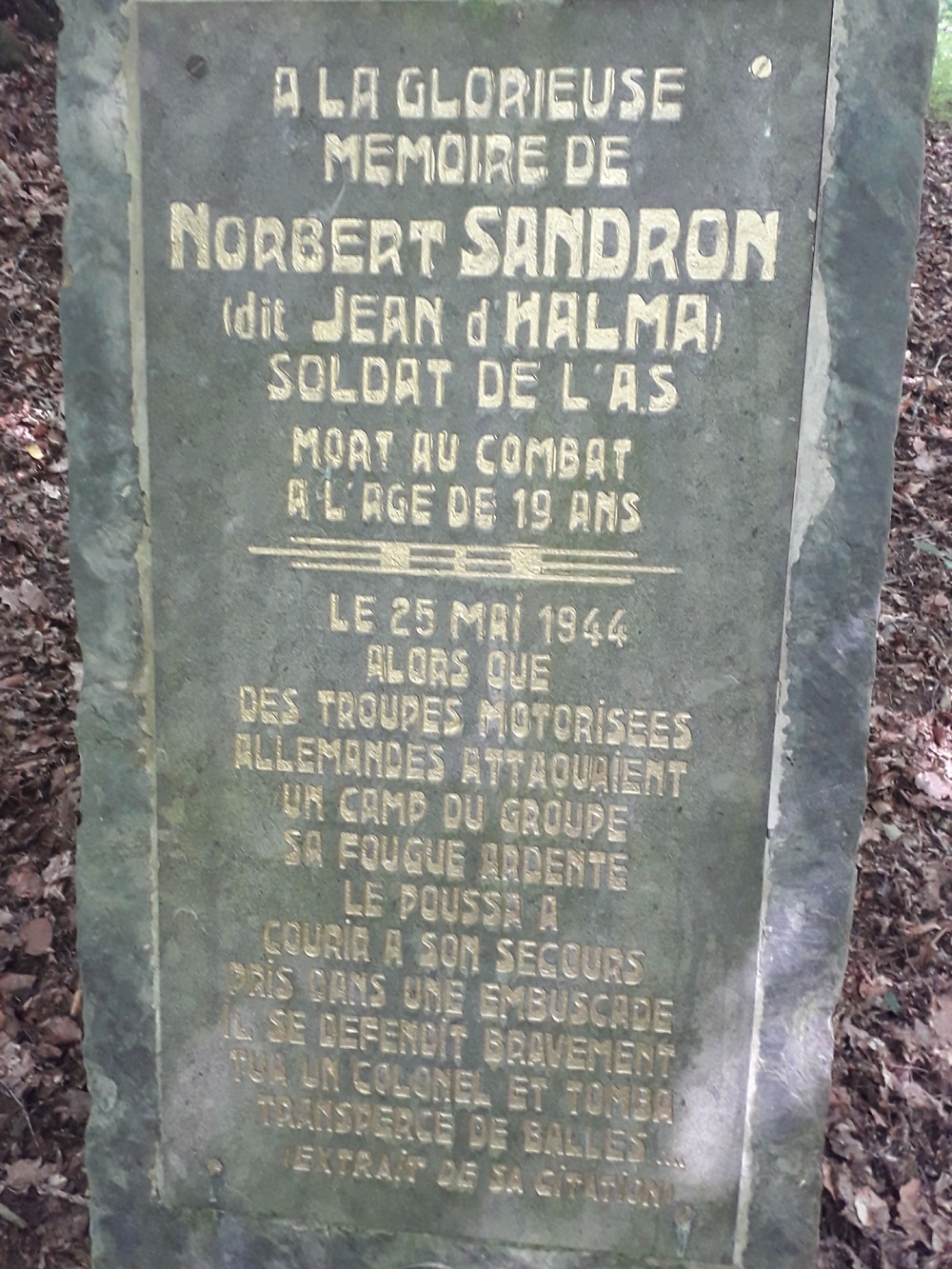 Localisation : Le long de la N914 reliant Vresse-sur-Semois à Petit-Fays, à hauteur de la rue du Château, emprunter à droite une petite passerelle en bois enjambant le ruisseau de Ruaumoulin. La stèle se trouve de l'autre côté du ruisseau dans un bois de feuillus. Coordonnées GPS : +49°52'53.2", +4°56'39.6" Inscriptions "[Croix catholique dorée] À LA GLORIEUSE MÉMOIRE DE NORBERT SANDRON (DIT JEAN D’HALMA) SOLDAT DE L’A.S. MORT AU COMBAT À L’ÂGE DE 19 ANS LE 25 MAI 1944 ALORS QUE DES TROUPES MOTORISÉES ALLEMANDES ATTAQUAIENT UN CAMP DU GROUPE SA FOUGUE ARDENTE LE POUSSA À COURIR À SON SECOURS PRIS DANS UNE EMBUSCADE IL SE DÉFENDIT BRAVEMENT TUA UN COLONEL ET TOMBA TRANSPERCÉ DE BALLES… (EXTRAIT DE SA CITATION) [Médaillon photo de Norbert SANDRON]" Description Plaque commémorative en l'honneur de Norbert SANDRON, dit Jean D’HALMA, tué les troupes allemandes en 1944. Pierre de schiste brute dressée (160 cm H x 65 cm L) sur laquelle est vissée une plaque commémorative (100 cm H x 50 cm L), elle même surmontée d'une croix dorée. Sous la plaque commémorative, une photo en faïence de N. SANDRON de forme ovale. Accès par deux marches de schiste, soutenues par des pierres de schiste sur champs. Plus d'informations concernant cette victime |
