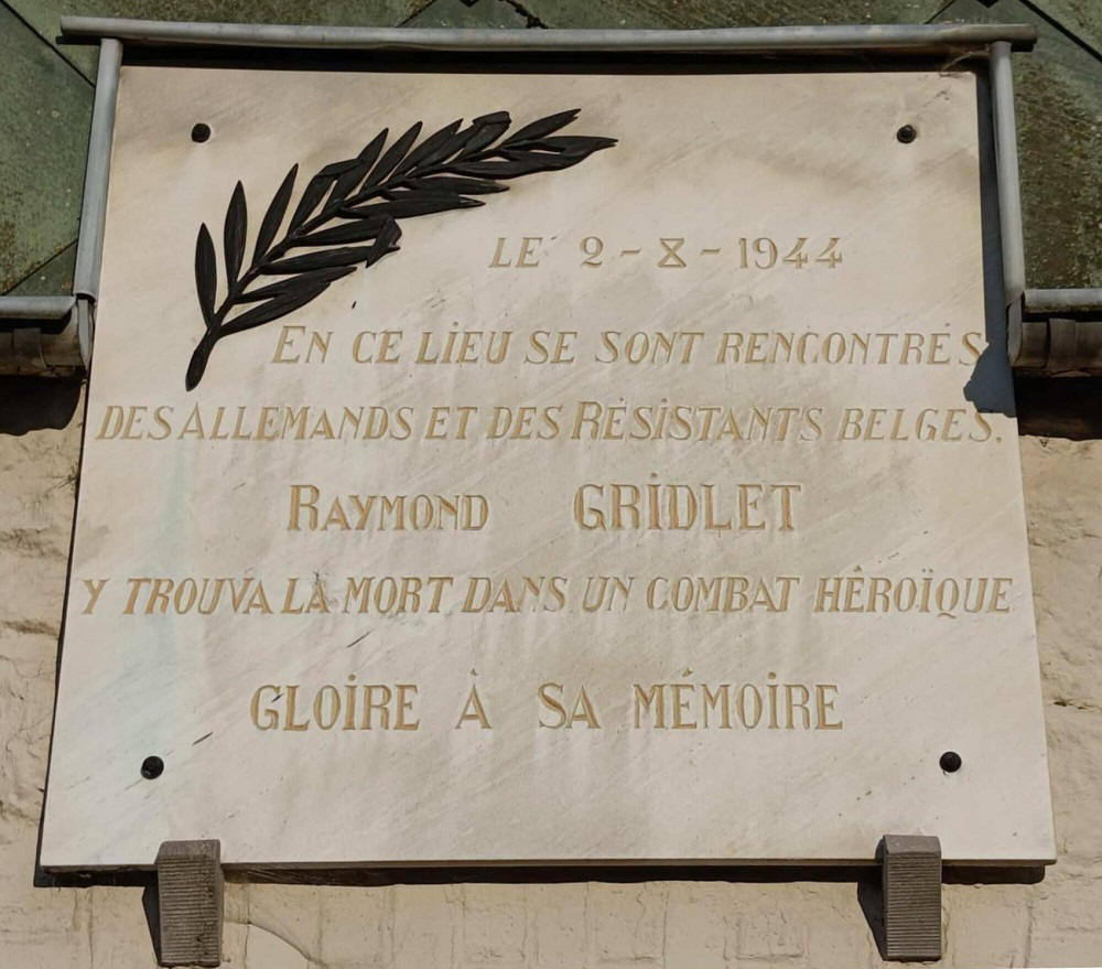 Localisation: Rue Edouard Pisvin, n° 4. Coordonnées GPS: +49°59'33.6", +4°53'05.1" Inscriptions "LE 2 - 8 - 1944 EN CE LIEU SE SONT RENCONTRÉS DES ALLEMANDS ET DES RÉSISTANTS BELGES. RAYMOND GRIDLET Y TROUVA LA MORT DANS UN COMBAT HÉROÏQUE GLOIRE À SA MÉMOIRE" Plus d'informations concernant cette victime |