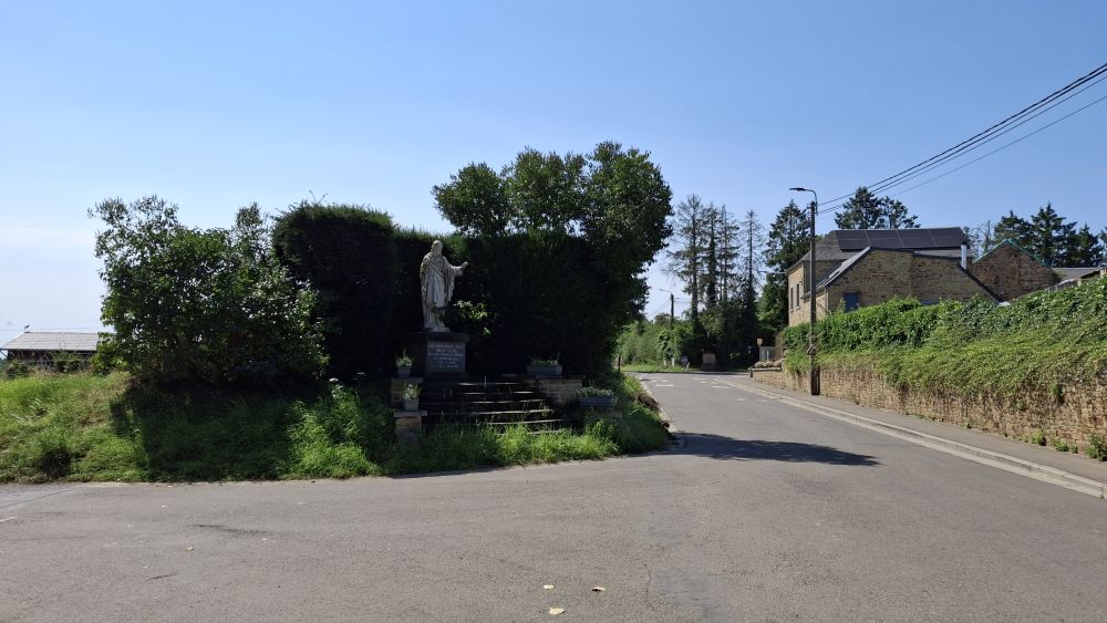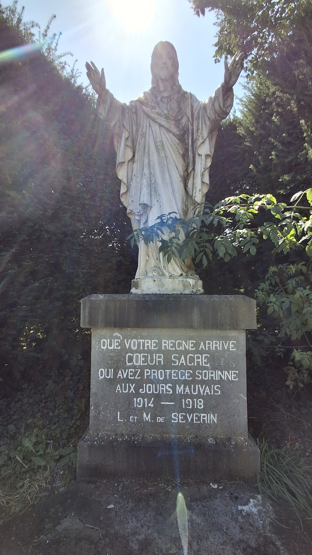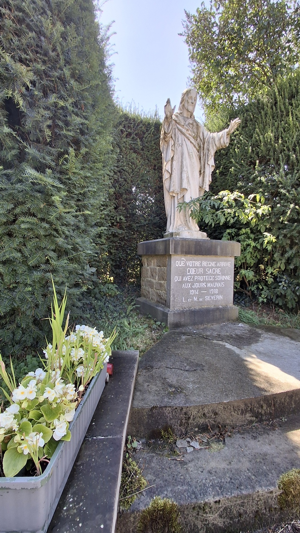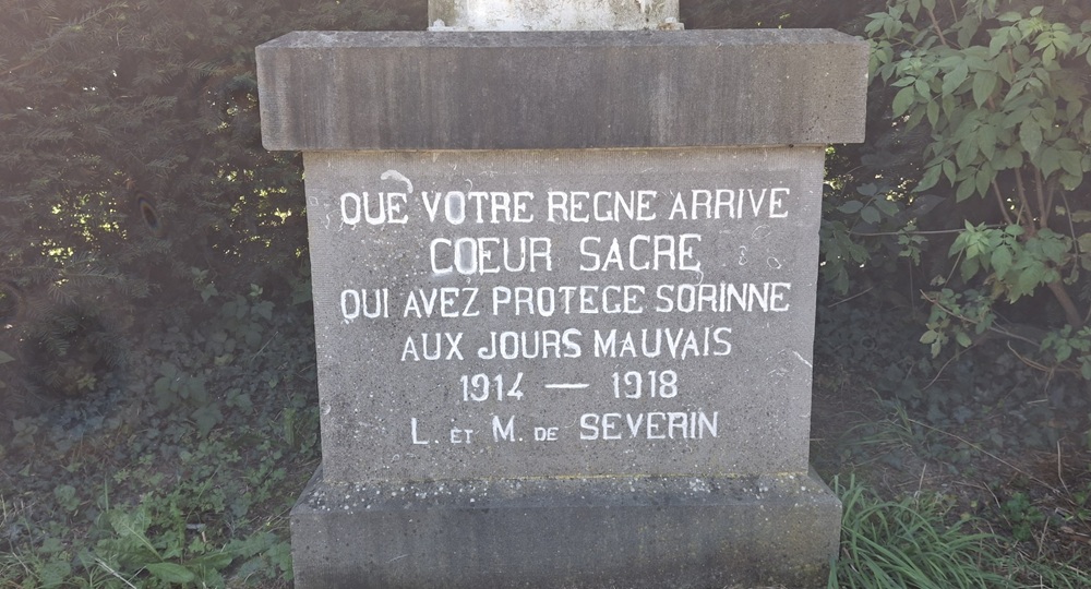 Localisation: Au coin de la Rue du Centre et d'une petite route sans nom qui mène vers Assesse. Coordonnées GPS: +50°23'17.3", +5°01'19.5" Inscriptions "QUE VOTRE RÈGNE ARRIVE CŒUR SACRÉ QUI AVEZ PROTÉGÉ SORINNE AUX JOURS MAUVAIS 1914 - 1918 L. ET M. DE SEVERIN" Ce monument ne comporte pas de noms de victimes de guerre |