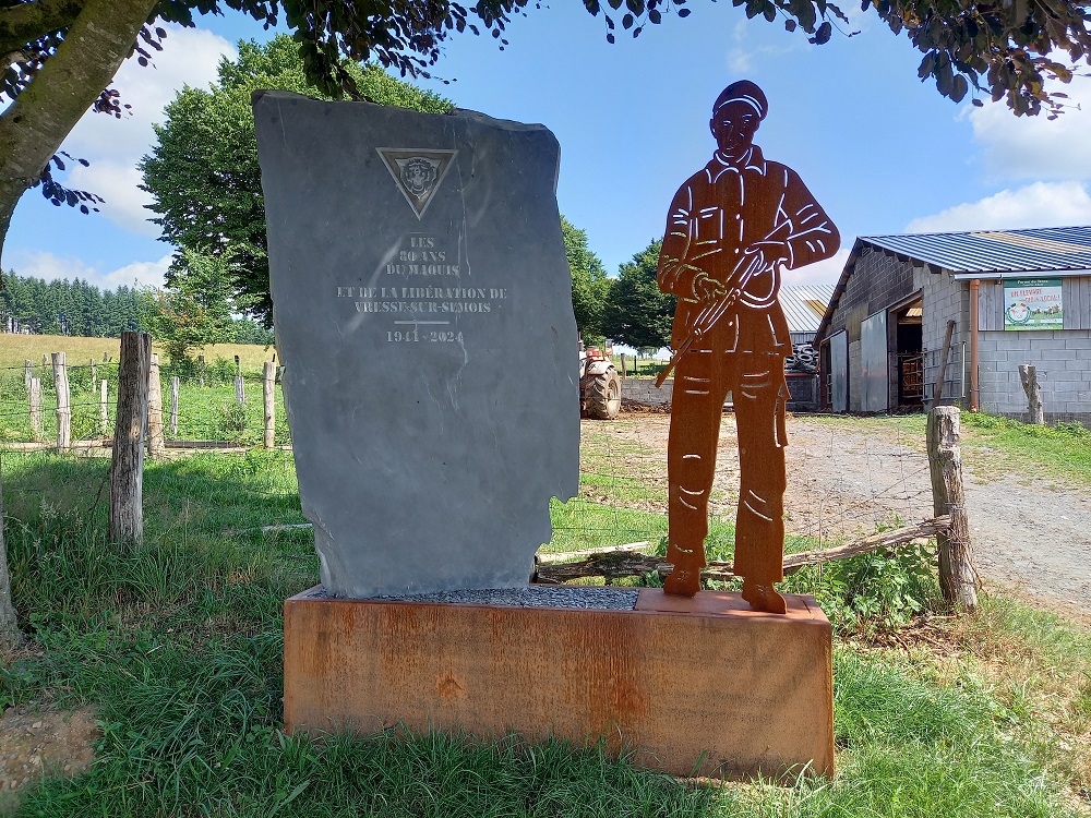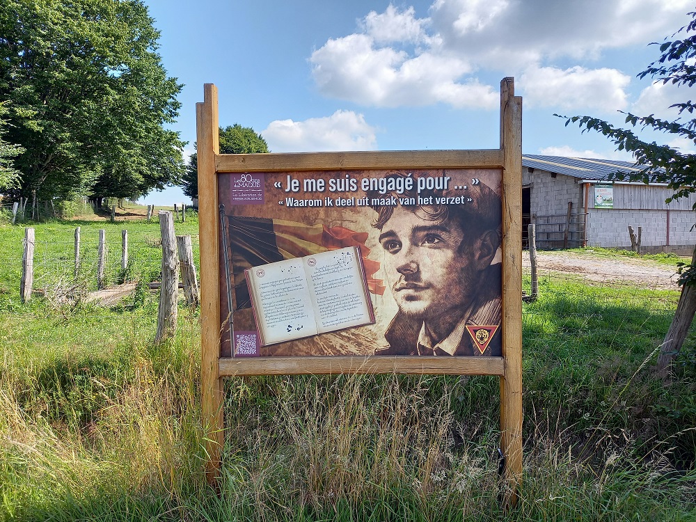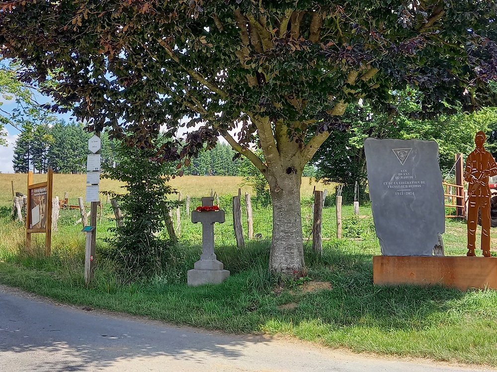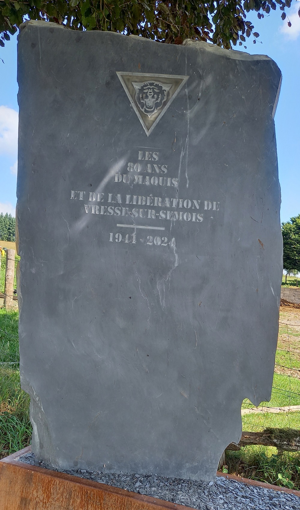 Localisation: Cense Renaud, intersection Hameau de Conrad, Rue de la Chapelle et Le Terne. Coordonnées GPS: +49°53'04.0", +4°55'07.9" Inscriptions (de droite à gauche) Représentation d'un maquisard Ce monument ne comporte pas d'inscription. Pierre levée en schiste "[Écusson de l'armée secrète"] LES 80 ANS DU MAQUIS ET DE LA LIBÉRATION DE VRESSE-SUR-SEMOIS 1944 - 2024" Croix à la mémoire de Richard SCHALLENBERG(H) Cette croix fait l'objet d'une page distincte. Panneau d'information Je me suis engagé par patriotisme pour m'opposer à l'oppression fasciste des Nazis. J'étais animé/e par le goût pour la liberté, la justice, l'attrait pour la démocratie ainsi que le sens de la solidarité. Alors que les conditions de vie se dégradaient à cause du rationnement imposé par l'occupant, je m'opposais également à la mise en place du travail obligatoire en Allemagne ainsi qu'aux déportations, je soutenais tous ceux qui venaient se cacher dans nos forêts pour y échapper. Ik ging bij het verzetsleger uit vaderlandsliefde om tegen de fascistische onderdrukking van de nazi's op te komen. Ik werd gemotiveerd door een voorliefde voor vrijheid, rechtvaardigheid en democratie alsook door een gevoel van solidariteit. In een tijd waarin de levensomstandigheden verslechterden door de rantsoenering die door de bezetter werd opgelegd, protesteerden ze ook tegen de bezuinigingsmaatregelen, de uitvoering van de dwangarbeider en de deportaties naar Duitsland. Ze steunden ook iedereen die in de bossen waren ondergedoken om te ontsnappen. Informations complémentaires - Page Facebook "Commémoration des 80 ans du Maquis et de la Libération de Vresse-sur-Semois" (nombreuses photos et vidéos). - Les 80 ans du maquis et de la libération de Vresse-sur-Semois : Rétrospective de la journée du 31 août 2024. Ces monuments (à l'exception de la croix à la mémoire de Richard SCHALLENBERG(H) ne comportent pas de noms. |
