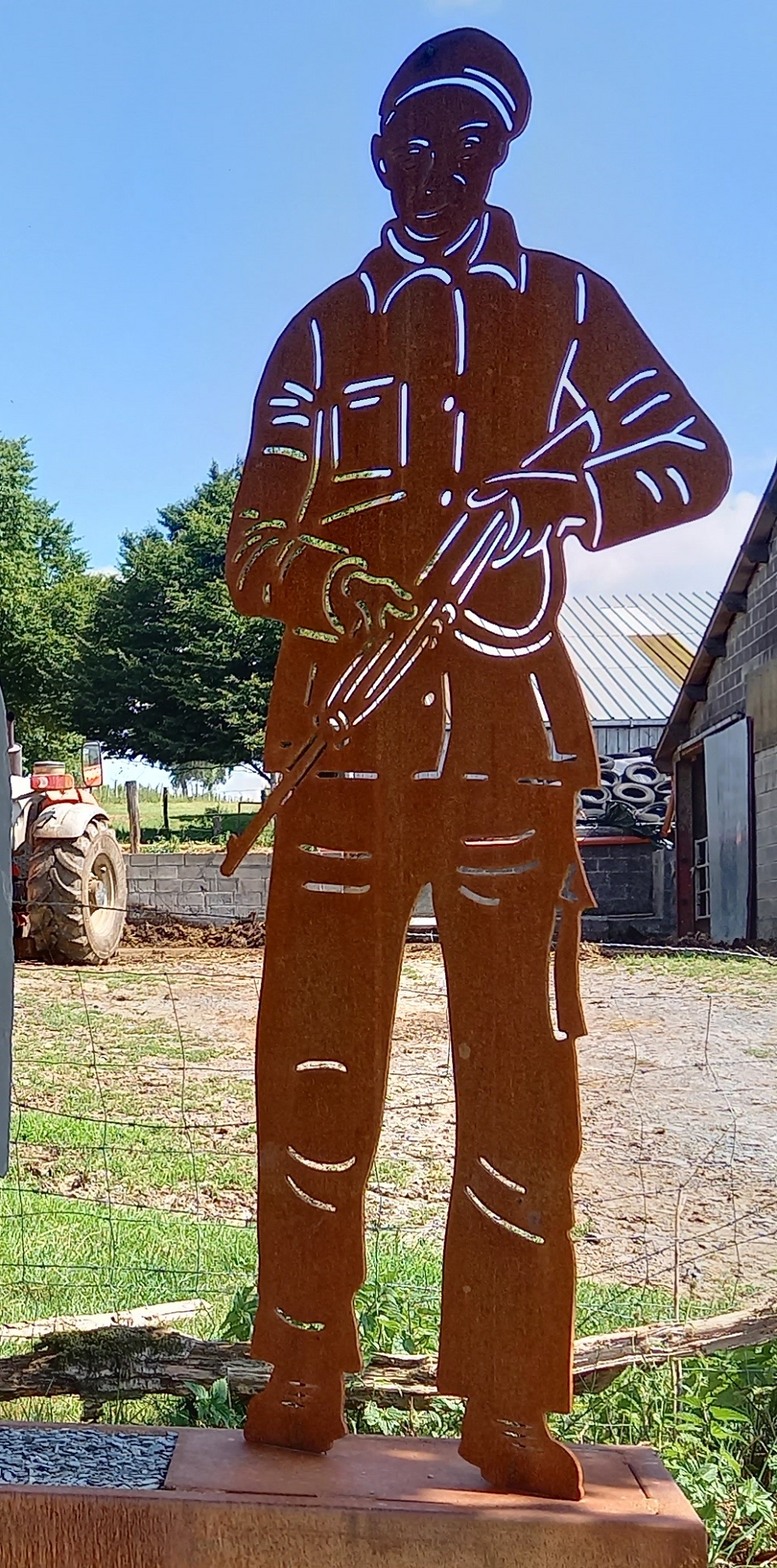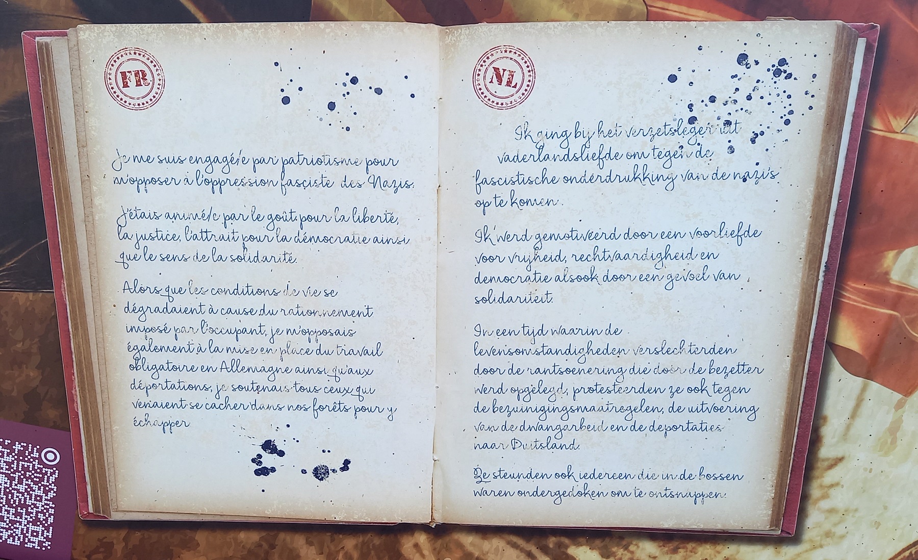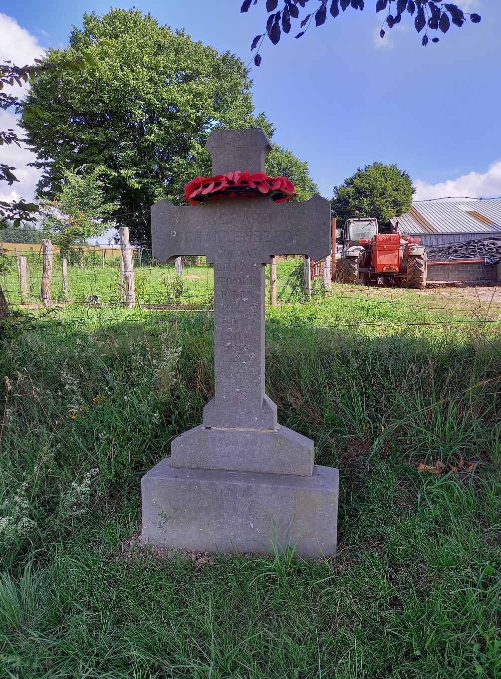 Localisation: Cense Renaud, intersection Hameau de Conrad, Rue de la Chapelle et Le Terne. Coordonnées GPS: +49°53'04.0", +4°55'07.9" Inscriptions (de droite à gauche) Représentation d'un maquisard Ce monument ne comporte pas d'inscription. Pierre levée en schiste "[Écusson de l'armée secrète"] LES 80 ANS DU MAQUIS ET DE LA LIBÉRATION DE VRESSE-SUR-SEMOIS 1944 - 2024" Croix à la mémoire de Richard SCHALLENBERG(H) Cette croix fait l'objet d'une page distincte. Panneau d'information Je me suis engagé par patriotisme pour m'opposer à l'oppression fasciste des Nazis. J'étais animé/e par le goût pour la liberté, la justice, l'attrait pour la démocratie ainsi que le sens de la solidarité. Alors que les conditions de vie se dégradaient à cause du rationnement imposé par l'occupant, je m'opposais également à la mise en place du travail obligatoire en Allemagne ainsi qu'aux déportations, je soutenais tous ceux qui venaient se cacher dans nos forêts pour y échapper. Ik ging bij het verzetsleger uit vaderlandsliefde om tegen de fascistische onderdrukking van de nazi's op te komen. Ik werd gemotiveerd door een voorliefde voor vrijheid, rechtvaardigheid en democratie alsook door een gevoel van solidariteit. In een tijd waarin de levensomstandigheden verslechterden door de rantsoenering die door de bezetter werd opgelegd, protesteerden ze ook tegen de bezuinigingsmaatregelen, de uitvoering van de dwangarbeider en de deportaties naar Duitsland. Ze steunden ook iedereen die in de bossen waren ondergedoken om te ontsnappen. Informations complémentaires - Page Facebook "Commémoration des 80 ans du Maquis et de la Libération de Vresse-sur-Semois" (nombreuses photos et vidéos). - Les 80 ans du maquis et de la libération de Vresse-sur-Semois : Rétrospective de la journée du 31 août 2024. Ces monuments (à l'exception de la croix à la mémoire de Richard SCHALLENBERG(H) ne comportent pas de noms. |
