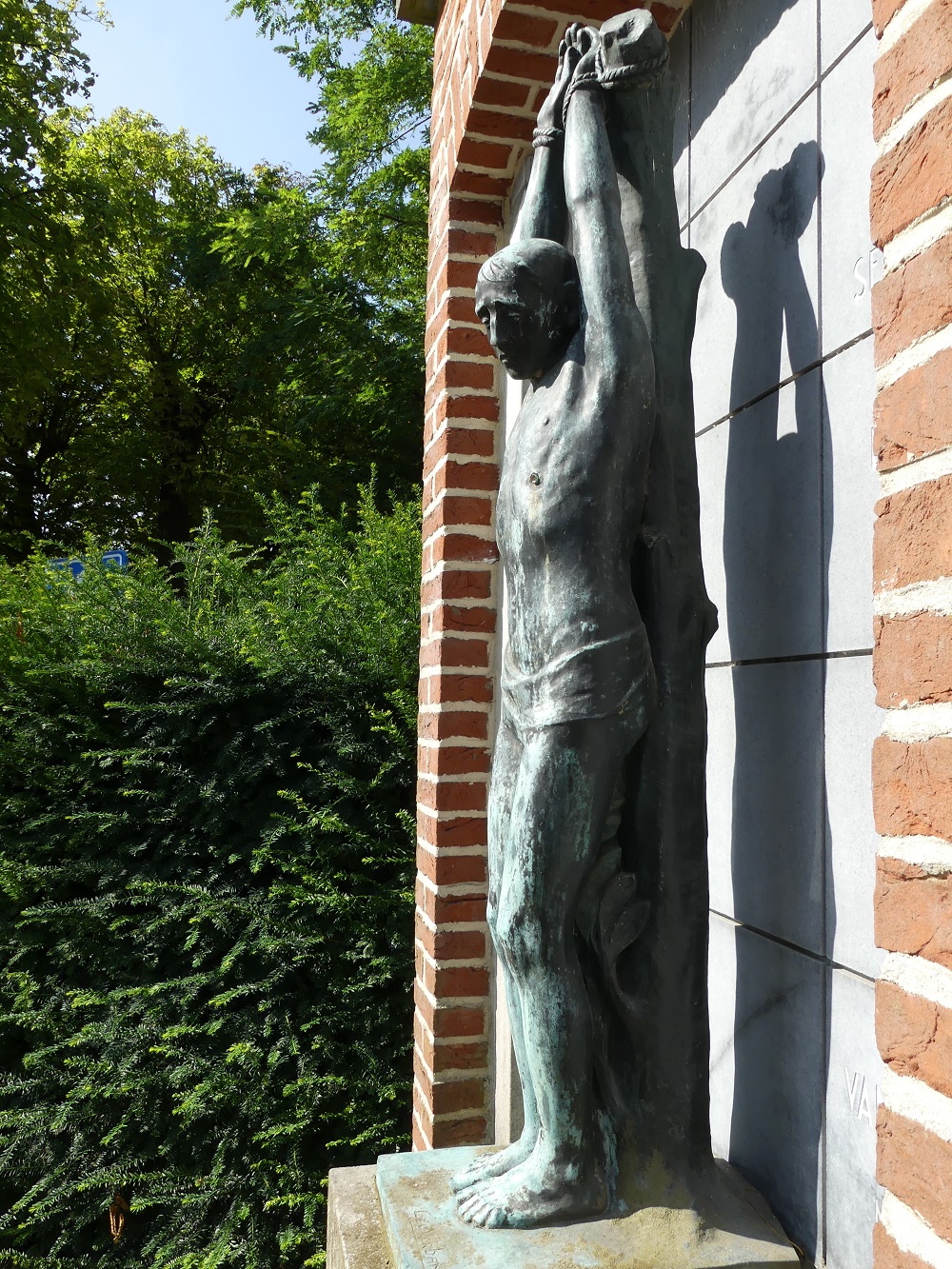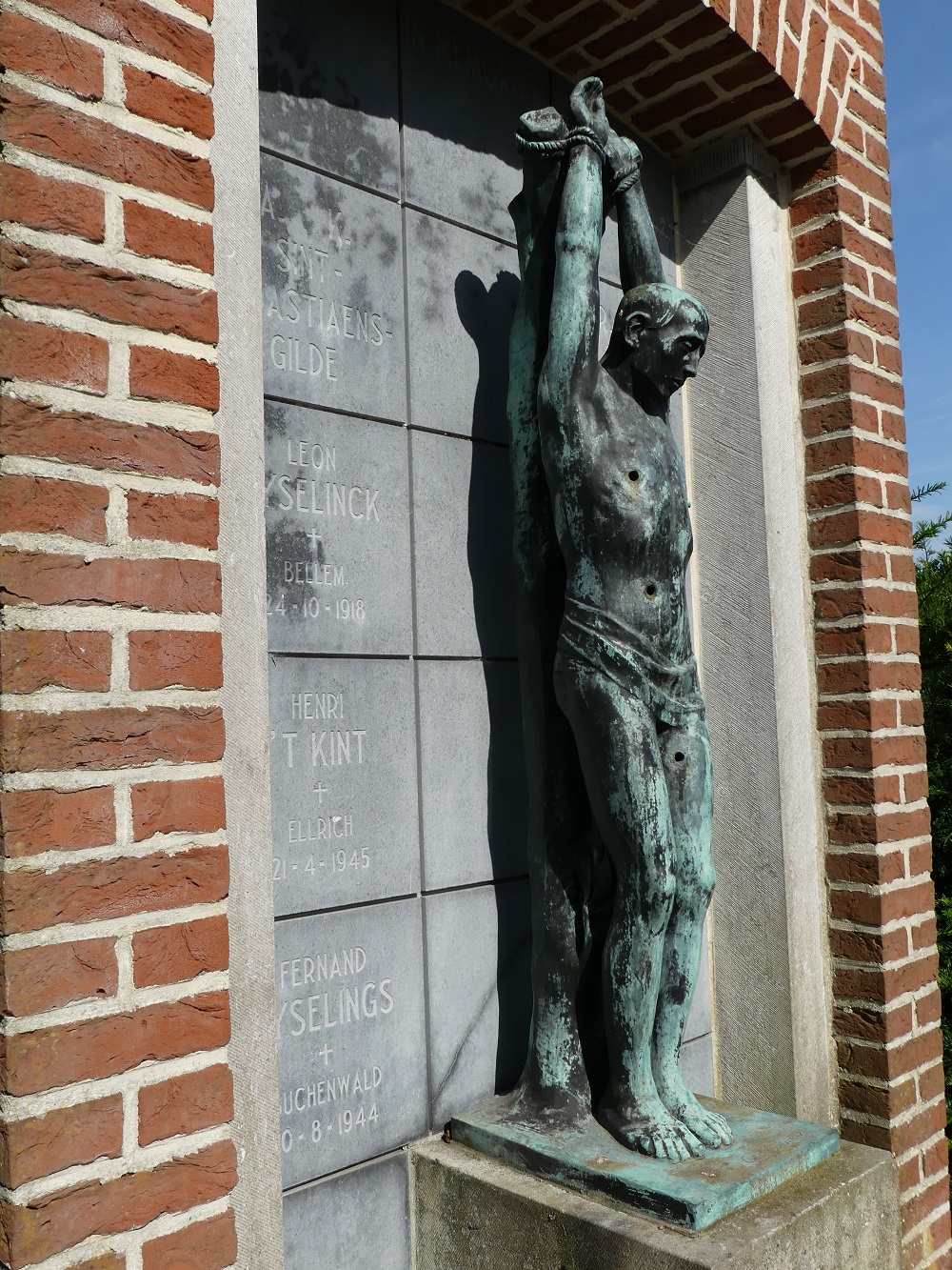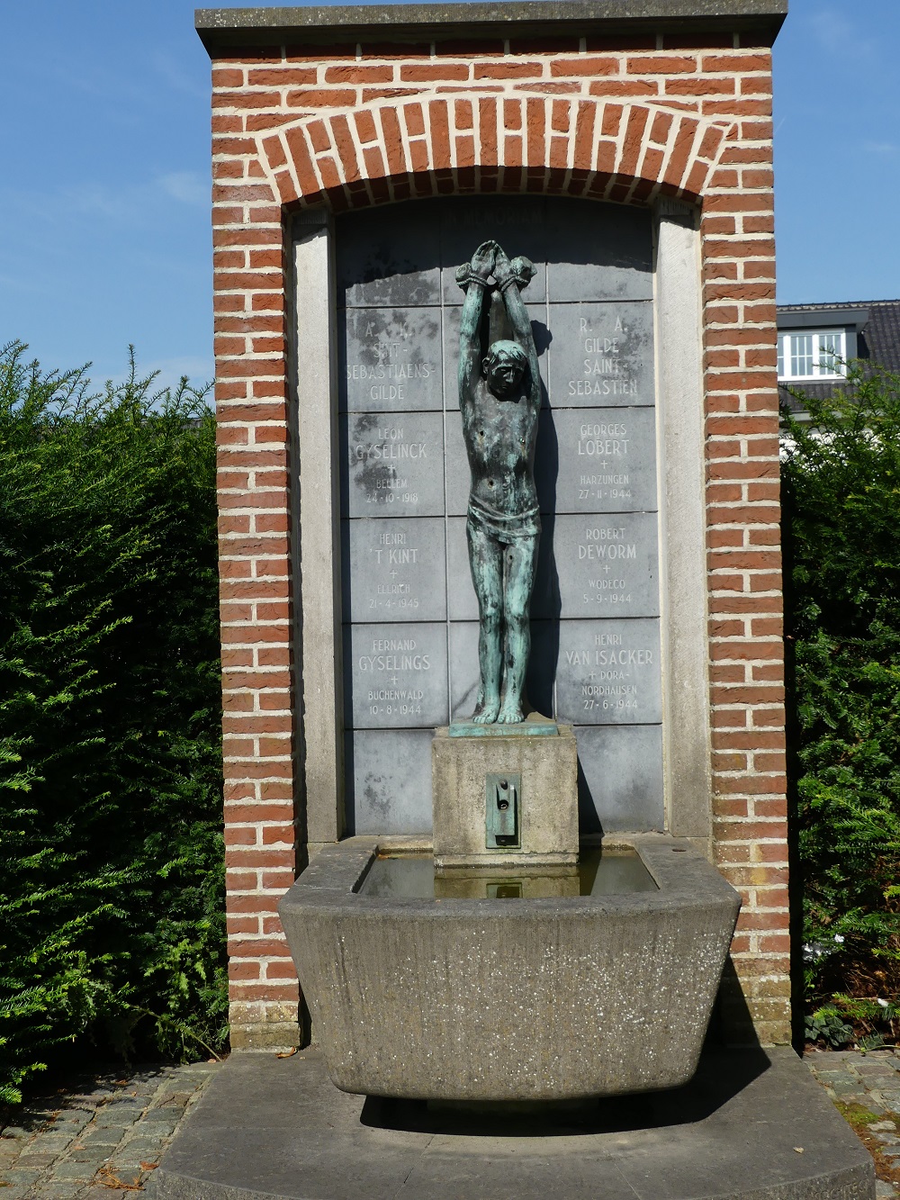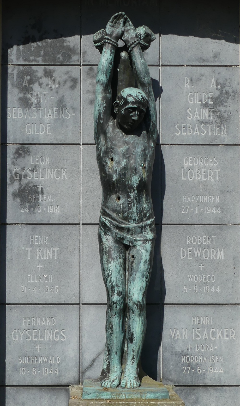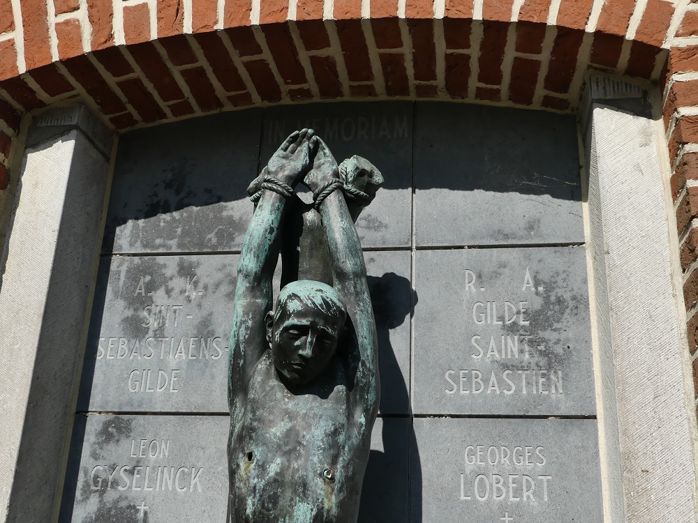 Ligging - Localisation: Antonia Depoorterplein, kruising Bruul en Sint-Pietersnieuwstraat. Antonia Depoorterplein, croisement Bruul et rue Neuve Saint-Pierre. GPS-coördinaten - Coordonnées GPS: +50°45'02.2", +3°36'09.7" Opschriften - Inscriptions "IN MEMORIAM A.K. [Aloude koninklijke] SINT - SEBASTIAENS - GILDE R.A. [Royale antique] GILDE SAINT - SÉBASTIEN [Zes namen, waarvan één slachtoffer van 1914-1918 et vijf van 1940-1945, noch alfabetisch noch chronologisch gerangschikt, met vermelding van overlijdensplaats en -datum] [Six noms, dont une victime de 1914-1918 et cinq de 1940-1945, ni classés par ordre alphabétique ni par ordre chronologique, avec mention du lieu et de la date de décès]" Beschrijving - Description Het oorlogsgedenkteken voor de omgekomen gildebroeders van de Sint-Sebastiaansgilde uit beide Wereldoorlogen omvat een fontein en een bronzen Sint-Sebastiaansbeeld, geflankeerd door de namen van de doden. Het geheel is gevat in een bakstenen omlijsting (Bron [100]). Le monument aux frères de la guilde Saint-Sébastien morts pendant les deux guerres mondiales comprend une fontaine et une statue en bronze de saint Sébastien, flanquée des noms des morts. L'ensemble est enchâssé dans un cadre en briques (Traduction du texte de la source [100]). Beeldhouwer - Sculpteur: Geo VERBANCK (gesigneerd - signé). Architect - Architecte: Edg. LELUBRE (gesigneerd - signé). Bijkomende informatie - Informations complémentaires Sint-Sebastiaan is de beschermheilige van boogschietverenigingen, gilden en eden. De reden hiervoor ligt in zijn executie tijdens het Romeinse Rijk in 288. Deze soldaat werd beschuldigd van aanhang van het christendom en werd door Diocletianus veroordeeld tot het doorboren van zijn lichaam met pijlen, afgevuurd door Moorse boogschutters (Bron: site BE-Monumen; vertaling uit het Frans). Saint Sébastien est le patron des sociétés, guildes et autres serments d’archers. La raison est à chercher dans son exécution sous l’Empire romain en 288. Ce militaire est accusé de soutenir la religion chrétienne et est condamné par Dioclétien à avoir le corps transpercé de flèches tirées par des archers Maures (Source: site BE-Monumen). Zie namen op het monument - Voir les noms mentionnés sur le monument |