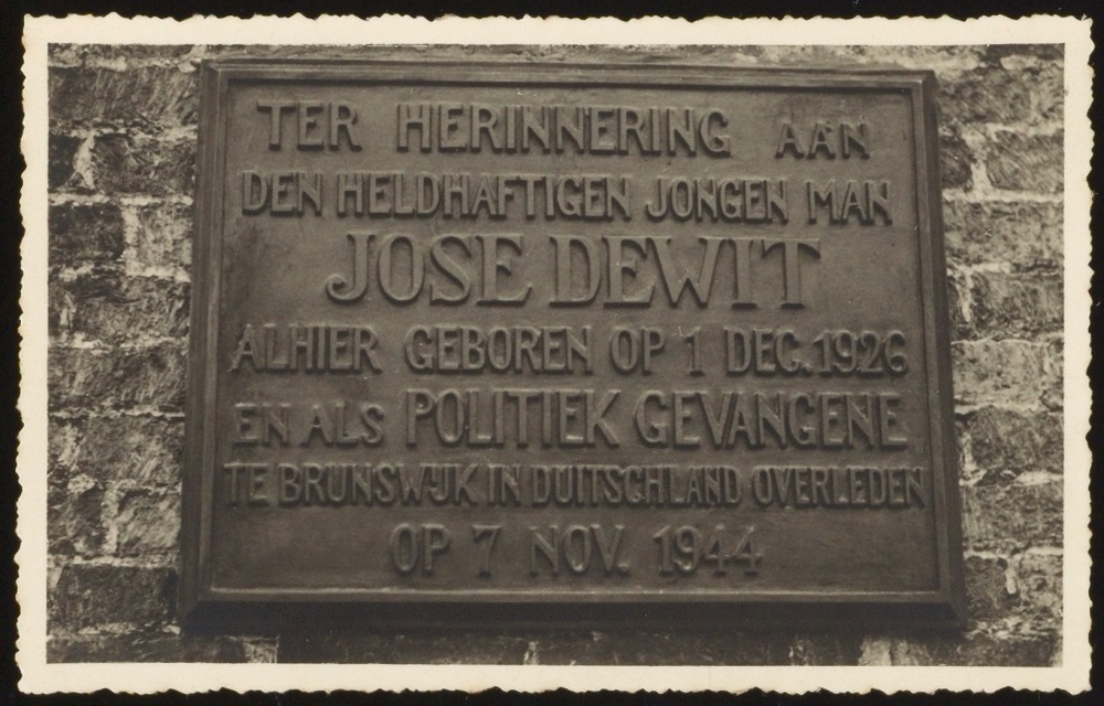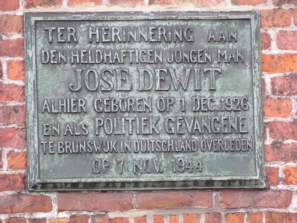 Ligging: Schaarstraat 88. GPS-coördinaten: +51°12'24.9", +3°14'03.3" Opschriften "TER HERINNERING AAN DEN HELDHAFTIGEN JONGEN MAN JOSE DEWIT ALHIER GEBOREN OP 1 DEC. 1926 EN ALS POLITIEK GEVANGENE TE BRUNSWIJK IN DUITSCHLAND OVERLEDEN OP 7 NOV. 1944" Bijkomende informatie over dit slachtoffer