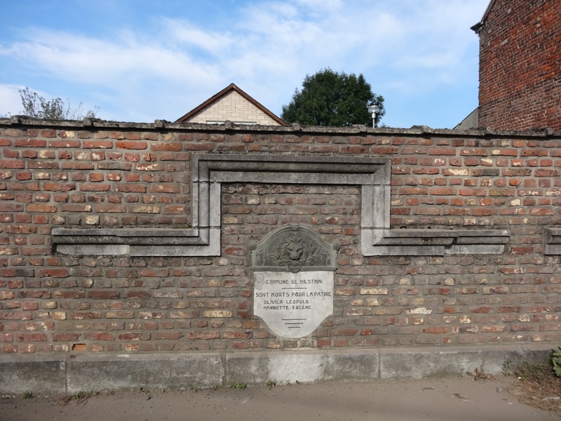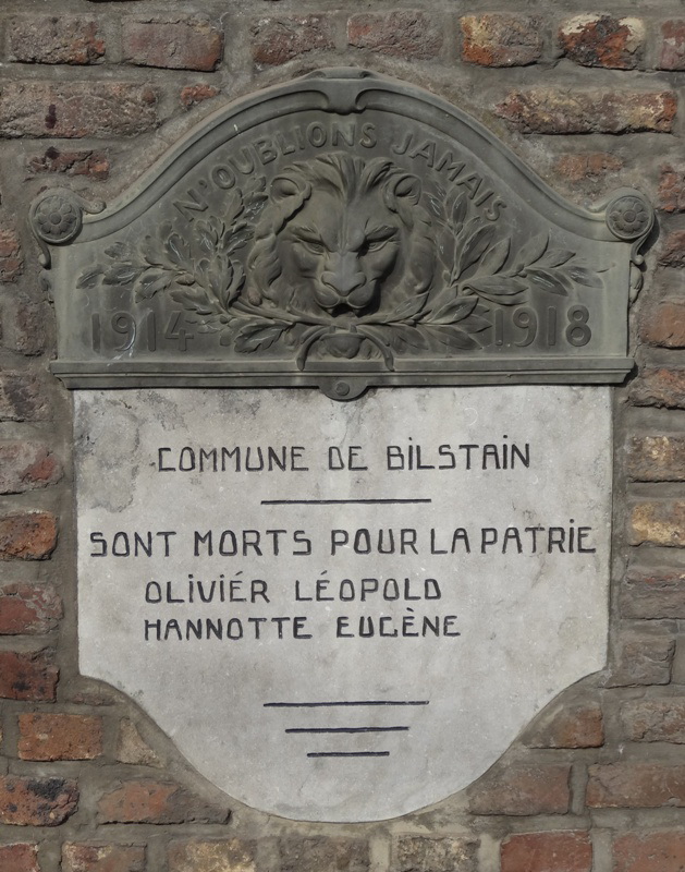 Localisation: Au Pairon, sur le mur d'enceinte de l'école communale fondamentale. Coordonnées GPS: +50°37'31.15", +5°55'09.93" Inscriptions "N'OUBLIONS JAMAIS 1914 - 1918 COMMUNE DE BILSTAIN SONT MORTS POUR LA PATRIE [Deux noms, non classés par ordre alphabétique]" Voir les noms mentionnés sur cette stèle |