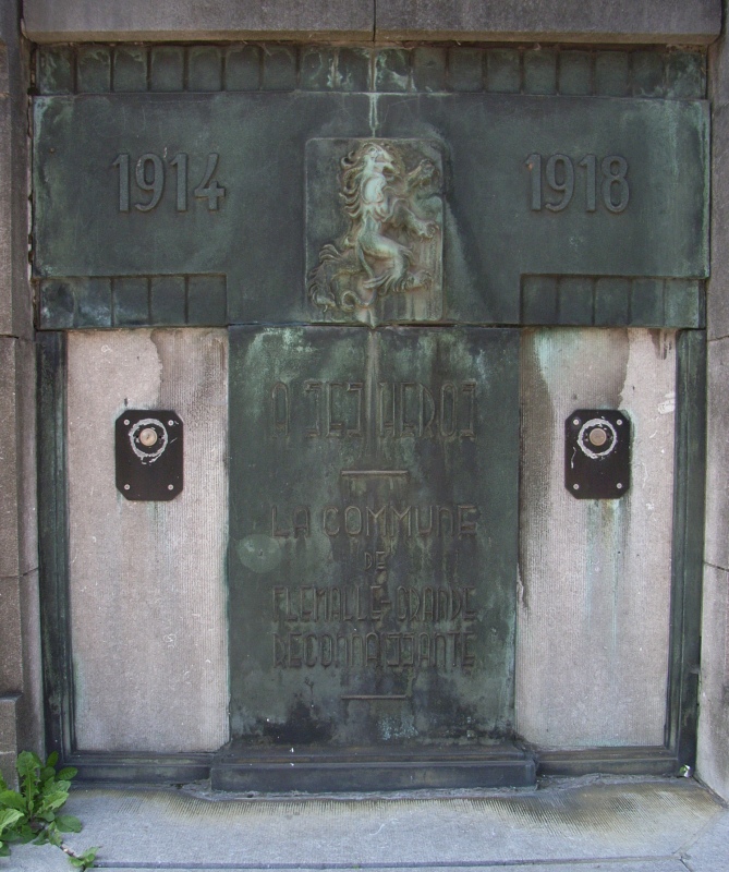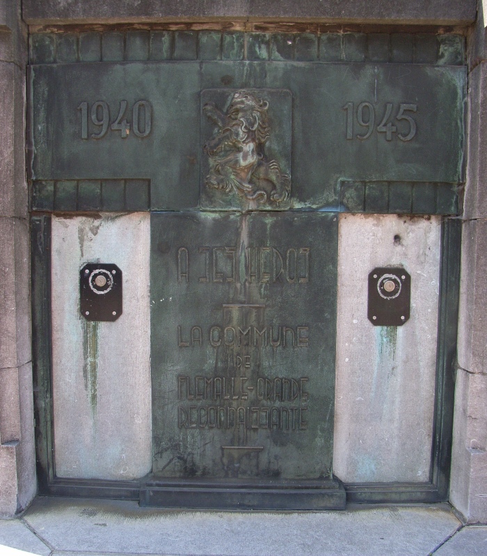 Localisation de ce monument: Rue de Flémalle-Grande, de part et d'autre de l'entrée de l'ancien hôtel communal. Coordonnées GPS: +50°36'18.74", +5°28'49.29" Inscriptions figurant sur le monument À gauche de l'escalier [Lion héraldique tourné vers l'escalier] "1940 - 1945 À SES HÉROS LA COMMUNE DE FLÉMALLE-GRANDE RECONNAISSANTE" À droite de l'escalier [Lion héraldique tourné vers l'escalier] "1914 - 1918 À SES HÉROS LA COMMUNE DE FLÉMALLE-GRANDE RECONNAISSANTE" Informations complémentaires: Matériaux: deux grandes plaques en bronze, placées dans une architecture en petit granit Hauteur: 3 m (Source [276]) Ce monument ne comporte pas de noms |