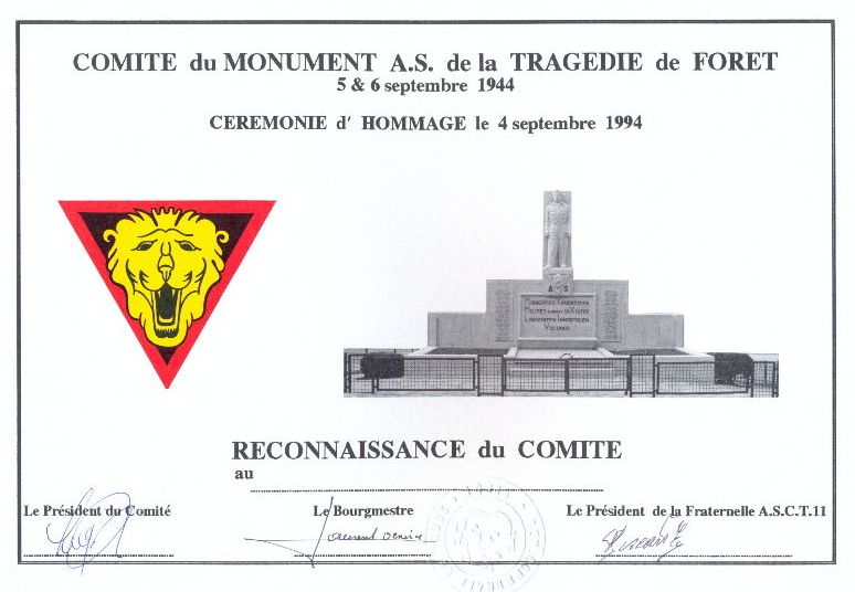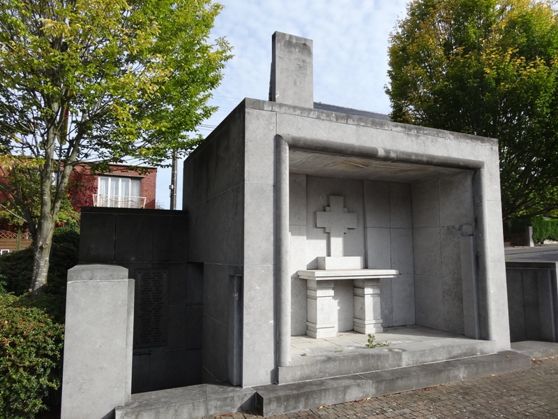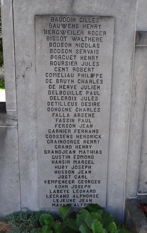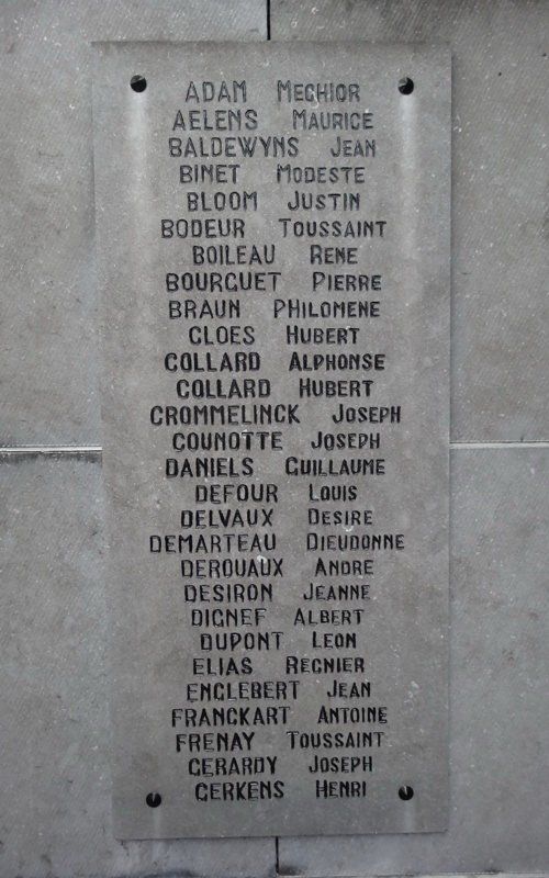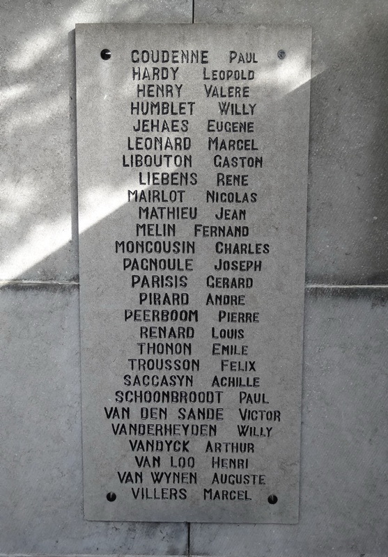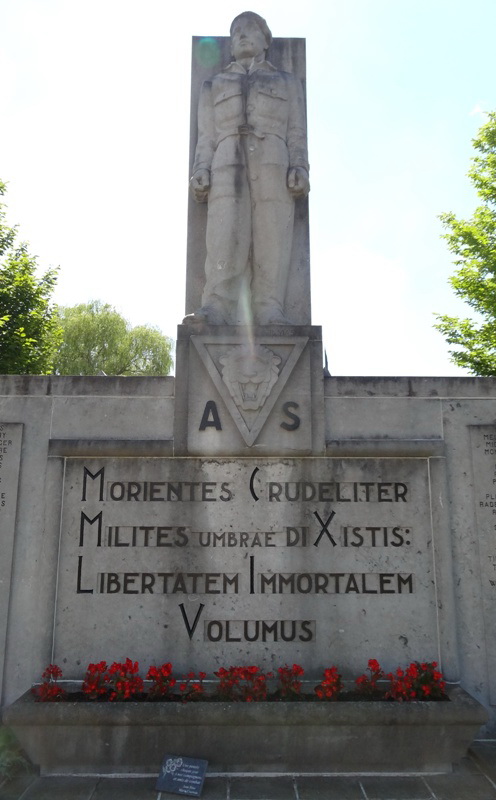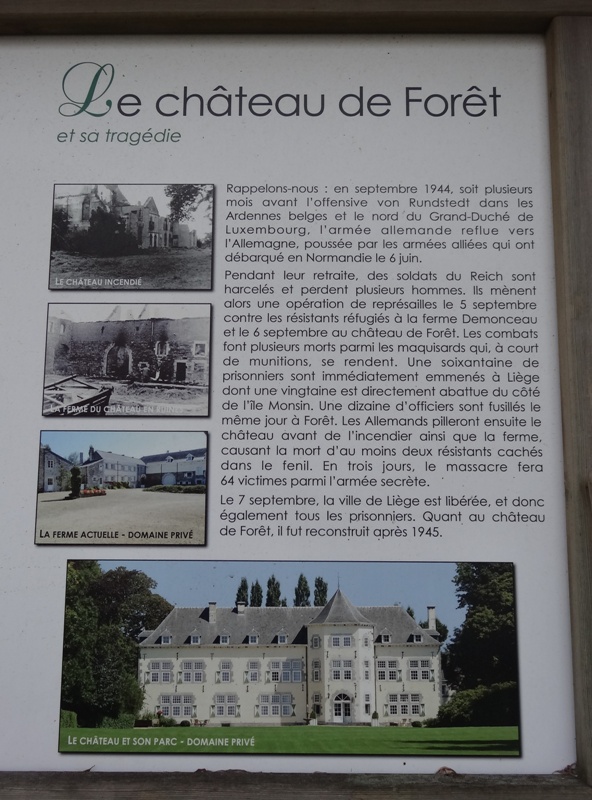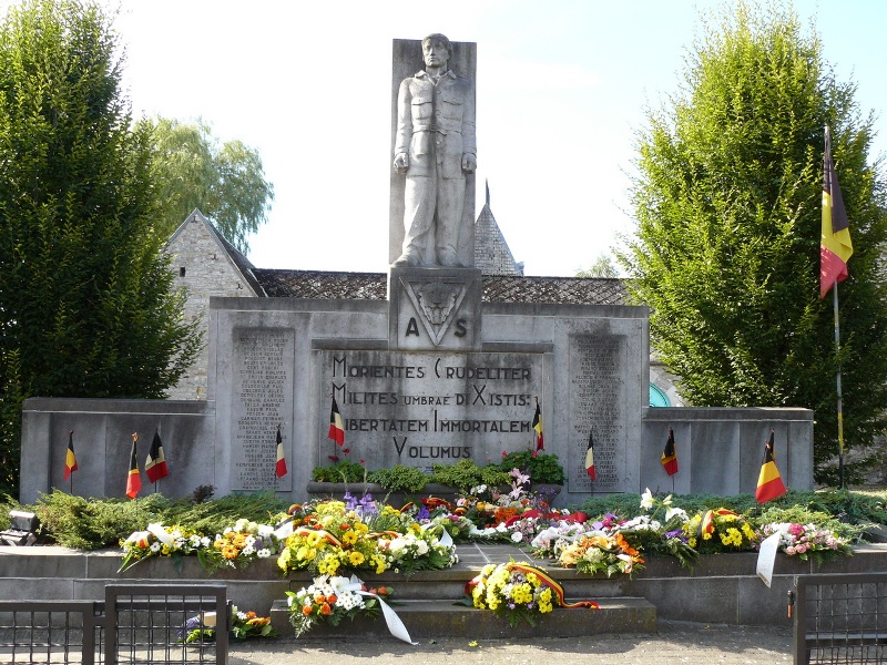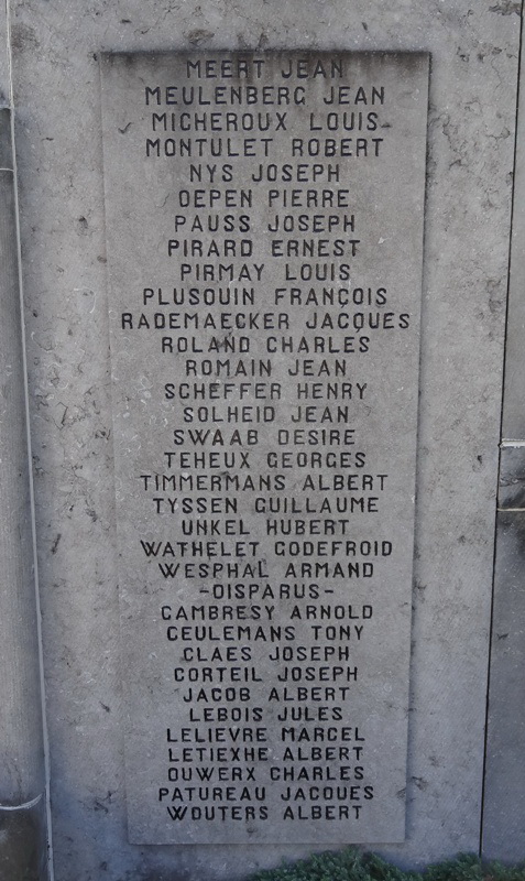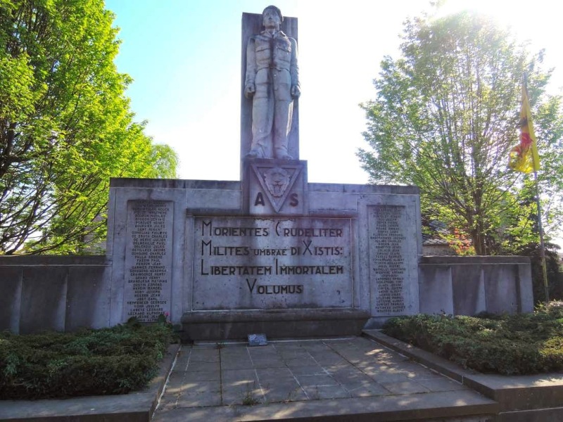 Localisation: Place François Piscart, le long de la Rue Forêt-Village. Coordonnées GPS: +50°35'01.10", +5°41'53.82" Inscriptions À l'avant du monument Partie centrale "AS MORIENTES CRUDELITER MILITES UMBRAE DIXISTIS LIBERTATEM IMMORTALEM VOLUMUS Ce qui signifie: EN MOURANT D'UNE MANIÈRE CRUELLE SOLDATS DE L'OMBRE, VOUS AVEZ DIT: NOUS VOULONS UNE LIBERTÉ IMMORTELLE" Plaque à gauche "[Trente-cinq noms, classés par ordre alphabétique]" Plaque à droite "[Vingt-deux noms, classés par ordre alphabétique] DISPARUS [Onze noms, classés par ordre alphabétique]" Petite plaque en marbre posée devant le monument "UNE PENSÉE CHAQUE JOUR À NOS COMPAGNONS ET AMIS DE COMBAT JEAN STINE MARIE COURTOIS" À l'arrière du monument Plaque de gauche "[Vingt-huit noms, classés par ordre alphabétique sauf un]" Plaque dans la crypte "ICI REPOSENT ONZE MAQUISARDS A.S. NON IDENTIFIÉS MORTS POUR LA PATRIE ET LA LIBERTÉ" Plaque de droite "[Vingt-sept noms, classés par ordre alphabétique sauf un]" Informations complémentaires En septembre 1944, alors que la Belgique est en train d'être libérée par les forces alliées, les nazis se livrent à de dernières atrocités. Une politique de terre brûlée dont les civils seront les principales victimes. Le village de Forêt, en province de Liège, aux abords du plateau de Herve, va être le lieu de l'un de ces actes terroristes. Un groupe de résistants de l'Armée Secrète, dont le quartier général se trouve dans les murs du château de Forêt, va faire l'objet de terribles représailles au mépris de toutes les règles de la guerre. Le monument rappelle les événements des 5 et 6 septembre 1944 et fut bâti en mai 1949 par l'architecte Joseph GODRON, l'entrepreneur L. GODRON, le tailleur de pierre J. LEDUC et Robert MASSART, un artiste de chez nous. Le monument-crypte fut conçu pour recevoir les corps des 11 résistants qui n'ont pu être identifiés et est un hommage aux combattants du C.T. Il a été inauguré le 4 septembre 1949. L'imposante statue qui domine le monument représente un maquisard debout et vêtu de l’uniforme salopette de l’A.S. Classement : 4 mai 1983 (Source [364]) Pour en savoir plus sur les événements tragiques de septembre 44 à Forêt La vérité sur la tragédie de Forêt et Travail de fin d'études primaires de Jérôme HALBOISTER Par ailleurs, on trouve, dans le cimetière communal à côté de l'église Sainte-Catherine, la sépulture d'un soldat de 1914-1918. Son nom a été ajouté dans la base de données Voir les noms mentionnés sur ce monument et sur la tombe individuelle |