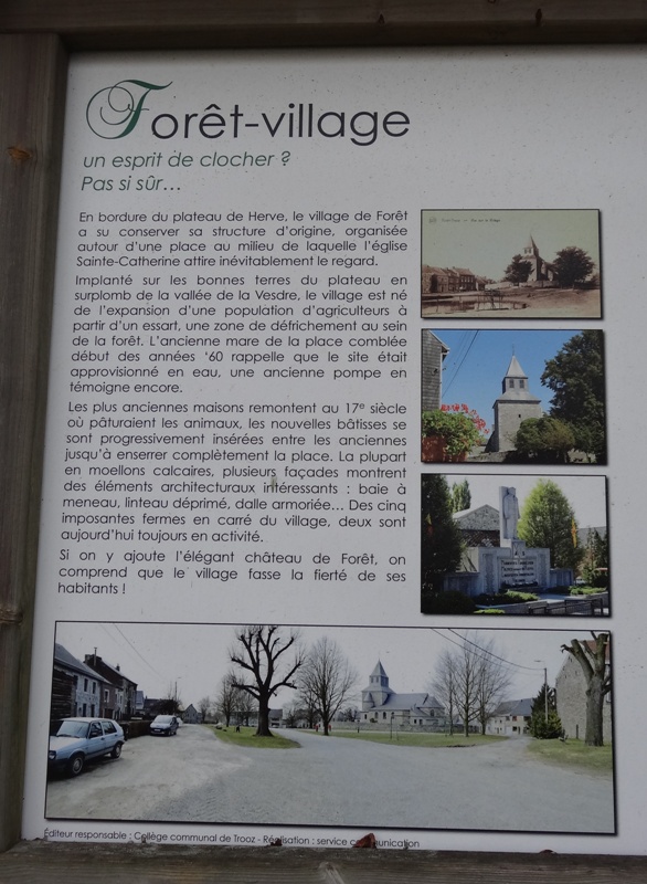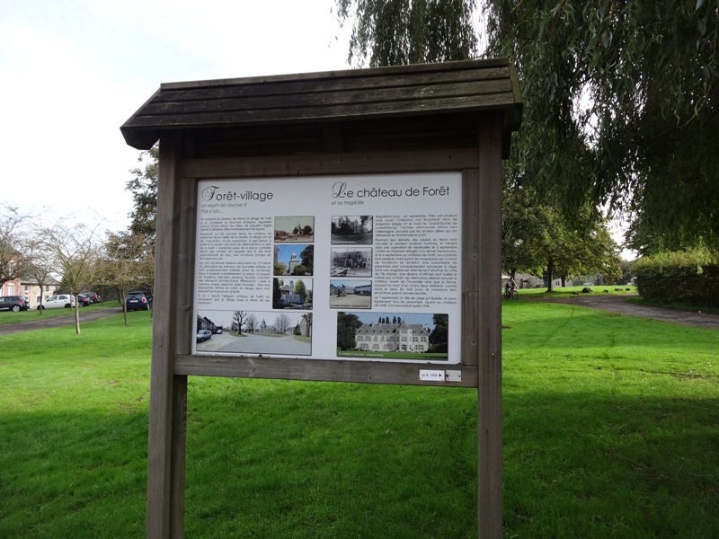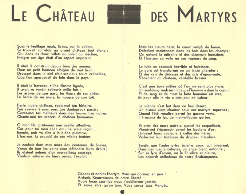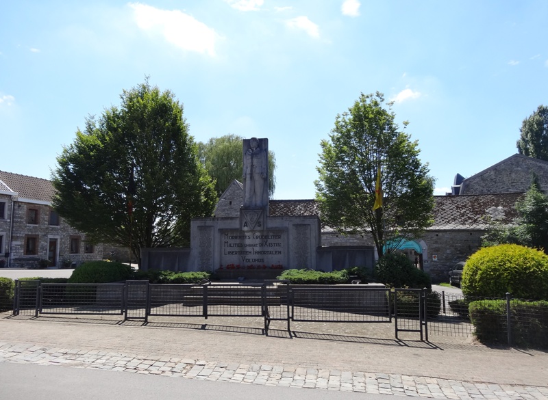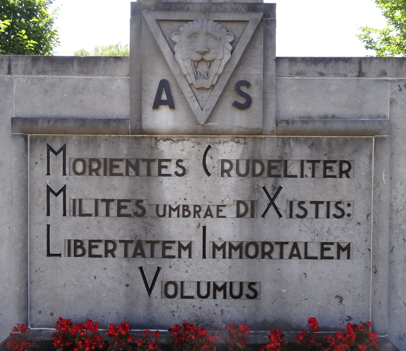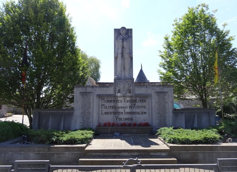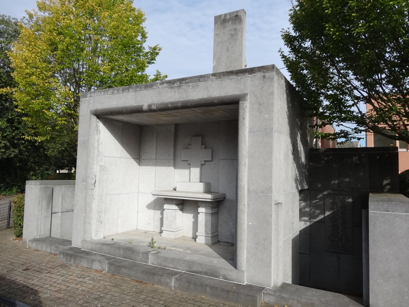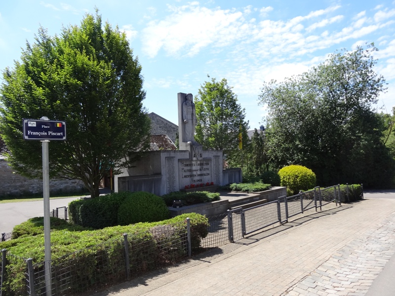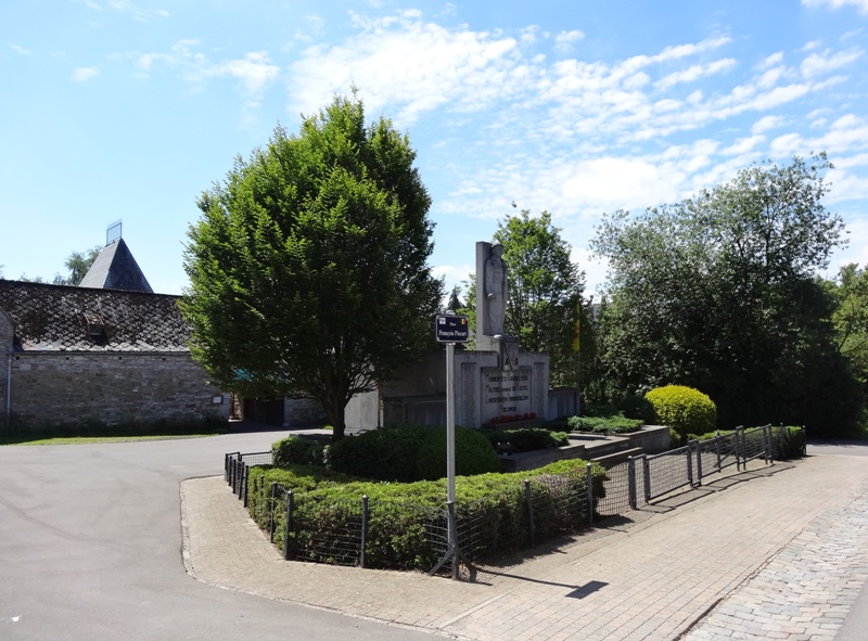 Localisation: Place François Piscart, le long de la Rue Forêt-Village. Coordonnées GPS: +50°35'01.10", +5°41'53.82" Inscriptions À l'avant du monument Partie centrale "AS MORIENTES CRUDELITER MILITES UMBRAE DIXISTIS LIBERTATEM IMMORTALEM VOLUMUS Ce qui signifie: EN MOURANT D'UNE MANIÈRE CRUELLE SOLDATS DE L'OMBRE, VOUS AVEZ DIT: NOUS VOULONS UNE LIBERTÉ IMMORTELLE" Plaque à gauche "[Trente-cinq noms, classés par ordre alphabétique]" Plaque à droite "[Vingt-deux noms, classés par ordre alphabétique] DISPARUS [Onze noms, classés par ordre alphabétique]" Petite plaque en marbre posée devant le monument "UNE PENSÉE CHAQUE JOUR À NOS COMPAGNONS ET AMIS DE COMBAT JEAN STINE MARIE COURTOIS" À l'arrière du monument Plaque de gauche "[Vingt-huit noms, classés par ordre alphabétique sauf un]" Plaque dans la crypte "ICI REPOSENT ONZE MAQUISARDS A.S. NON IDENTIFIÉS MORTS POUR LA PATRIE ET LA LIBERTÉ" Plaque de droite "[Vingt-sept noms, classés par ordre alphabétique sauf un]" Informations complémentaires En septembre 1944, alors que la Belgique est en train d'être libérée par les forces alliées, les nazis se livrent à de dernières atrocités. Une politique de terre brûlée dont les civils seront les principales victimes. Le village de Forêt, en province de Liège, aux abords du plateau de Herve, va être le lieu de l'un de ces actes terroristes. Un groupe de résistants de l'Armée Secrète, dont le quartier général se trouve dans les murs du château de Forêt, va faire l'objet de terribles représailles au mépris de toutes les règles de la guerre. Le monument rappelle les événements des 5 et 6 septembre 1944 et fut bâti en mai 1949 par l'architecte Joseph GODRON, l'entrepreneur L. GODRON, le tailleur de pierre J. LEDUC et Robert MASSART, un artiste de chez nous. Le monument-crypte fut conçu pour recevoir les corps des 11 résistants qui n'ont pu être identifiés et est un hommage aux combattants du C.T. Il a été inauguré le 4 septembre 1949. L'imposante statue qui domine le monument représente un maquisard debout et vêtu de l’uniforme salopette de l’A.S. Classement : 4 mai 1983 (Source [364]) Pour en savoir plus sur les événements tragiques de septembre 44 à Forêt La vérité sur la tragédie de Forêt et Travail de fin d'études primaires de Jérôme HALBOISTER Par ailleurs, on trouve, dans le cimetière communal à côté de l'église Sainte-Catherine, la sépulture d'un soldat de 1914-1918. Son nom a été ajouté dans la base de données Voir les noms mentionnés sur ce monument et sur la tombe individuelle |