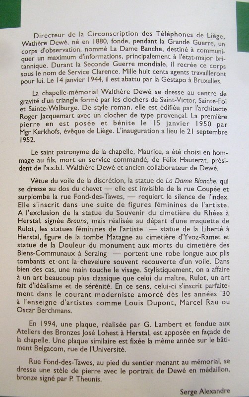 Localisation de cette chapelle: Chapelle Saint-Maurice "Mémorial Walthère Dewé", Rue Coupée (entre le Boulevard Hector Denis et la Rue Fond des Tawes). Coordonnées GPS: +50°39'28.41", +5°34'57.45". Inscriptions figurant sur la chapelle Plaque en bronze à gauche de l'entrée "AU LIÉGEOIS WALTHÈRE DEWÉ DIRECTEUR DES T.T. GRAND RÉSISTANT CHEF DU RÉSEAU DE RENSEIGNEMENTS LA DAME BLANCHE (1914-1918) ET DU SERVICE CLARENCE (1940-1945) ABATTU LE 14 JANVIER 1944 PASSANT, NE L'OUBLIE PAS !" Pierre de taille en bas à droite de l'entrée "EN SOUVENIR DE WALTHÈRE DEWÉ MORT EN HÉROS LE 14 JANVIER 1944" Architecte de la chapelle: R. JACQUEMART Réalisation de la plaque: G. LAMBERT en 1994 Fabrication de la plaque: Ateliers des Bronzes José LHOEST à Herstal, LG, BE Plus d'informations concernant cette chapelle: La chapelle Dewé et Cérémonie "Walthère Dewé" 13-01-2012 Plus d'informations concernant cette personne |