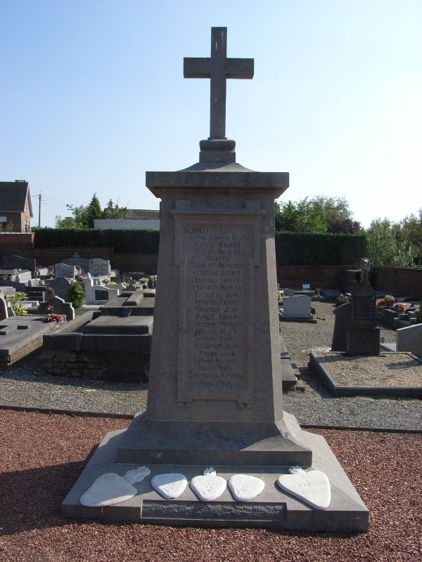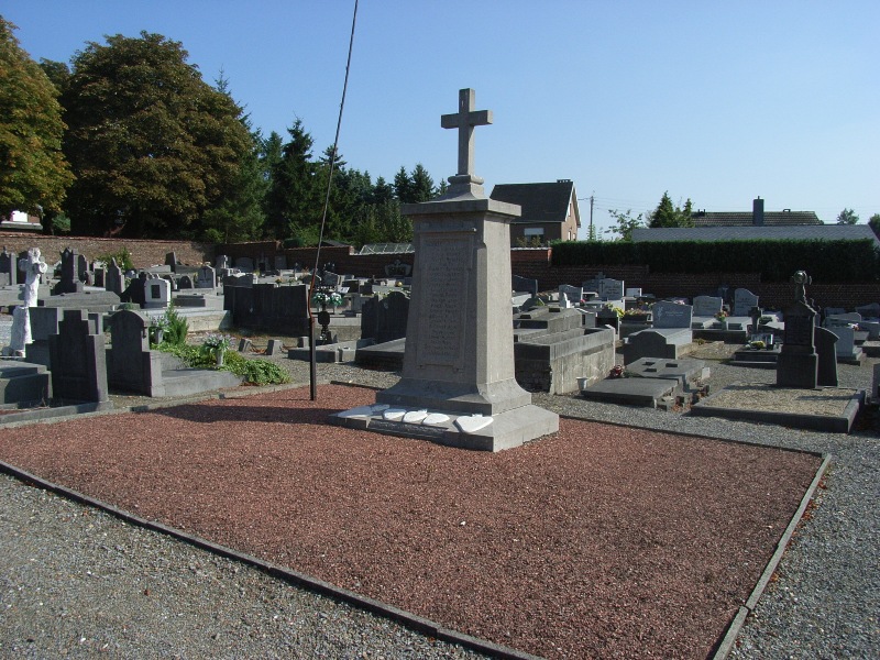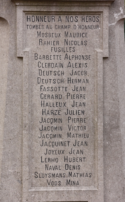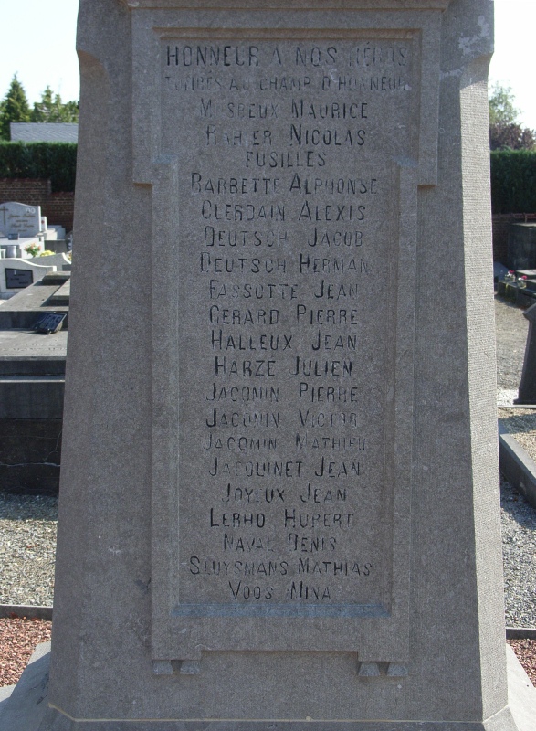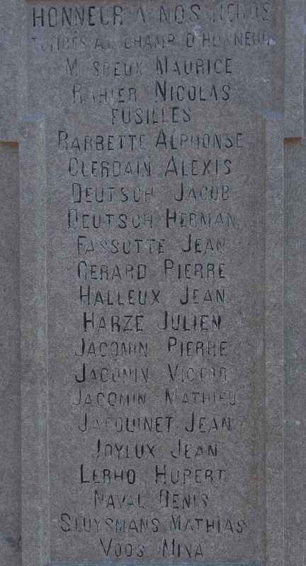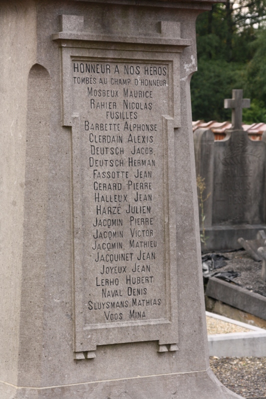 Localisation de ce monument et de cette tombe: Rue Fonds de Forêt, dans le cimetière communal. Coordonnées GPS: +50°36'00.43", +5°41'14.54" Inscriptions figurant sur le monument "HONNEUR À NOS HÉROS TOMBÉS AU CHAMP D'HONNEUR [Deux noms, classés par ordre alphabétique] FUSILLÉS [Dix-sept noms, classés par ordre alphabétique]" Informations complémentaires: Architecte: N. RAHIER; Entrepreneur: E. BECKERS. Matériau: petit granit; Hauteur : 3 m. Non signé. Comité « Rappelle-toi » de Micheroux-Soumagne. Inauguré probablement fin 1924 – début 1925. Simple croix de pierre posée sur un haut socle (Source [276]) De plus, on trouve, dans ce cimetière, la tombe d'une victime de la guerre 1940 - 1945. Son nom a été ajouté dans la base de données. Voir les noms mentionnés sur ce monument |