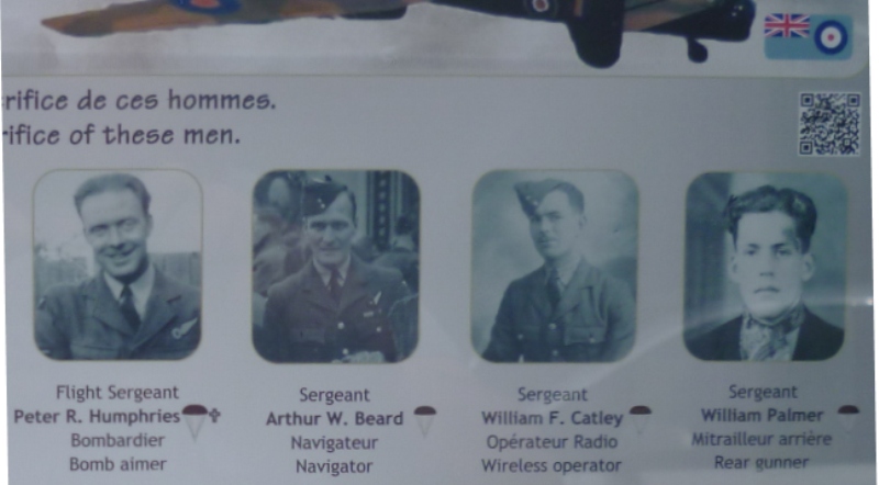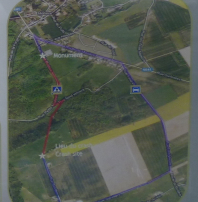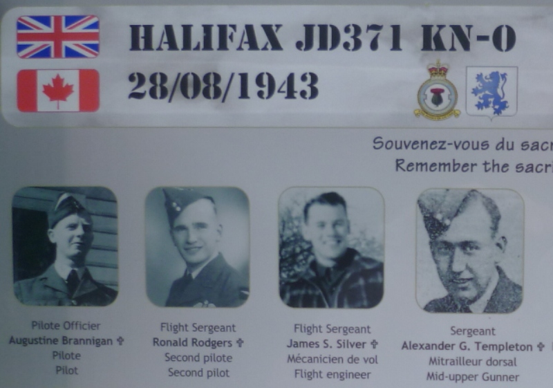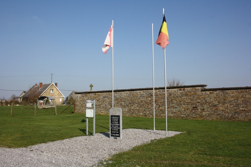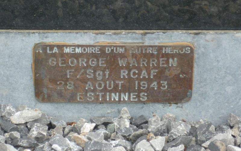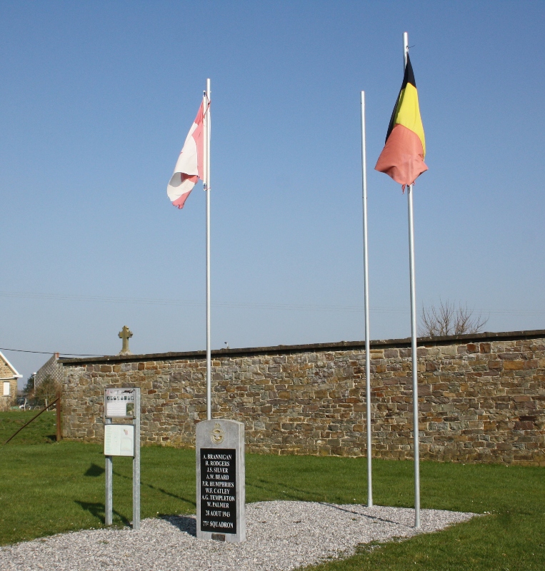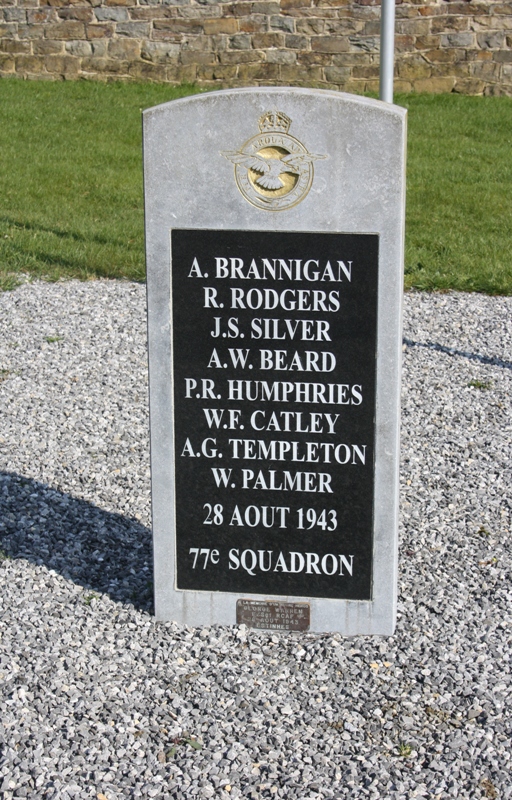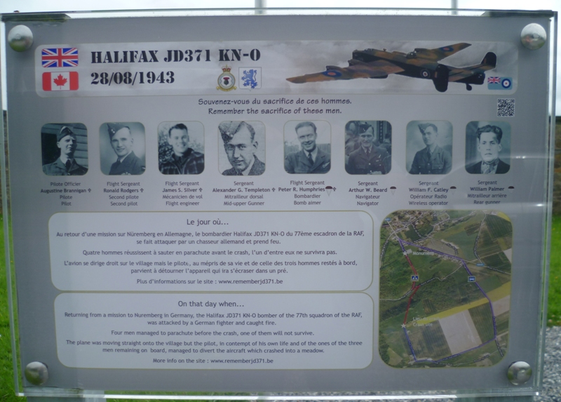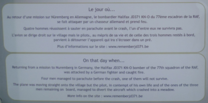 Localisation de ce monument: Rue Petite Modave, sur la pelouse devant le cimetière communal. Coordonnées GPS: +50°26'20.57", +5°18'02.80" Inscriptions figurant sur le monument: "[Huit noms, non classés par ordre alphabétique] 28 AOÛT 1943 77E SQUADRON" Sur une plaque en bronze fixée au pied de la stèle "À LA MÉMOIRE D'UN AUTRE HÉROS GEORGE WARREN F/SGT RCAF 28 AOÛT 1943 ESTINNES" Informations complémentaires: Au retour d’une mission sur Nüremberg en Allemagne, le bombardier Halifax JD371 KN-O du 77ème escadron de la RAF, se fait attaquer par un chasseur allemand et prend feu. Quatre hommes réussissent à sauter en parachute avant le crash, l’un d’entre eux ne survivra pas. L’avion se dirige droit sur le village mais le pilote, au mépris de sa vie et de celle des trois hommes restés à bord, parvient à détourner l'appareil qui ira s'écraser dans un pré. Il existe, à quelques centaines de mètres de ce monument, un autre monument commémorant cet évènement (voir Belmemorial) Il est situé à l'endroit exact où l'avion s'est crashé (voir le plan sur le panneau à côté du monument - dernière photo ci-dessous) Voir les noms mentionnés sur ce monument |